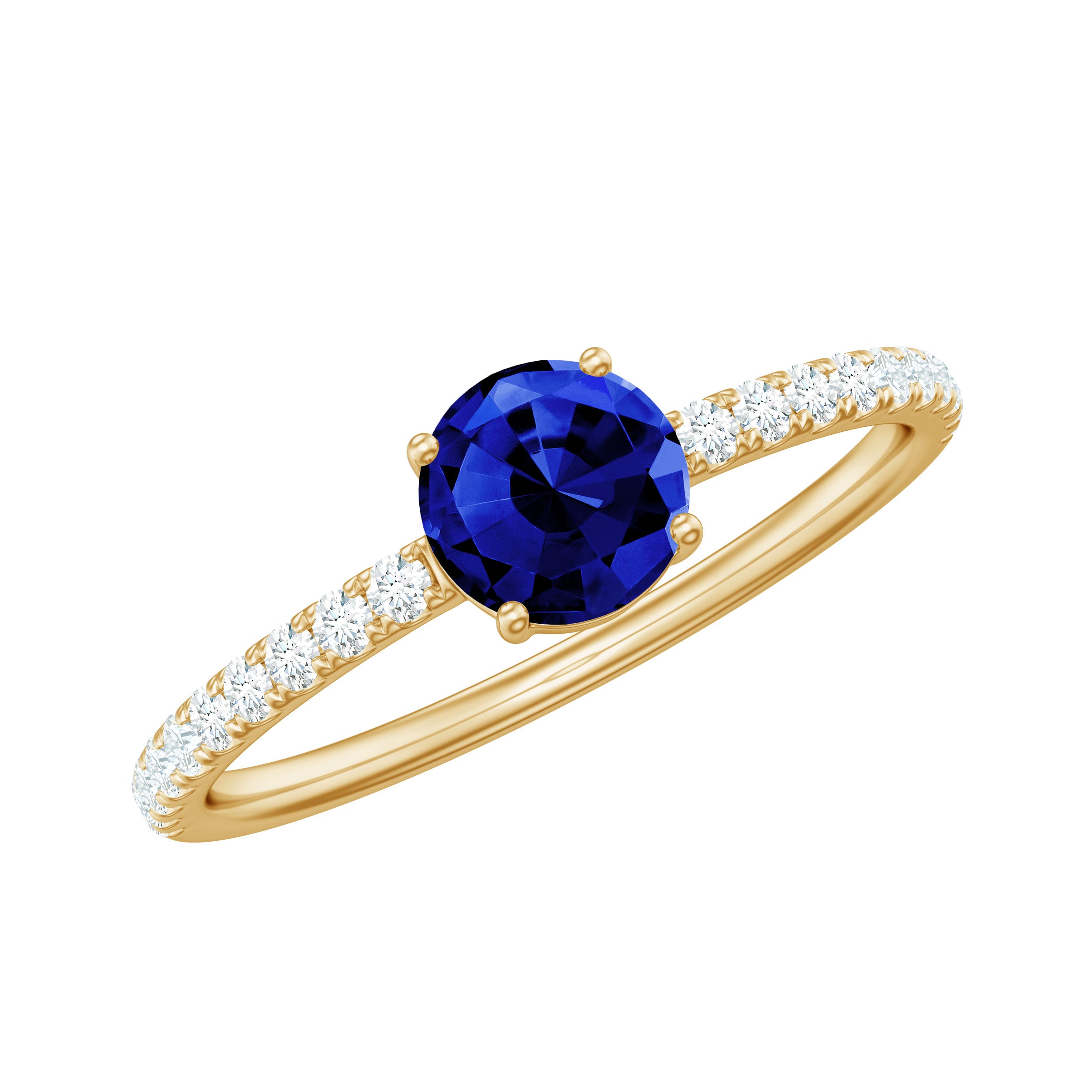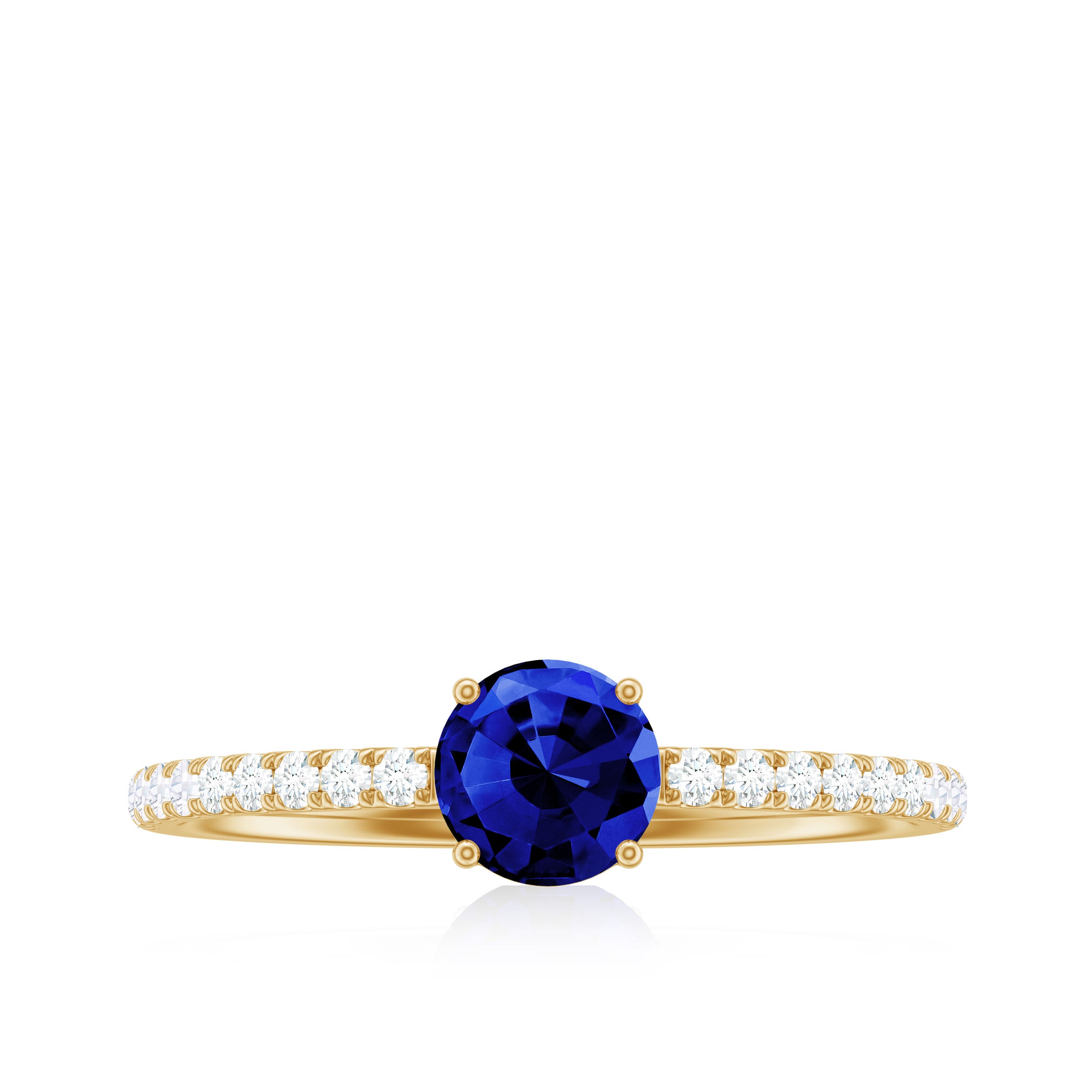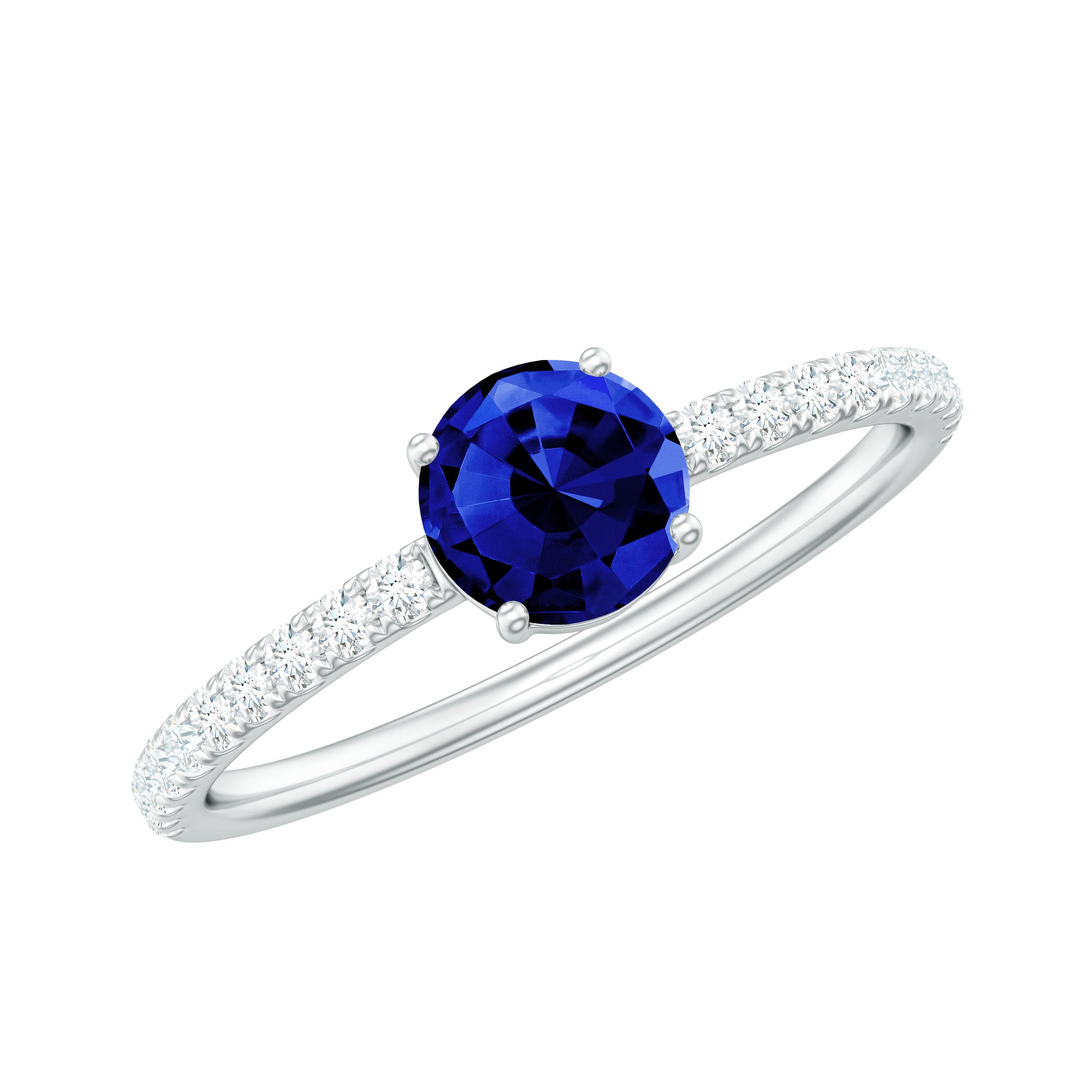 Dress up or dress down, a Solitaire Promise Ring always looks great. This Commitment Ring embellished with 5mm Round Shape Lab Created Blue Sapphire set at the center as solitaire in a prong setting with Diamond Side Stones, adding extra sparkle to the piece. This Solitaire Ring with Side Stones carries AAAA quality Lab Created Blue Sapphire with HI-SI quality Diamonds. This Lab Created Blue Sapphire Ring has the same brilliance as the natural gemstone at an affordable price. The pairing of Lab Created Blue Sapphire with the dazzling white brilliance of Natural Diamond gemstones produces a remarkable contrast of color and sparkle. With each look, this Created Sapphire Ring seizes the moment, attracting attention with its beauty and luminosity. Meticulously designed, this Pre Engagement Ring symbolizes love, commitment, and the start of eternity.