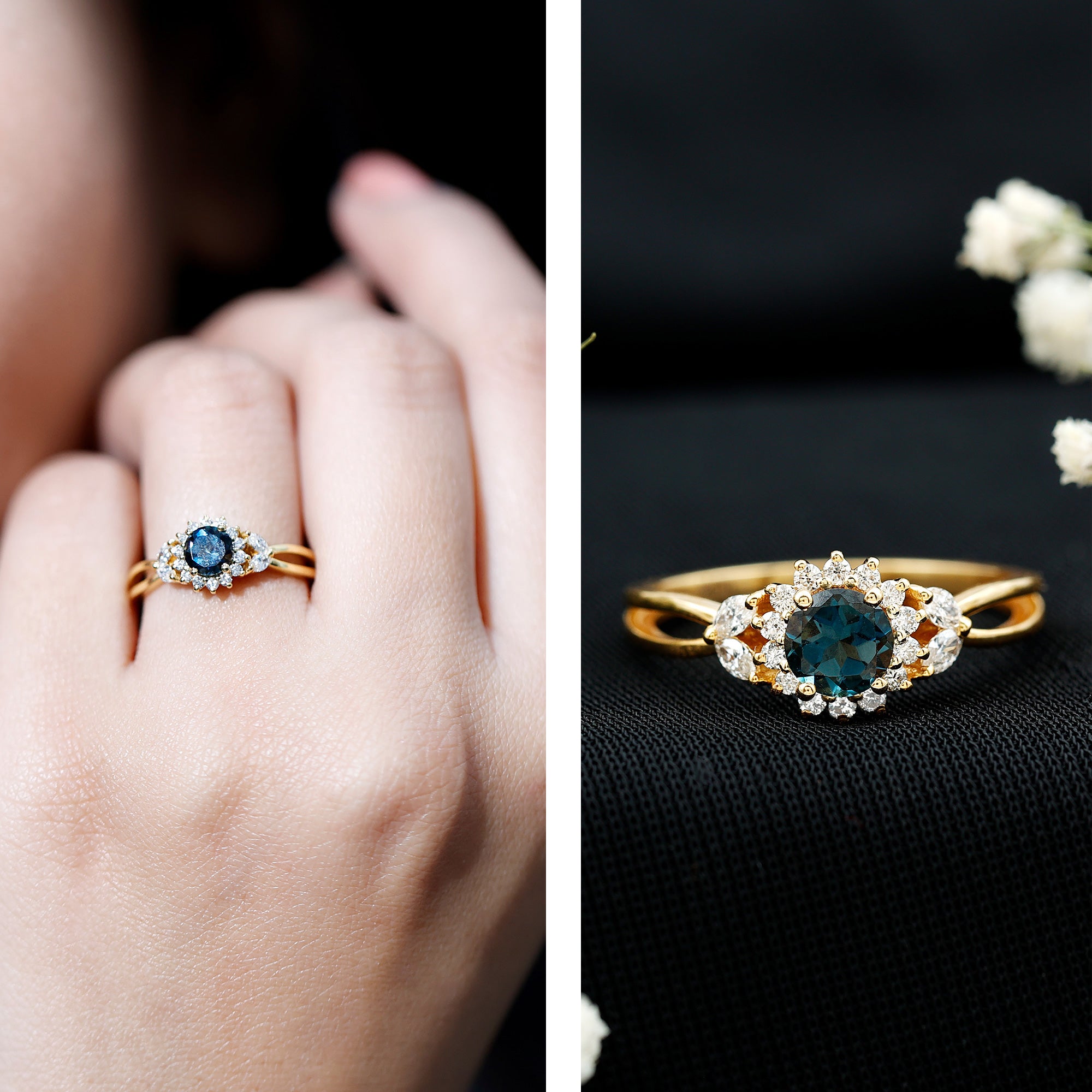 Allow your affection to flourish with this exquisitely designed Flower Engagement Ring, a captivating piece inspired by the beauty of nature and filled with genuine sparkle. At the heart of the design lies a delicate arrangement of 5 mm round-shaped London Blue Topaz surrounded with round shape Diamonds, set in a floral motif that represents new beginnings and the blossoming of love. Two marquise shape diamonds set on both sides like a petal style, add more charm to the ring. London Blue Topaz stone boasts AAA quality and Diamonds having HI-SI quality, providing a brilliant sparkle that illuminates the entire Floral Ring. Enhancing its allure is the split style band, which adds a hint of modern sophistication and unique texture. This subtle feature imparts a handcrafted essence to the London Blue Topaz Engagement Ring, distinguishing it from conventional designs. The halo style also offers a larger, more striking appearance while ensuring the ring remains lightweight and comfortable for daily wear. Meticulously crafted for those who appreciate beauty and significance, this Blue Topaz Flower Ring is an exquisite option for proposals, anniversaries, or even a meaningful self-love gift. It is available in a variety of metal colors and purity options and is presented in an elegant jewelry box, ready for gifting or personal enjoyment. Romantic, elegant, and refreshingly unique, this Womens Engagement Ring is designed for the individual who believes in love that deepens over time, much like a flourishing garden.
