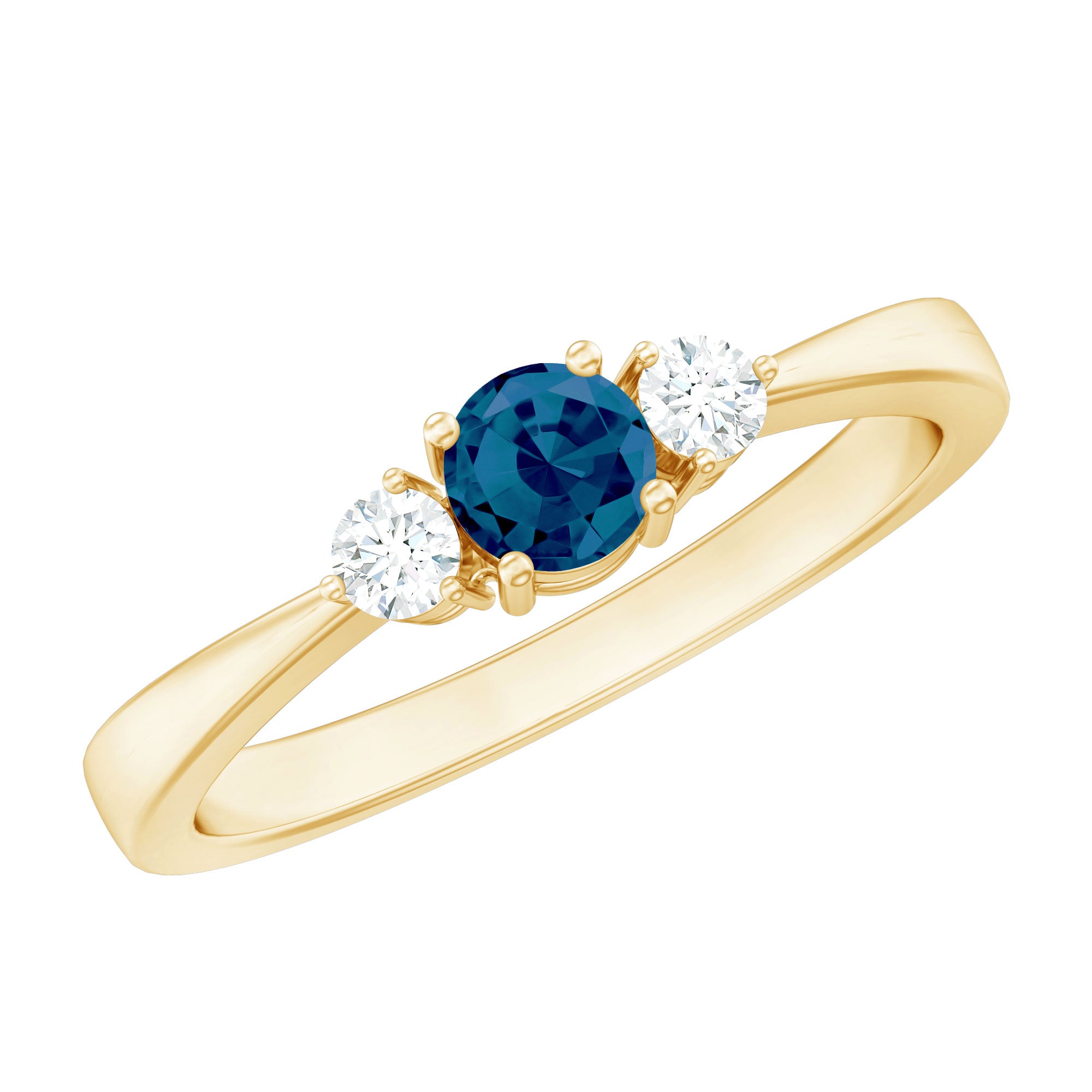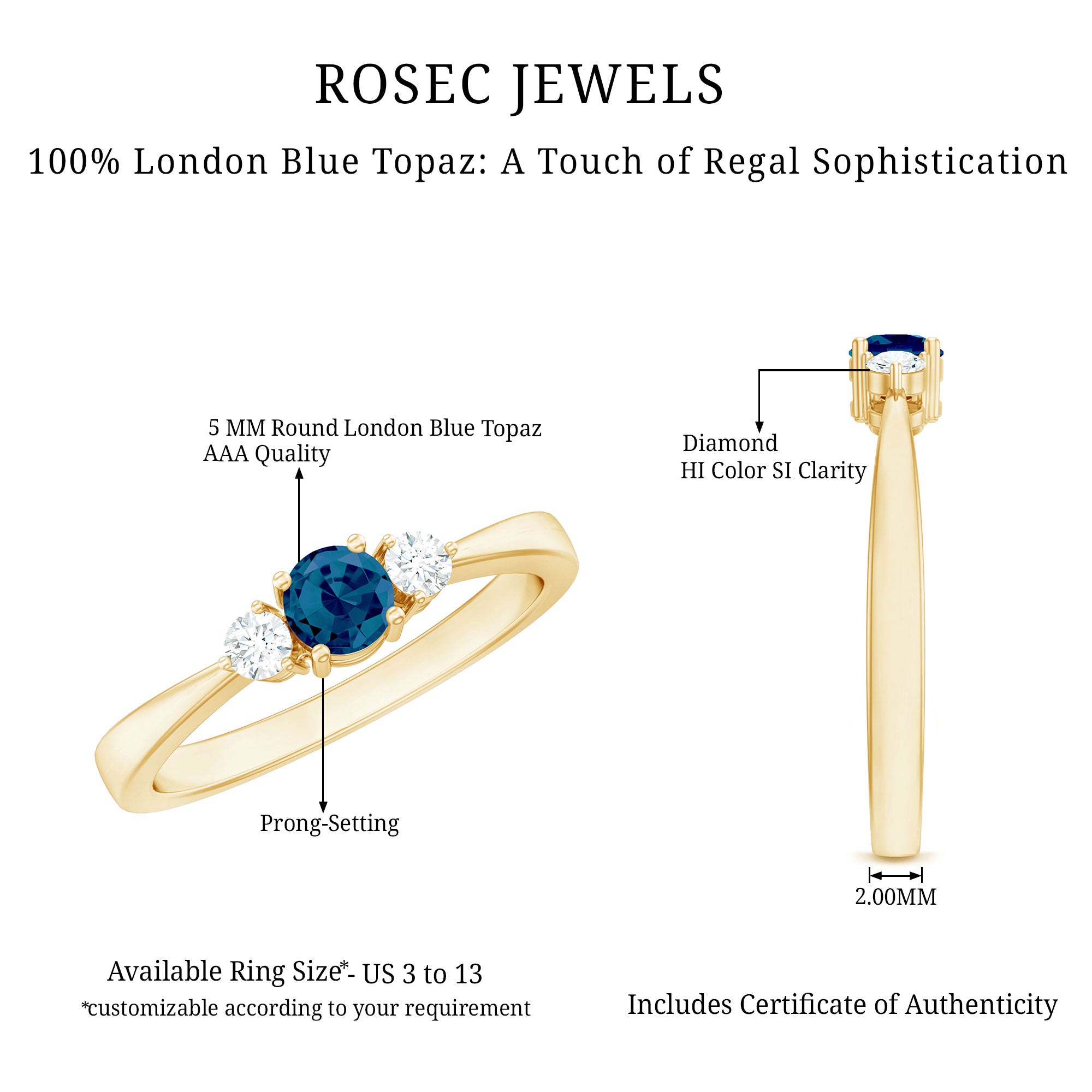 Crafted to honor a sincere commitment, this Blue Topaz Promise Ring embodies the essence of loyalty, love, and connection in a sophisticated and graceful manner. At its core lies a round shape London Blue Topaz, securely held in a prong setting. Two small round diamond accents set on both sides of the center blue topaz stones, meticulously arranged to impart a gentle, luminous glow. The juxtaposition of the dark center against the shimmering white stones creates a timeless appearance infused with contemporary allure. Whether you are commemorating a promise, celebrating a personal achievement, or simply seeking a ring with profound significance, this design conveys a message of understated elegance. The minimalist silhouette of this Dainty Promise Ring for Her allows for effortless wear alone or in combination with other jewelry, while its thoughtful design guarantees it remains distinctive in a subtle manner. Constructed with AAA quality london blue topaz and HI-SI quality diamonds, each component is crafted with meticulous attention to detail. Offered in a broad array of sizes, this Blue Topaz and Diamond Ring makes it simple to discover the perfect fit. The Commitment Ring is presented in an exquisite jewelry box and includes a gemstone certificate for additional reassurance. Fashionable and meaningful, this Pre Engagement Ring serves as a lasting reminder of a relationship founded on trust, love, and shared experiences, making it ideal for gifting or cherishing close to your heart.