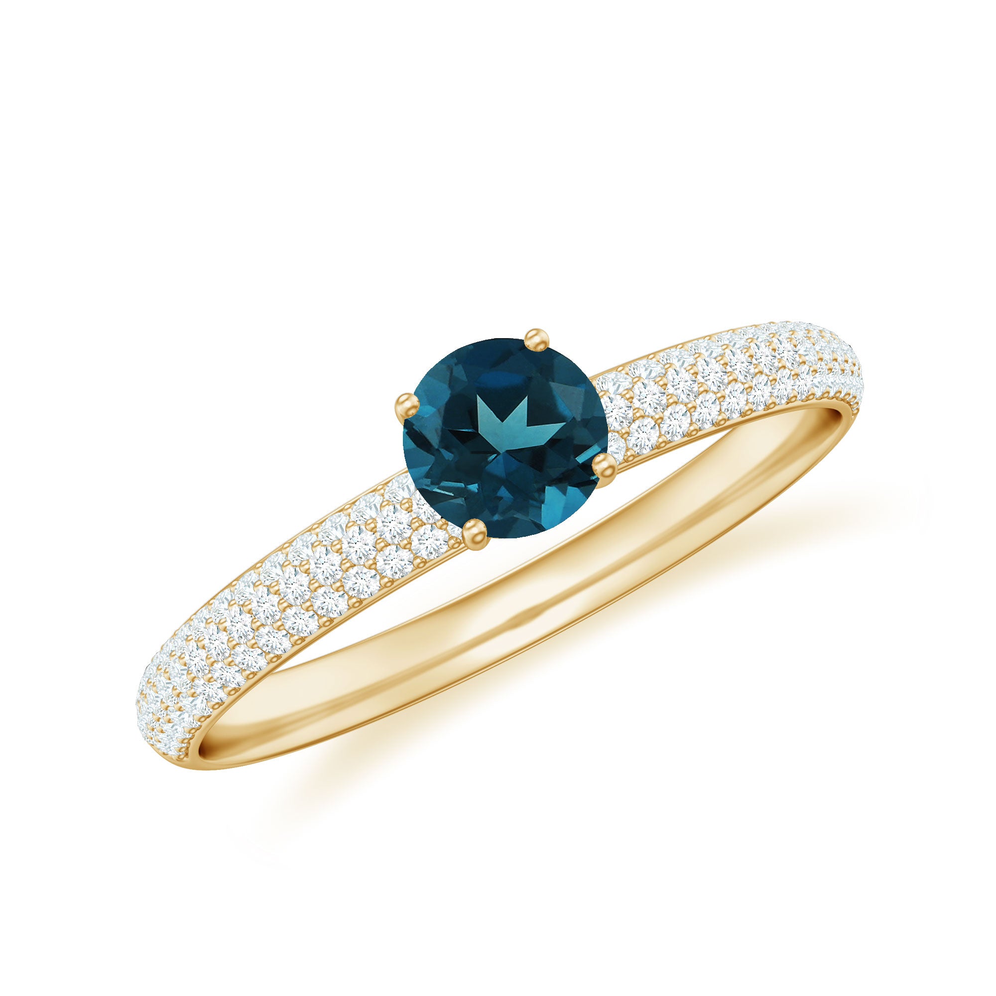 Crafted to honor your most treasured moments, this Solitaire Promise Ring exudes contemporary elegance. At its core lies a breathtaking 5 MM round shaped London Blue Topaz, securely set in a prong setting, renowned for its remarkable brilliance and enchanting sparkle. Surrounding this focal point are exquisite pave set side Diamond stones, carefully selected for their HI color and SI clarity, designed to reflect light from every angle and celebrate your love with unmatched radiance. Presented in an elegant jewelry box, this London Blue Topaz Ring is poised to create lasting memories, whether for a surprise proposal, an anniversary celebration, or any special occasion that requires a hint of extra sparkle. Expertly crafted, this Blue Topaz Solitaire Ring features side stones that beautifully enhance the central stone, infusing a sense of sophistication and elevating its overall allure. Let this stunning London Blue Topaz Promise Ring serve as the luminous symbol of your shared journey, a piece that will continue to shine with your love for many years to come.