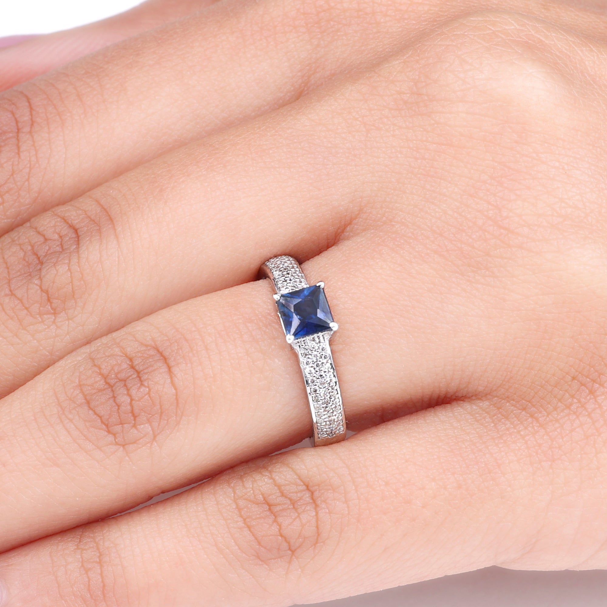 5mm Princess Cut Lab Created Blue Sapphire Promise Ring with Diamond