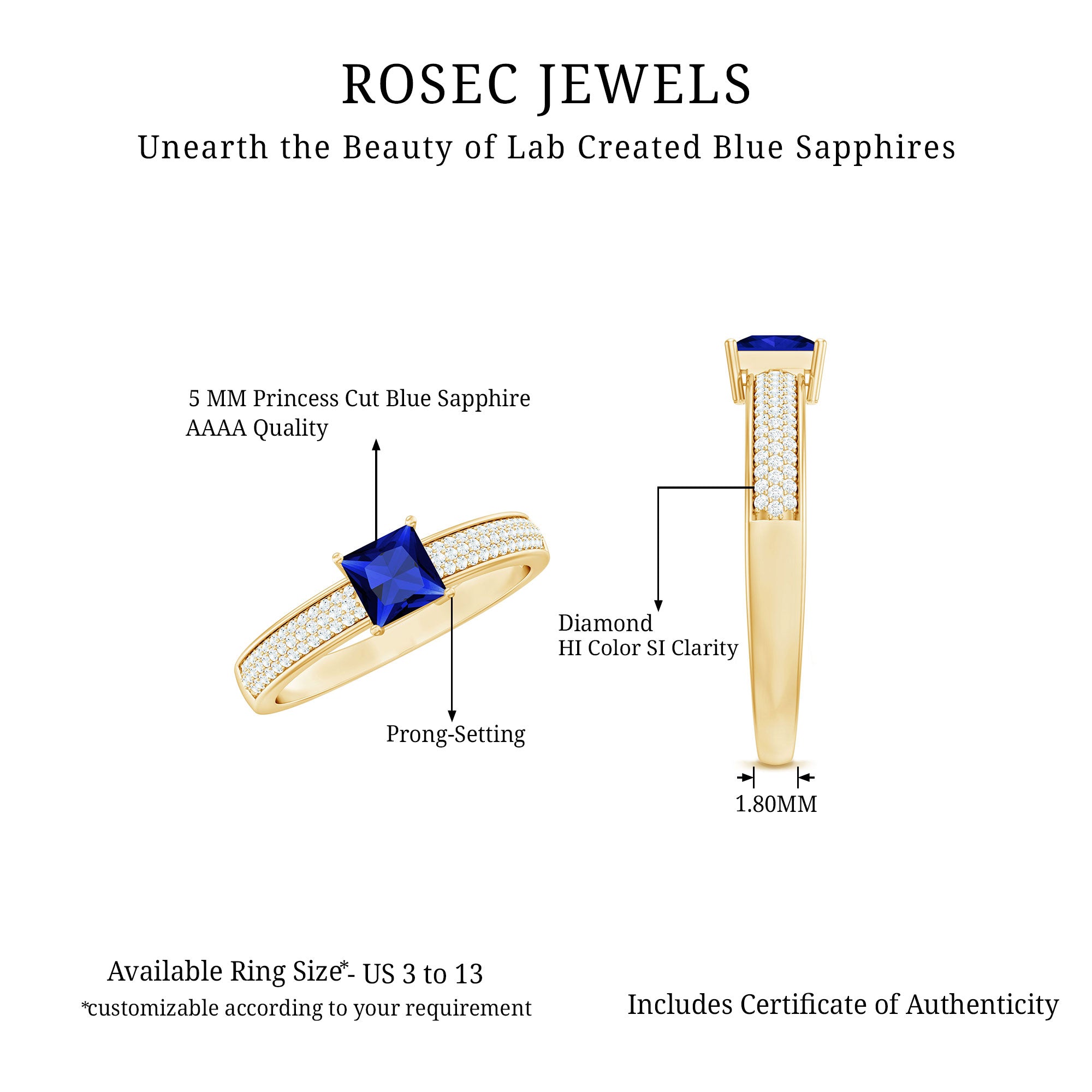 The Rosec Jewels Created Sapphire Engagement Ring is a remarkable creation, designed for an individual who merits only the finest. At its core lies an 5 MM Princess Cut Lab Created Blue Sapphire, held securely by a prong setting and accentuated by smaller round shape Diamonds that tenderly surround the main stone. With its whimsical yet profound symbolism, this Princess Cut Engagement Ring elegantly embodies your unique relationship and narrates your love story. The primary stone is a AAAA Quality Lab created blue sapphire with HI-SI quality Diamonds, exhibiting exceptional clarity and brilliance, serving as a perfect emblem of eternal love. Much like your connection, this Lab Created Blue Sapphire Ring is both resilient and exquisite, making it an ideal selection for a proposal or as a representation of your lasting bond, celebrating your shared journey and allowing you to radiate with clarity. Meticulously crafted, this Classic Engagement Ring glimmers with complementary accents that enhance the allure of the centerpiece, adding a hint of sophistication. This ring is a timeless treasure that recounts your love story in an unforgettable manner. Allow this exquisite piece to be the luminous symbol of your collective journey, destined to be treasured for a lifetime.