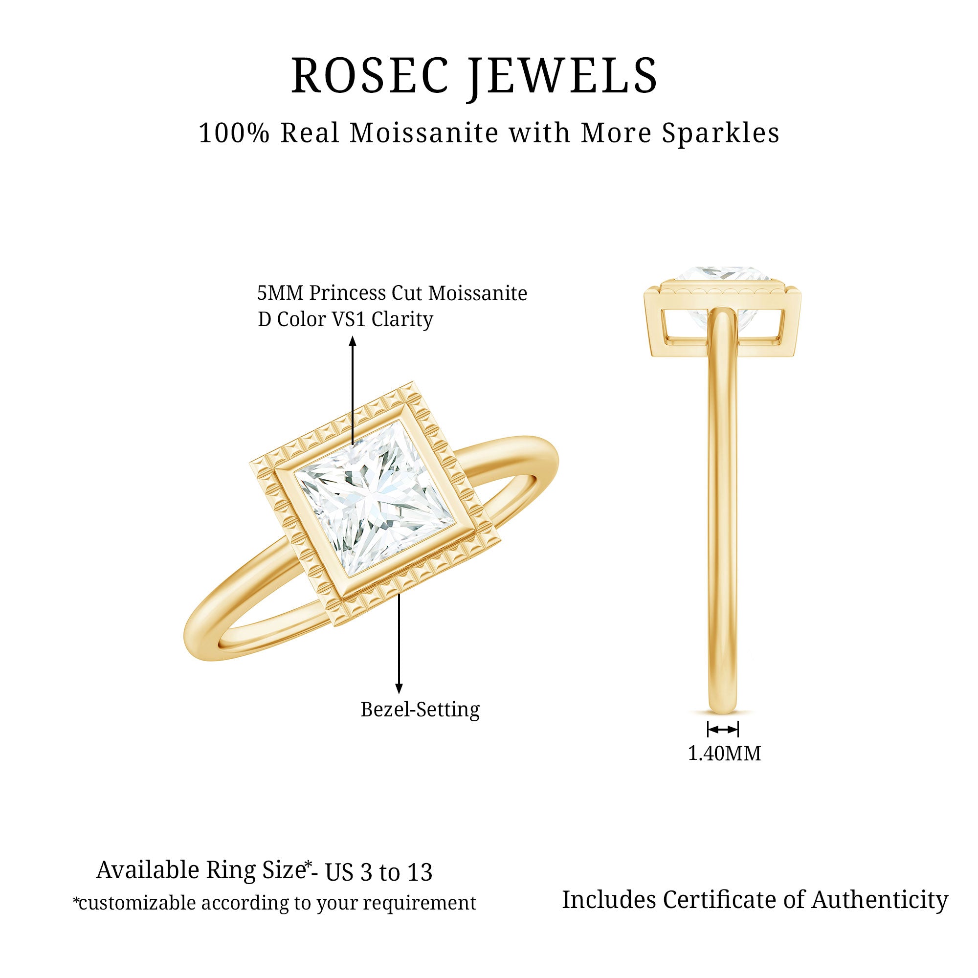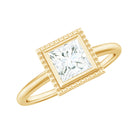 The Bezel Engagement Ring combines historic sensibility with modern and thoughtful details. This Solitaire Ring embellished with 5mm princess cut Moissanite set at the center as solitaire in a bezel setting surrounded with engraved style frame. These fascinating Princess Cut Moissanite Ring shine through your fingers. Having a mesmerizing appearance, this Moissanite Solitaire Ring have a unique shape which is beautiful and enthralling, making it so uniquely offering timeless elegance for everyday wear or by adding a touch of glamour for special events. Having a mesmerizing beauty, this Single Stone Ring has a mesmerizing beauty with exquisite craftsmanship that would ignite your style with fiery style. Having a unique beauty, This Princess Cut Solitaire Ring bring a sense of warmth and energy to the wearer.