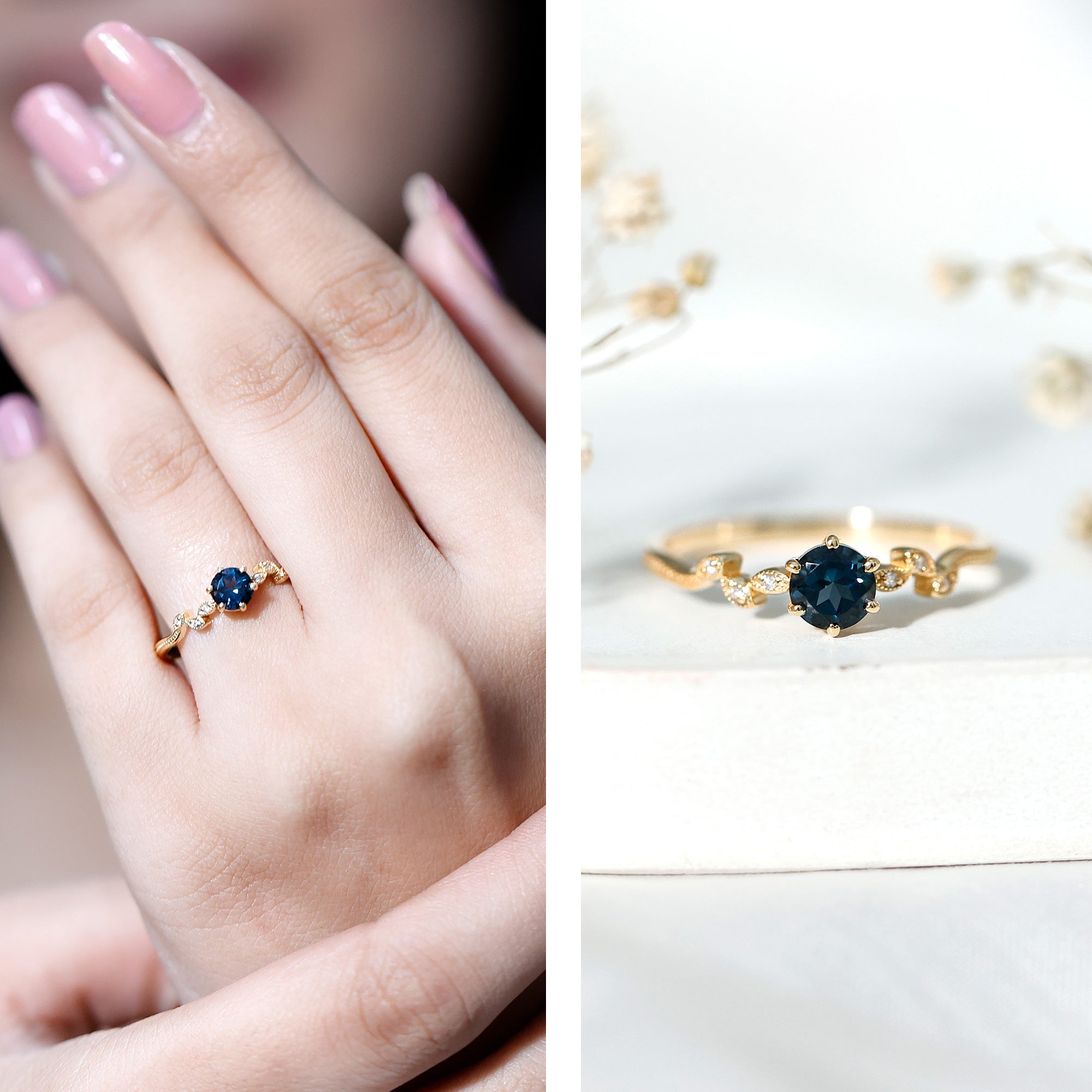 Symbolizing eternal commitment, this London Blue Topaz Promise Ring embodies the grandeur of nature, resulting in a stunning piece of jewelry that presents a bold yet sophisticated appearance. Evoking both beauty and grace, this ring features a 5 mm Round Shaped London Blue Topaz set in a Prong Setting, complemented by scintillating Diamonds framed by a vine leaf design, which enhances its visual appeal. Drawing inspiration from vintage aesthetics, this Pre Engagement Ring showcases a band adorned with leaf and vine motifs along with round beaded accents. Opulent and rich, this Nature Inspired Real Blue Topaz and Diamond Ring captures a sense of beauty and elegance that is sure to attract attention. The AAA Quality London Blue Topaz and Hi-Si Diamonds exhibit remarkable brilliance, taking the spotlight. Whether celebrating a promise, an engagement, or as a gift for a December birthday, this ring is an exceptional choice for those who appreciate nature. Sufficiently simple for daily use yet intricate enough to evoke a sense of uniqueness, this London Blue Topaz Ring represents an ideal blend of beauty and affection. It is a delightful option for those who appreciate tradition, symbolism, and sophisticated design.