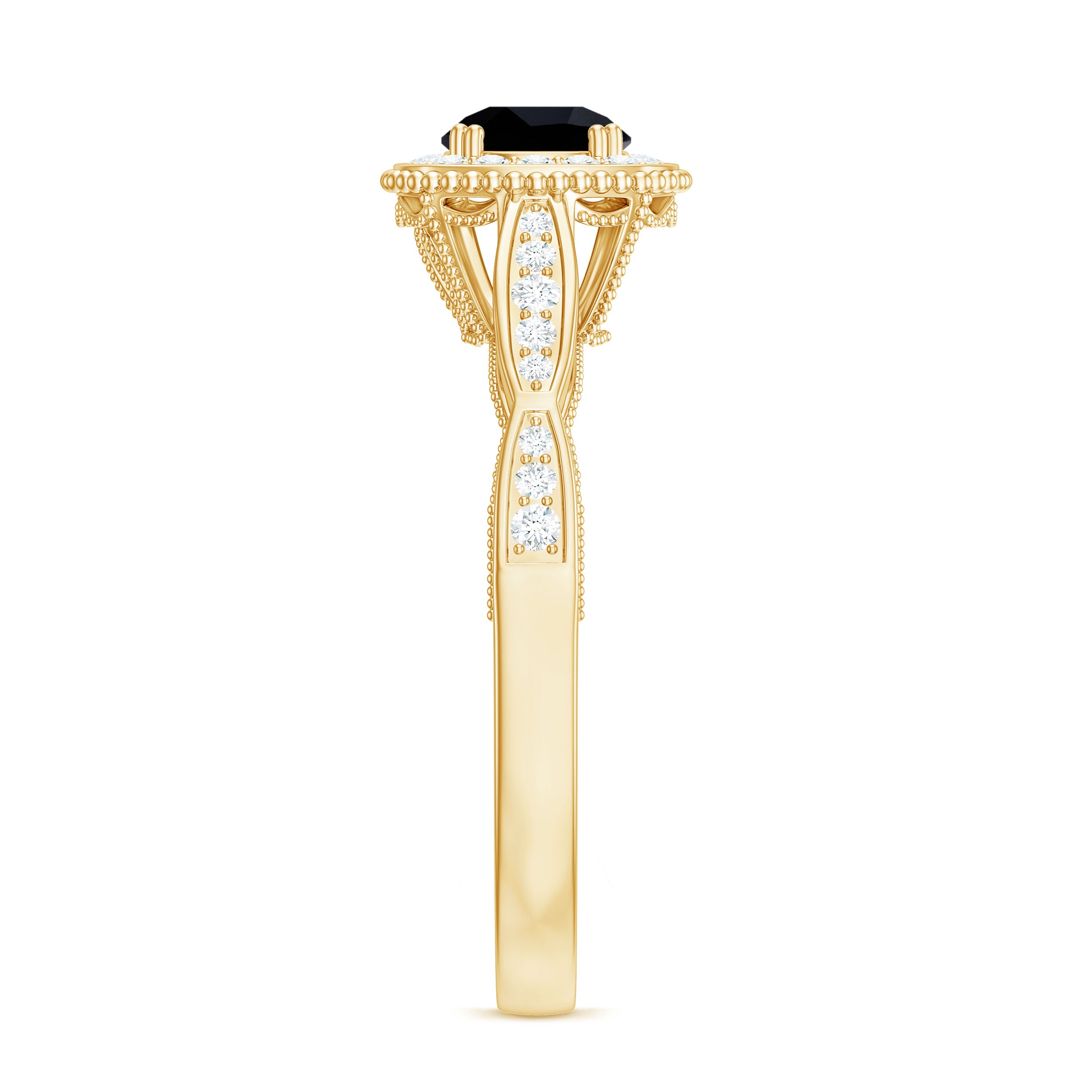 Experience the allure of timeless elegance with this exquisite Black Onyx Engagement Ring, which draws inspiration from vintage aesthetics and is designed to dazzle. At its core lies a 5MM round Black Onyx, meticulously set in a double prong setting that enables the stone to radiate brilliance from every perspective. Surrounded with round shape Diamond stones having delicate beaded details along the frame, imparting a distinctive and refined touch. Additional round diamond stones adorning the scalloped band enhances its luminosity, resulting in a soft, radiant appearance that is ideal for those who appreciate a blend of classic charm and contemporary sparkle. The design of this Halo Engagement Ring harmoniously merges traditional elegance with vintage appeal, serving as a significant emblem of love and devotion. Offered in various metal colors and purity levels, this piece can be tailored to reflect your individual style or to coordinate with other jewelry. A certificate of authenticity accompanies the Vintage Style Engagement Ring, ensuring the quality and craftsmanship of this remarkable piece. Elegant, luminous, and brimming with charm, this Antique Onyx Ring with accents encapsulates the essence of cherished moments with a style that endures.