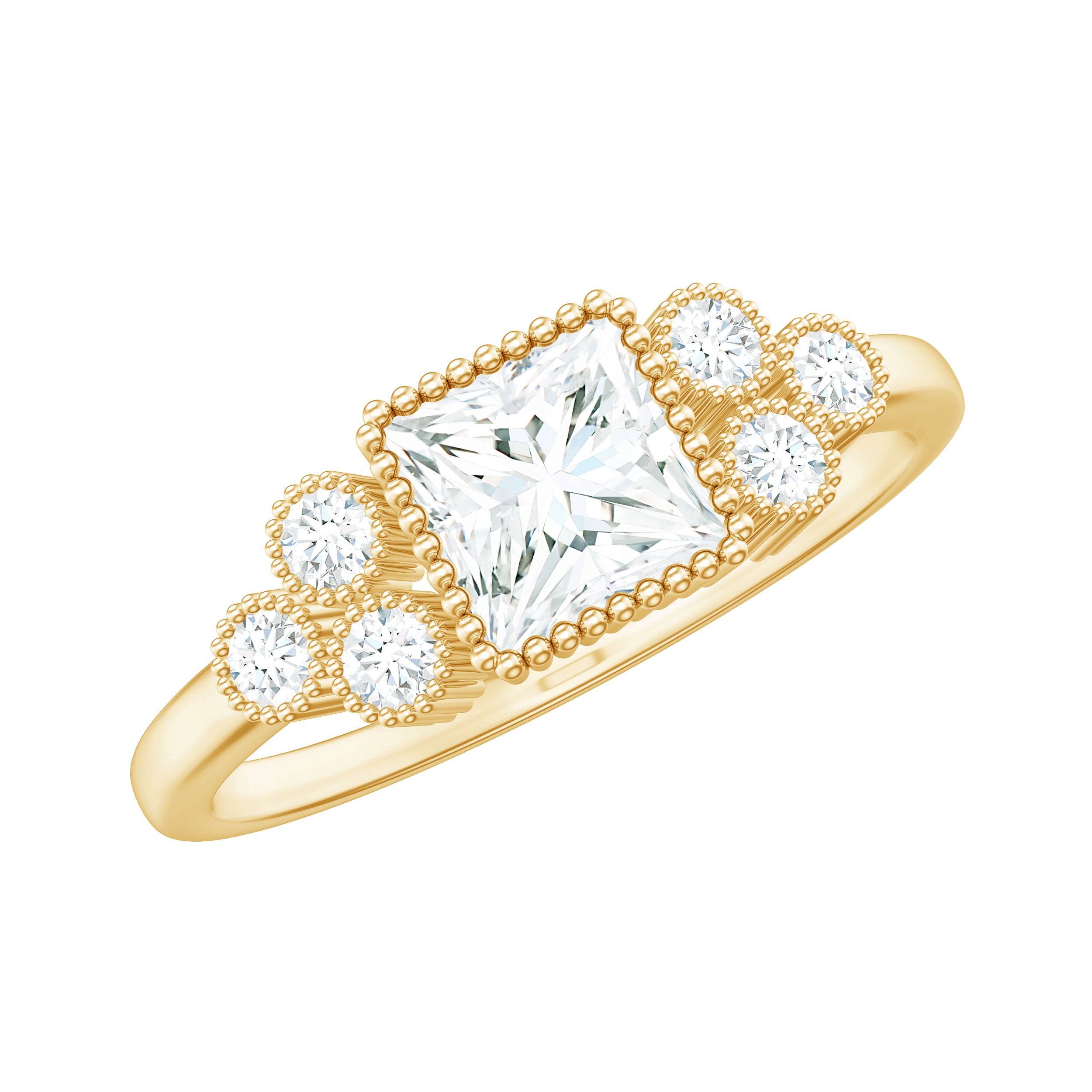 Celebrate love with timeless beauty in this stunning Moissanite Engagement Ring. Featuring a sparkling 5x5mm princess cut moissanite set at the center in a bezel setting accompanied with round moissanite trio on both sides, enhancing the brilliance of the ring. Crafted for special moments, this 1.25 Carat Moissanite Ring is a meaningful symbol of love, whether you are planning a proposal or marking an important milestone. The bezel setting not only adds a stylish touch but also keeps the stone safe and secure, perfect for everyday wear. With its D color and VS1 clarity, the moissanite sparkles beautifully, offering the brilliance of a diamond at a more affordable price. Packed in a beautiful jewelry box, this Princess Moissanite Ring is ready to gift or keep as a personal treasure. Whether it is for an engagement, anniversary, or a heartfelt surprise, this Moissanite Solitaire Ring is designed to make moments unforgettable. Simple, elegant, and full of charm, this Bezel Engagement Ring is a reflection of the love and memories youll cherish forever.