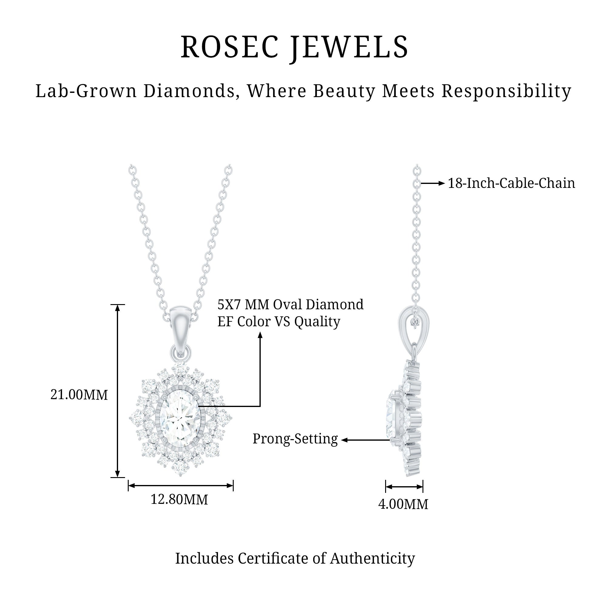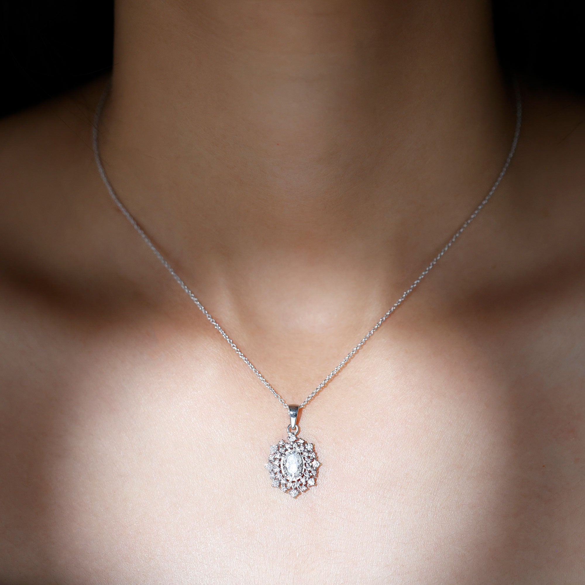 With the perfect blend of royal essence and modern style here is the Oval Diamond Necklace. This Statement Necklace from Rosec Jewels is handcrafted from a 5X7 MM Oval Shape Diamond securely placed in the Prong Setting. This Diamond Necklace Pendant is beautified with a Double Halo of Diamonds and Accented Bail. The Halo Diamond Pendant is perfect to dazzle the special occasions when paired with the bridal earrings. To make sure that your feelings and emotions attached to this Bridal Pendant Necklace is delivered securely to her, we send this pendant in the premium quality gift box.