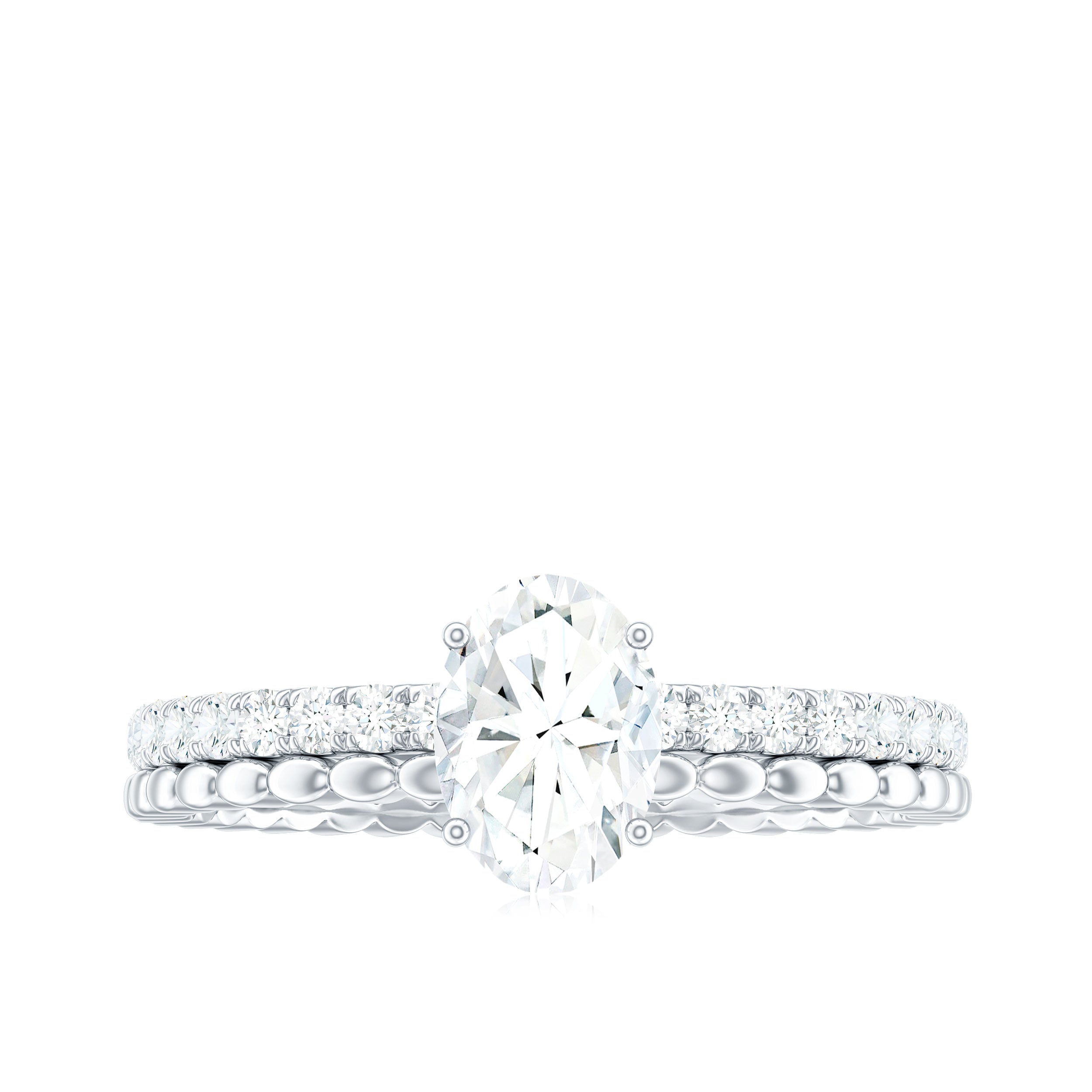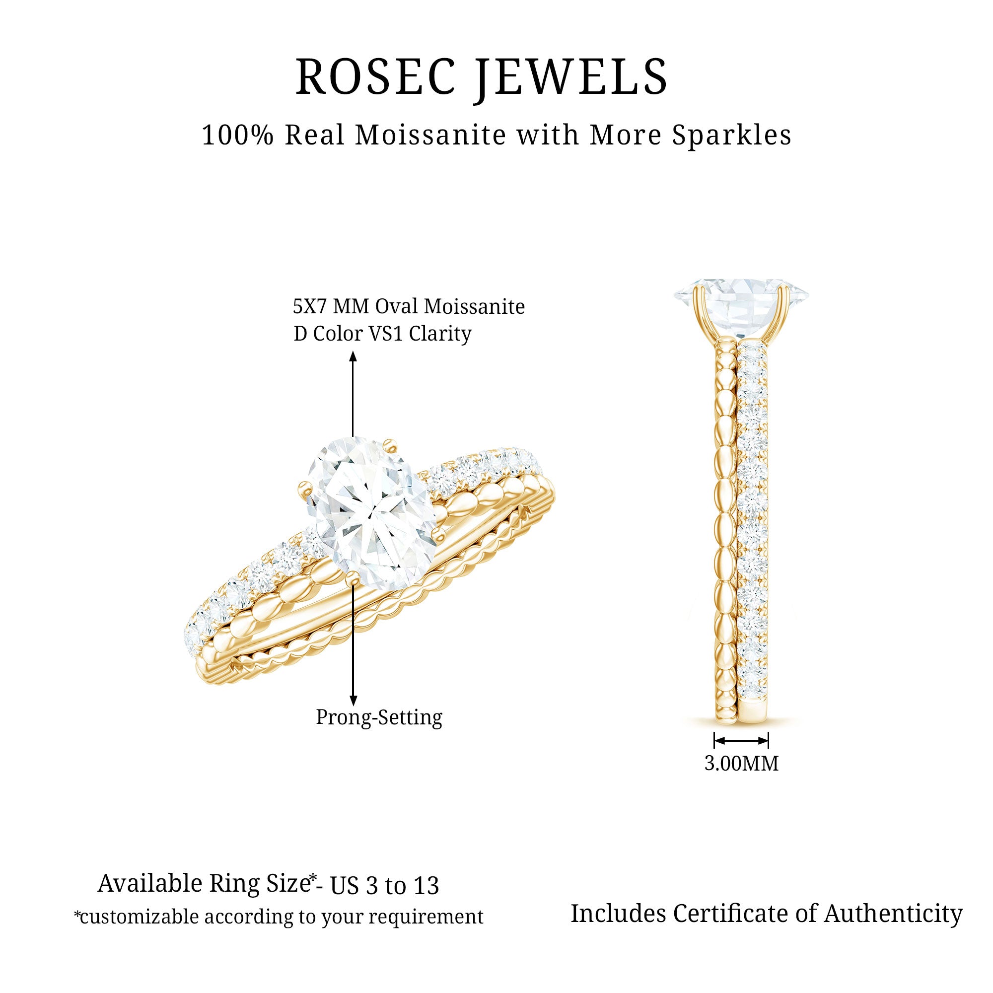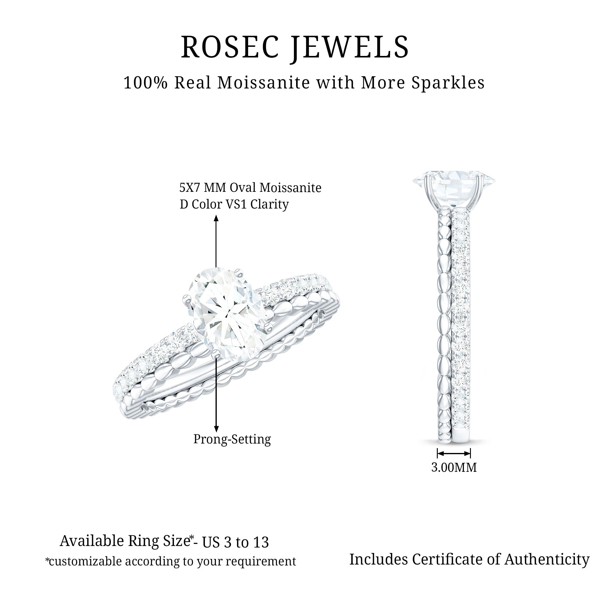 Seeking balance and harmony, this Moissanite Solitaire Ring has a stunning timeless style in your treasures. Having a unique eye-catching feature, this Solitaire Engagement Ring is embellished with 5X7 mm oval cut Moissanite set at the center as solitaire in a Prong Setting with a tiny round moissanite side stones parallel with marquise style metal band. The D color VS1 clarity Moissanite, which lets it shine by making a great addition to your jewelry collection. Having a rustic yet refined look, this Moissanite Solitaire Engagement Ring makes a bold statement with a subtle and delicate vibe with same brilliance as diamonds at an affordable prices. Unique and intricate design make it a perfect statement piece of jewelry for special occasions. So, turn heads and sparkle all night with its minimalist appearance, making it ideal for daily wear for a stylish look.