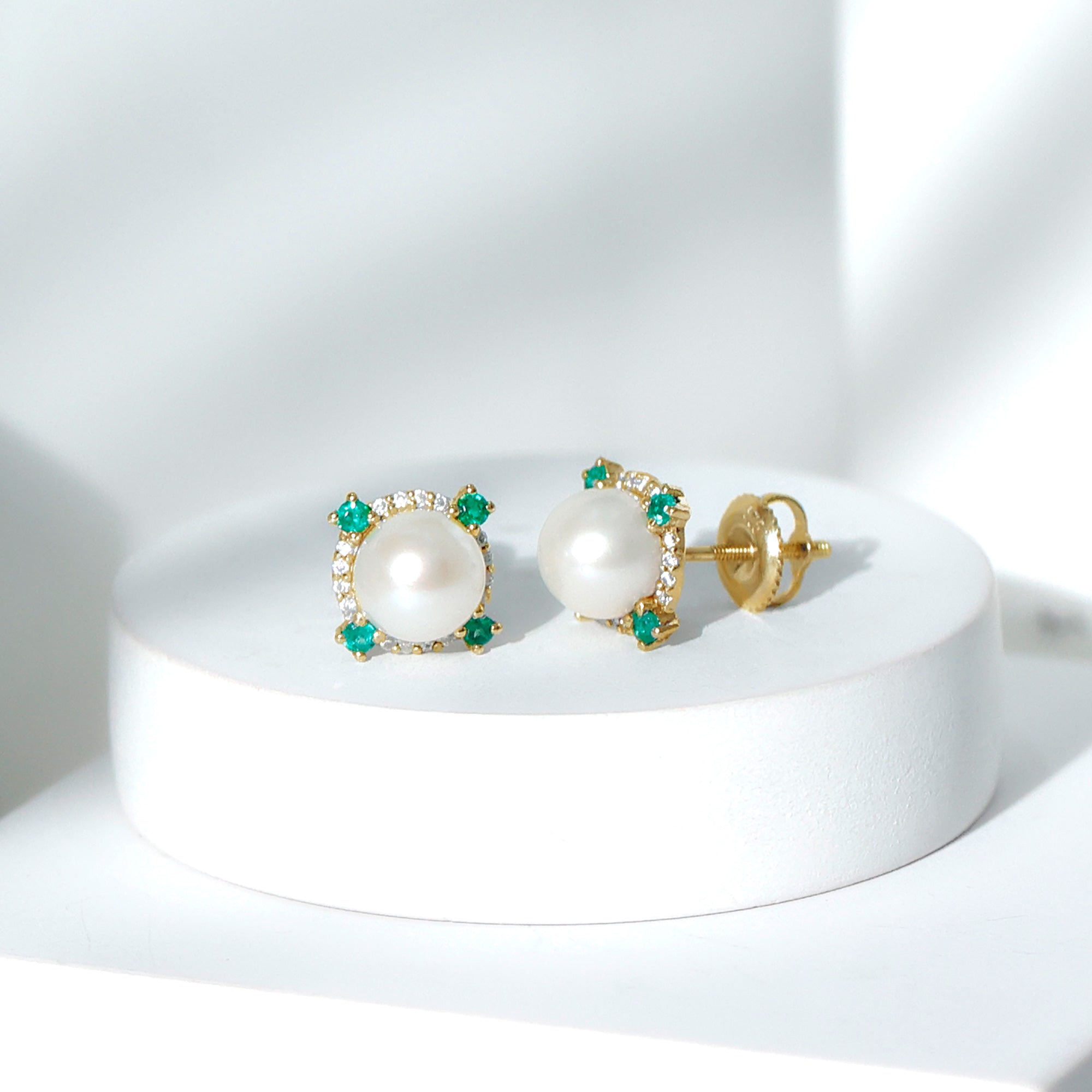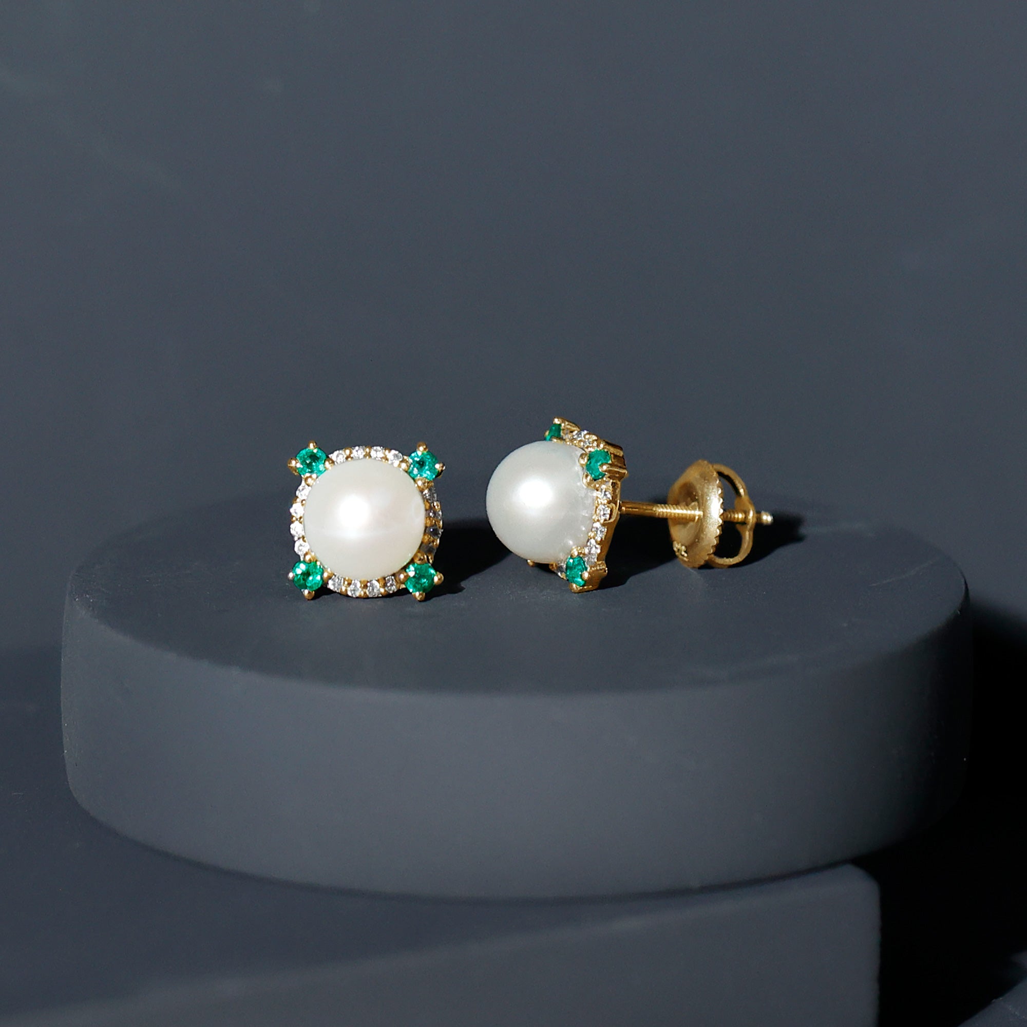 The Beautiful Halo Earrings are designed with combination of Three types of Round Shaped Gemstones moissanite stones, Freshwater Pearl and Emerald in Prong Setting in Solid Gold. The center stone is a Freshwater Pearl Solitaire encircled with moissanite stones and Emerald artistically. Grab these Stud Earrings and match them up with your favorite attire.