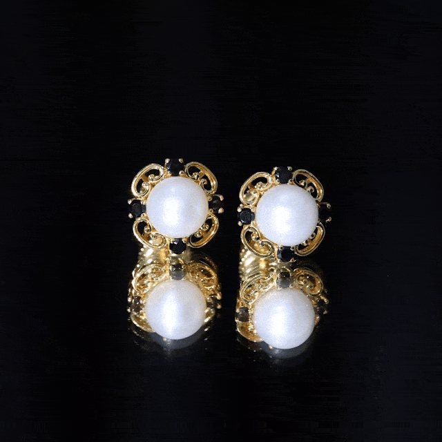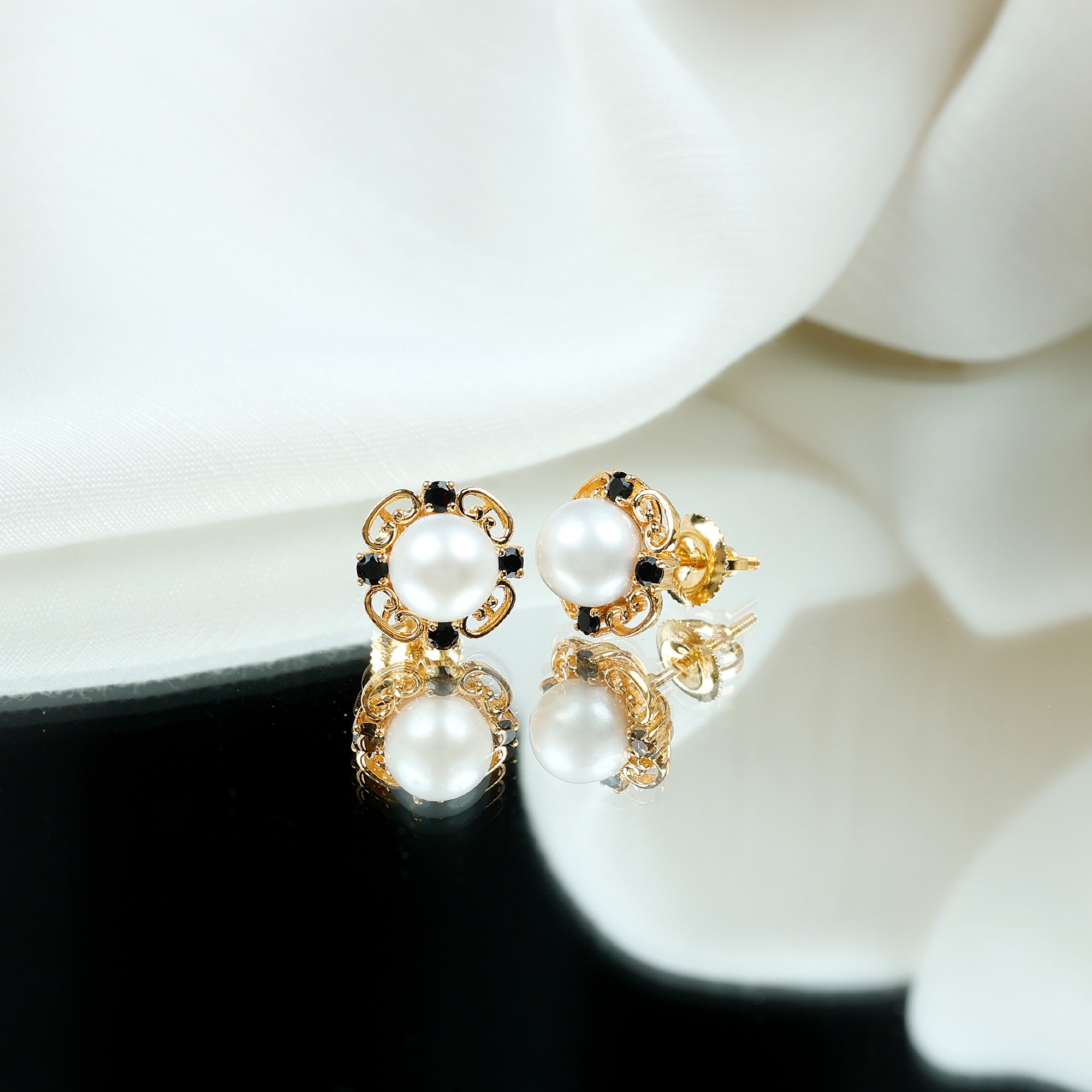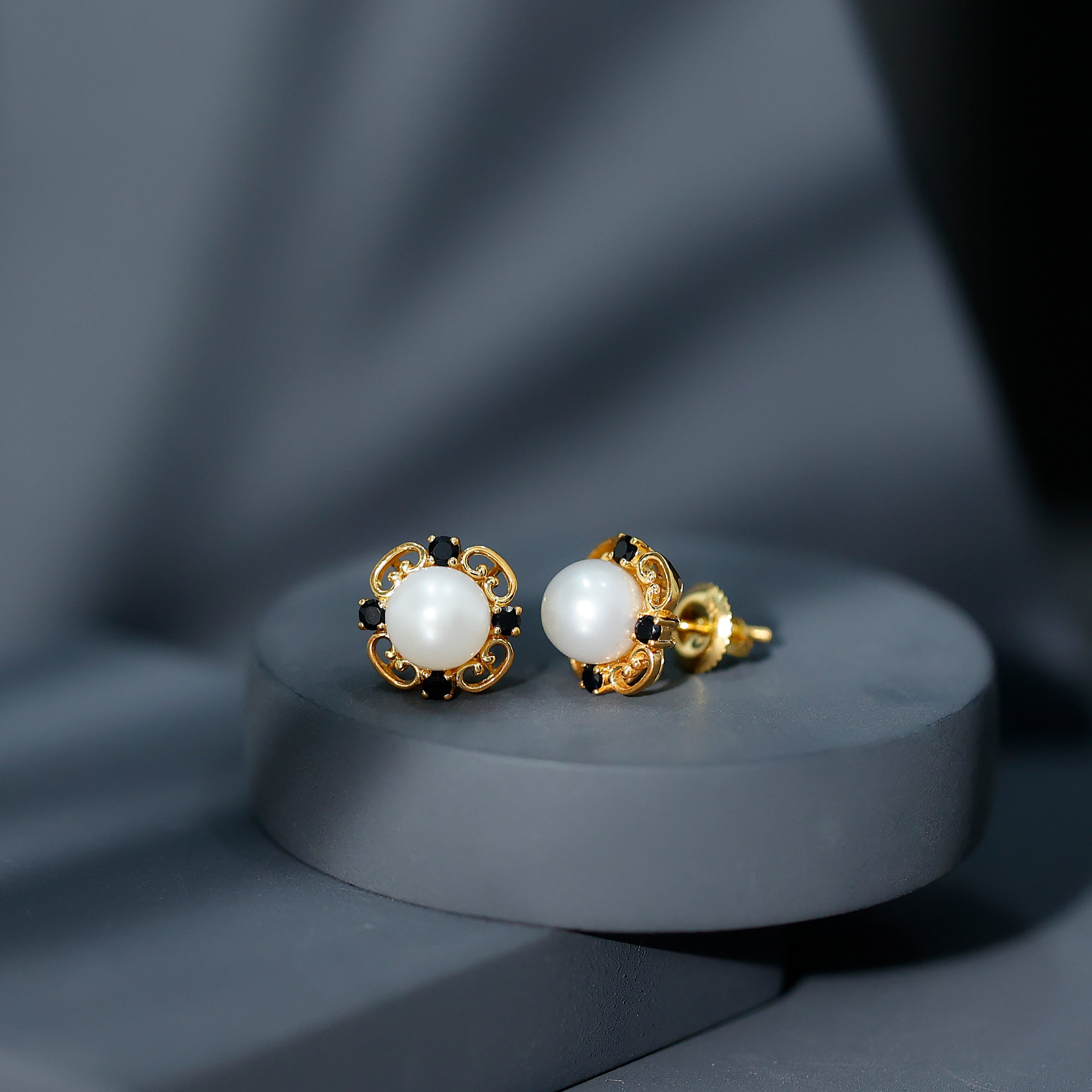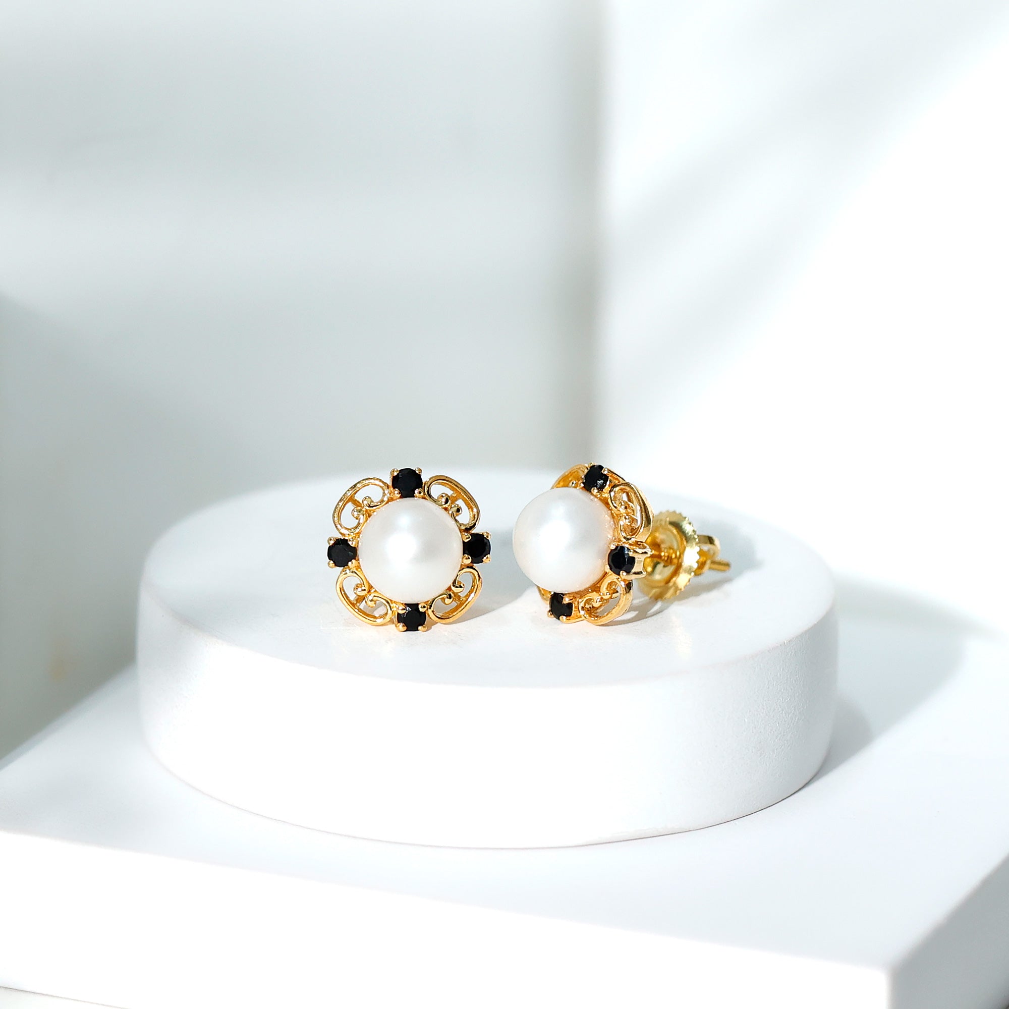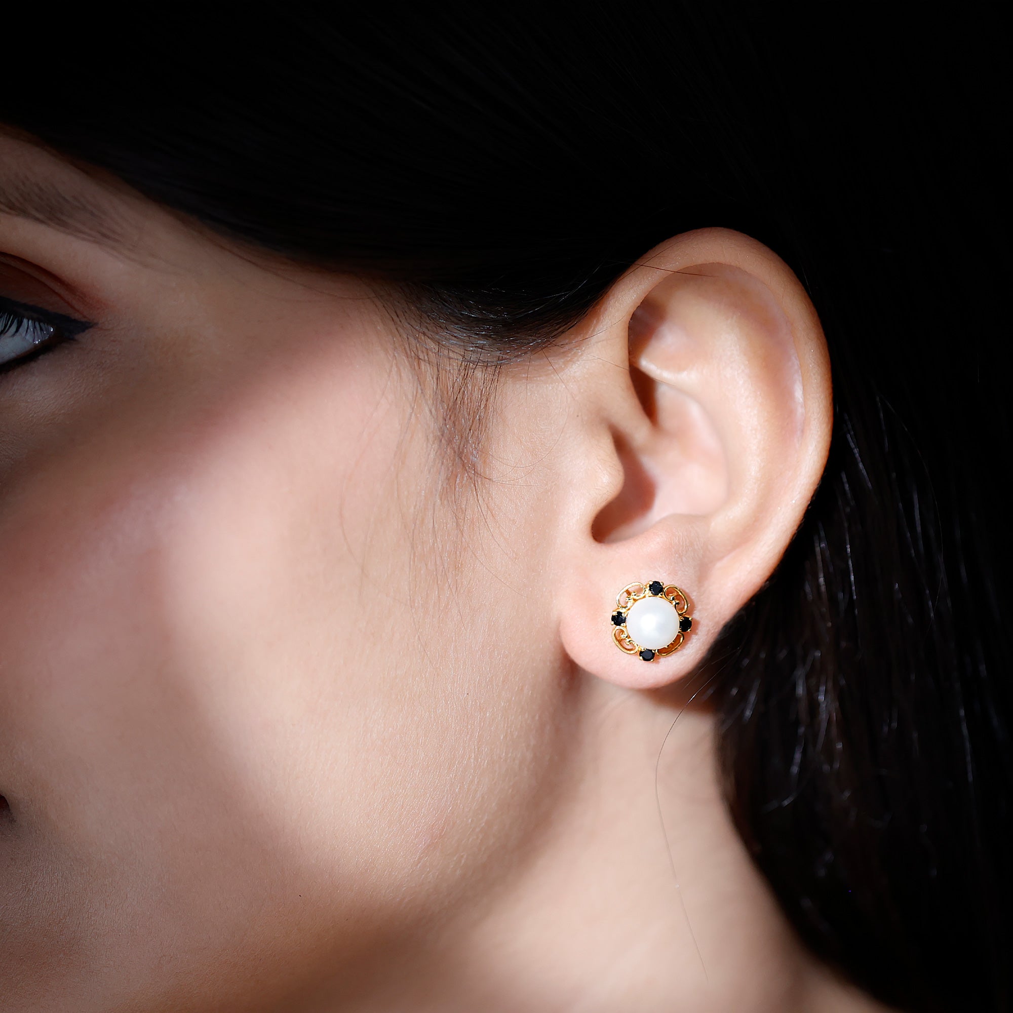 The Beautiful Vintage Earrings are designed with combination of Round Shaped Freshwater Pearl and Black Onyx in Prong Setting in Solid Gold. The center stone is a Freshwater Pearl Solitaire encircled with Solid Gold Metal and Gemstone in a unique way. Grab these Stud Earrings and match them up with your favorite attire.