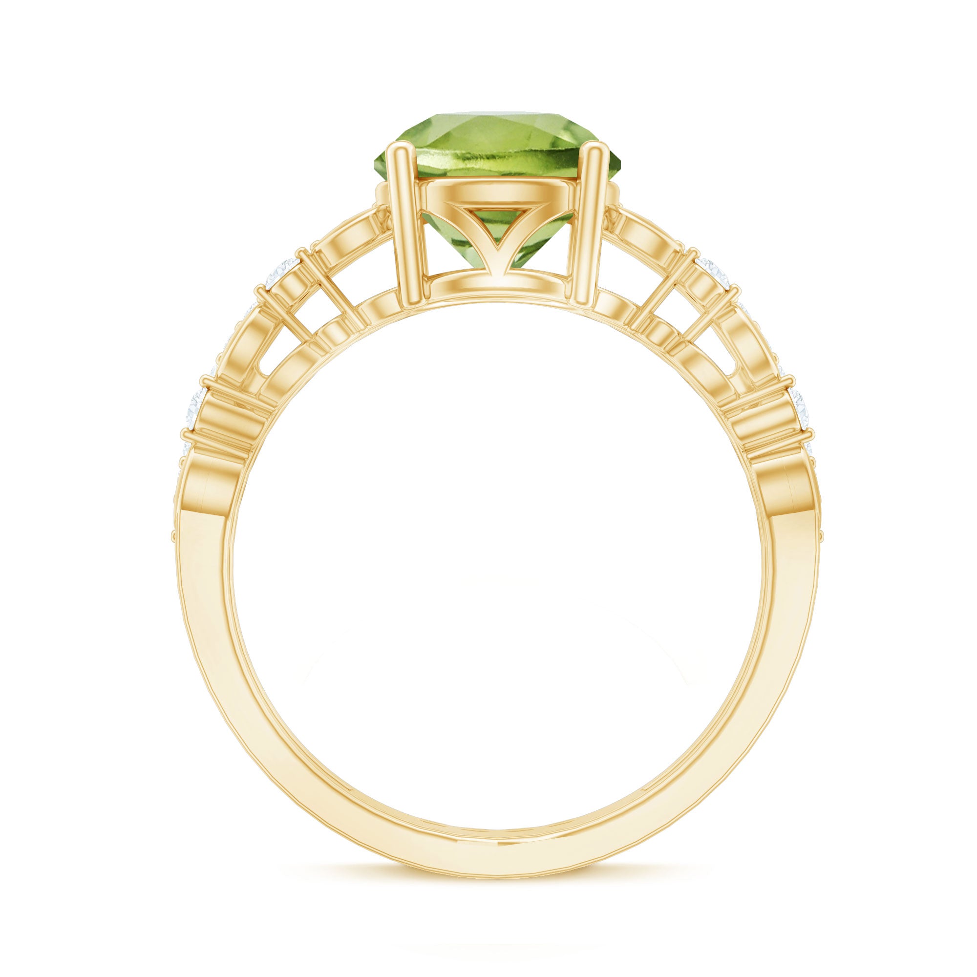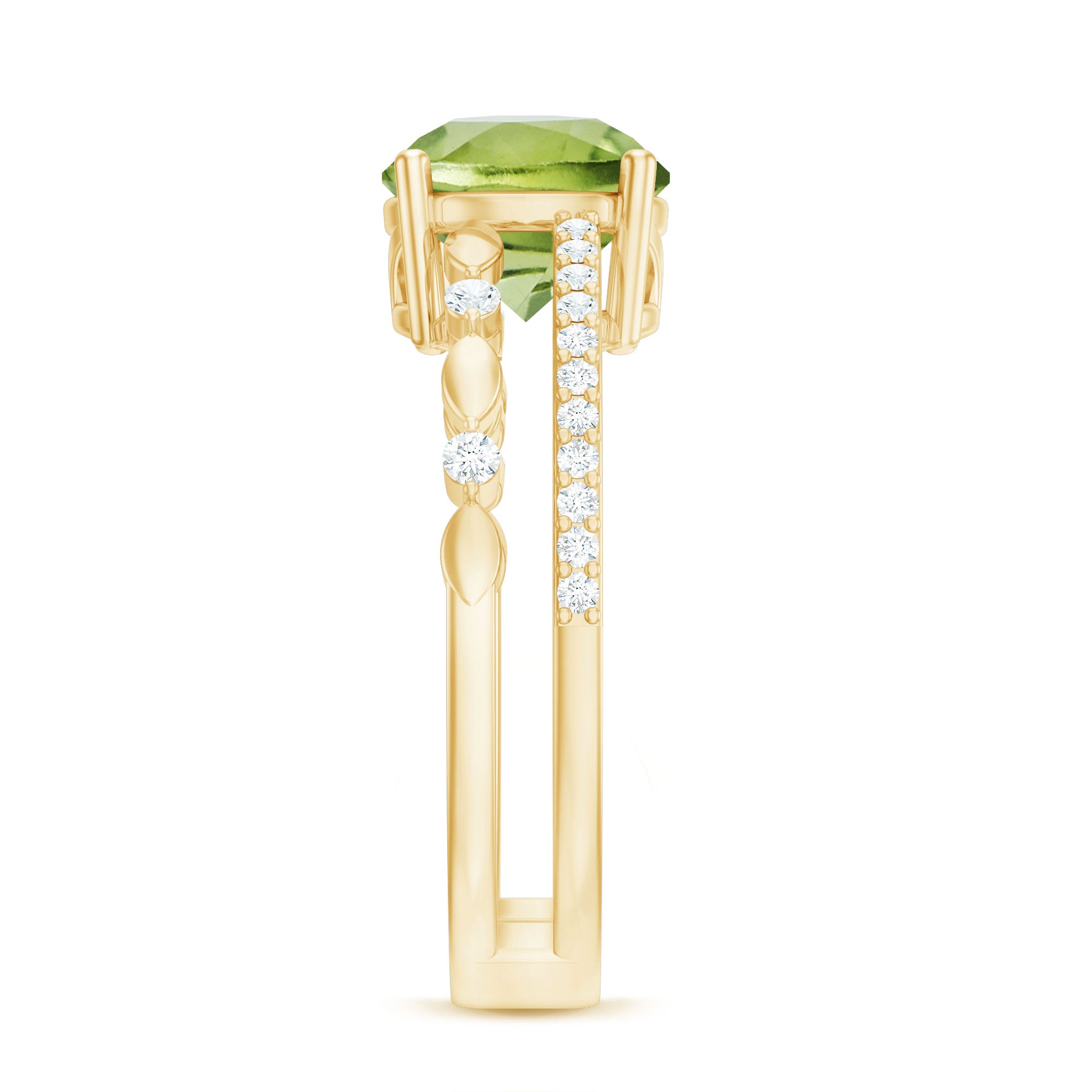 Make her feel special with this breathtaking Peridot Engagement Ring. The Solitaire ring features a dazzling round Peridot solitaire on a double band shank delicately decorated with sparkling Diamond stones and gold marquise shapes. This stunning double band ring is the perfect symbol of your love and commitment, sure to take your partners breath away. Celebrate your future together with this beautiful and meaningful piece of jewelry.