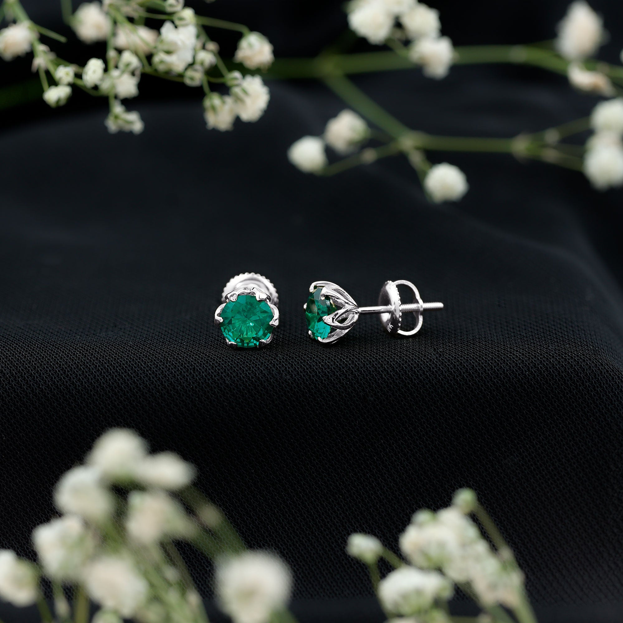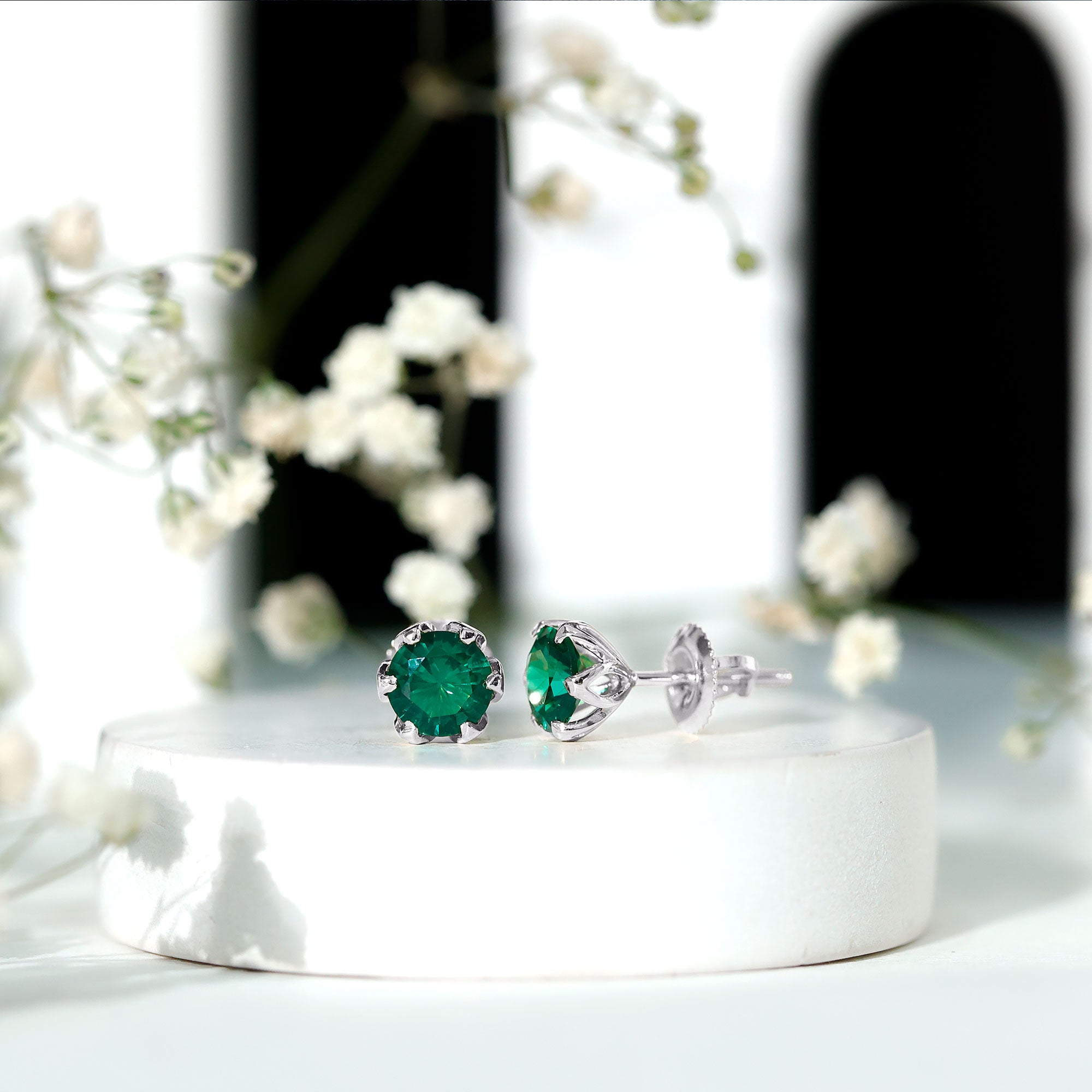 6 MM Round Cut Created Emerald Solitaire Stud Earrings in Lotus Basket Setting