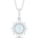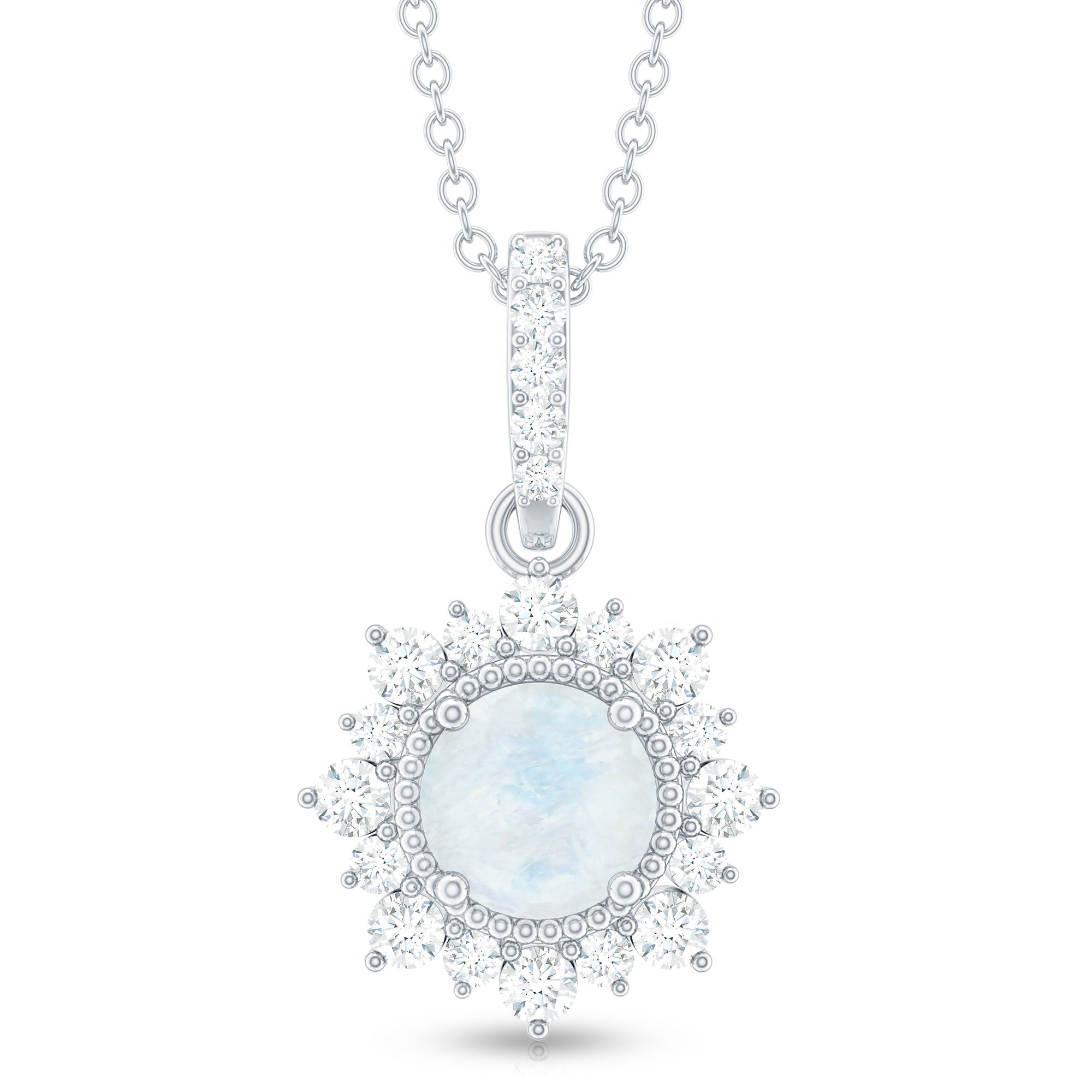 Looking for a simple yet stunning piece to adorn your neck, we got you back with this Moonstone Pendant Necklace. It features a 6 MM Round Shape securely placed in Prong Setting encircled with smaller diamonds along with beaded detailing enhancing the look of the pendant. This Halo Necklace exudes the mesmerizing shine of AAA Quality Moonstone and HI-SI Quality Diamonds. This Round Pendant Necklace will be delivered to you in a classic jewelry box with the certificate of authenticity.