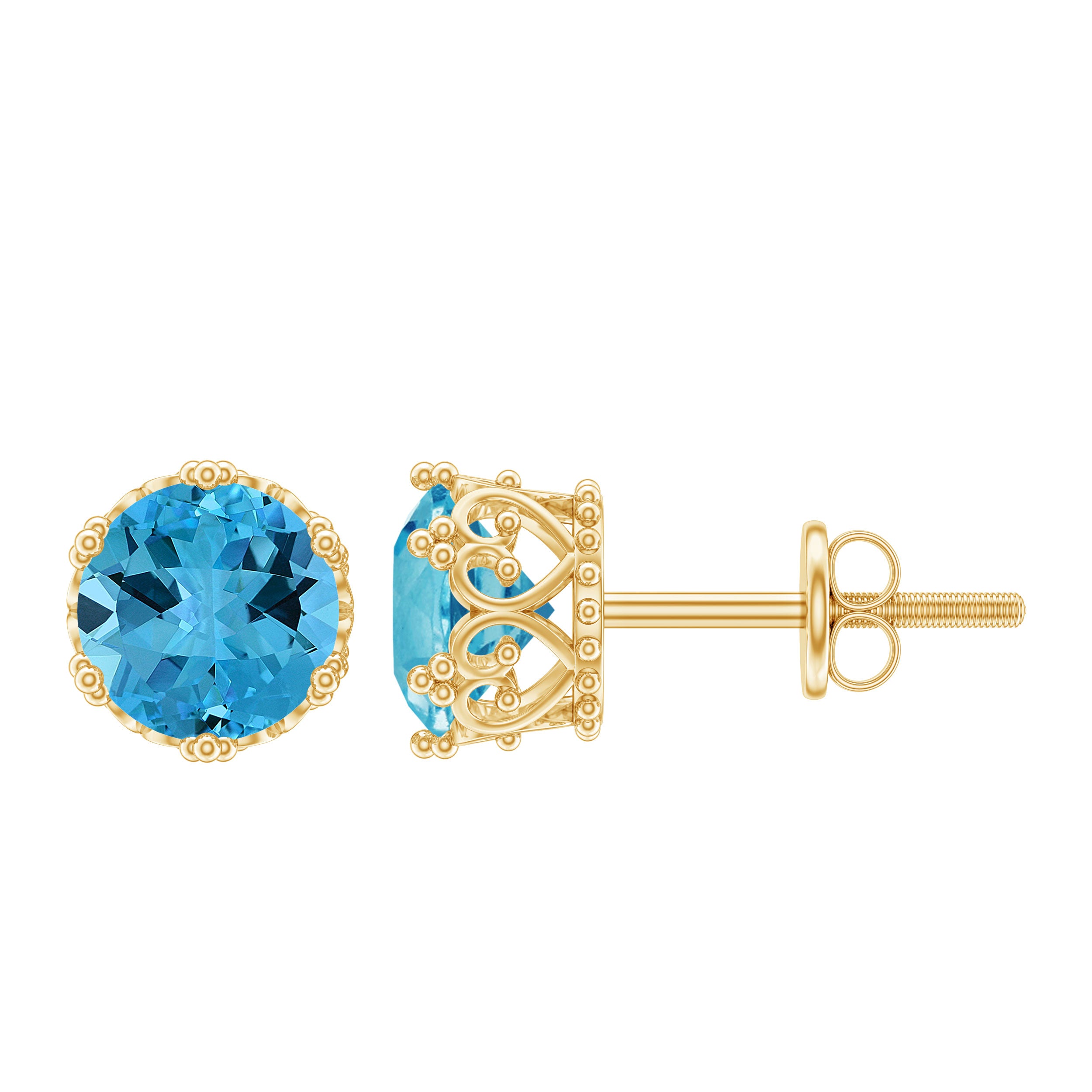 Be Trendy with this Crown Stud Earrings are embellished with Round Shape Swiss Blue Topaz as Solitaire in Crown Setting. These Solitaire Stud Earrings are crafted in Solid Gold.