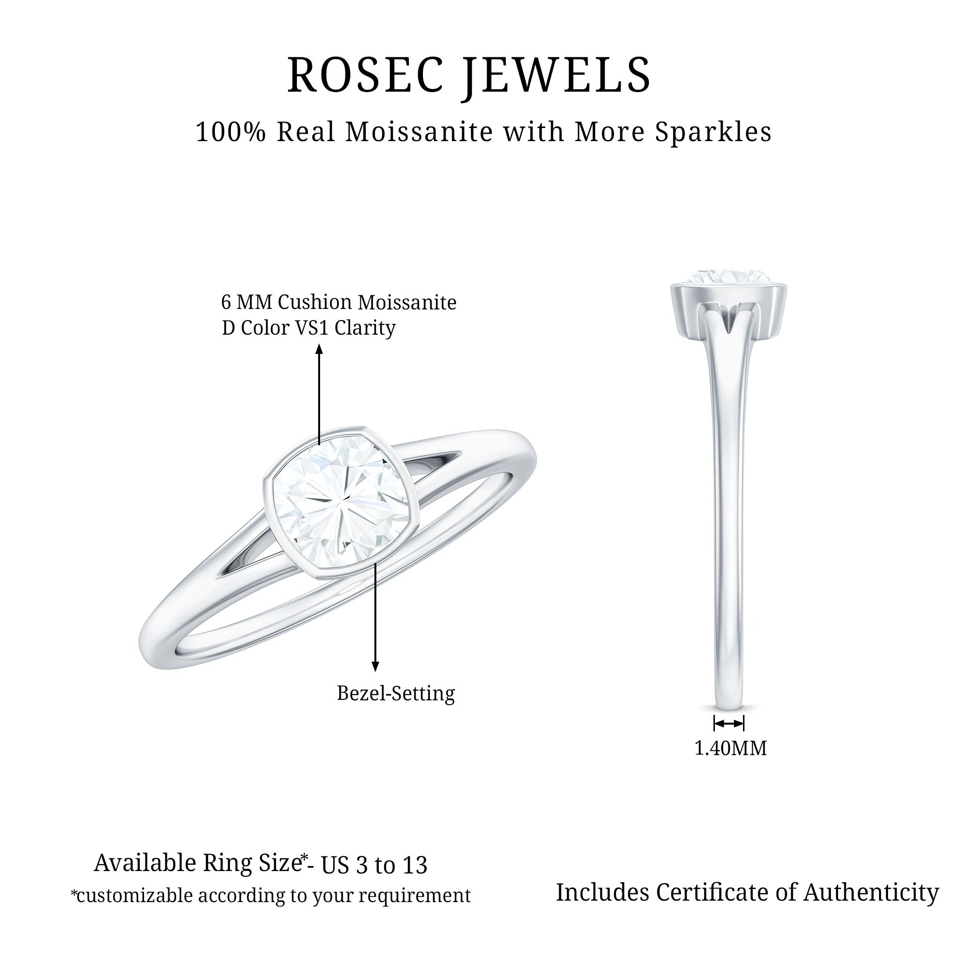 Add a dash of modern charm and a whole lot of sparkle to your love story with this absolutely dreamy Moissanite Engagement Ring. Center stage has a breathtaking 6 MM cushion cut moissanite, glowing with brilliance and fire that could rival the stars. This Split Shank Engagement Ring is crafted in D-VS1 quality, so expect top-tier shine that turns heads and melts hearts. But wait - theres more. The shank has split style, giving it a soft, modern feel that is both timeless and unique. Think of it as a little throwback glamour mixed with modern magic. The delicate split shank design wraps around your finger like this Solitaire Engagement Ring was made just for you. Whether you are planning the perfect proposal or celebrating a moment worth remembering forever, this 2 Carat Moissanite Ring for Women is a whole mood. With US ring sizes ranging from 3 to 13, it is made to fit beautifully on every hand and every heart. Plus, it comes tucked inside a lovely jewelry box - because unboxing moments should feel just as special as saying yes. Classic meets cool with this moissanite masterpiece. Elegant, extra sparkly, and totally unforgettable, this Moissanite Solitaire Ring is just like your love story