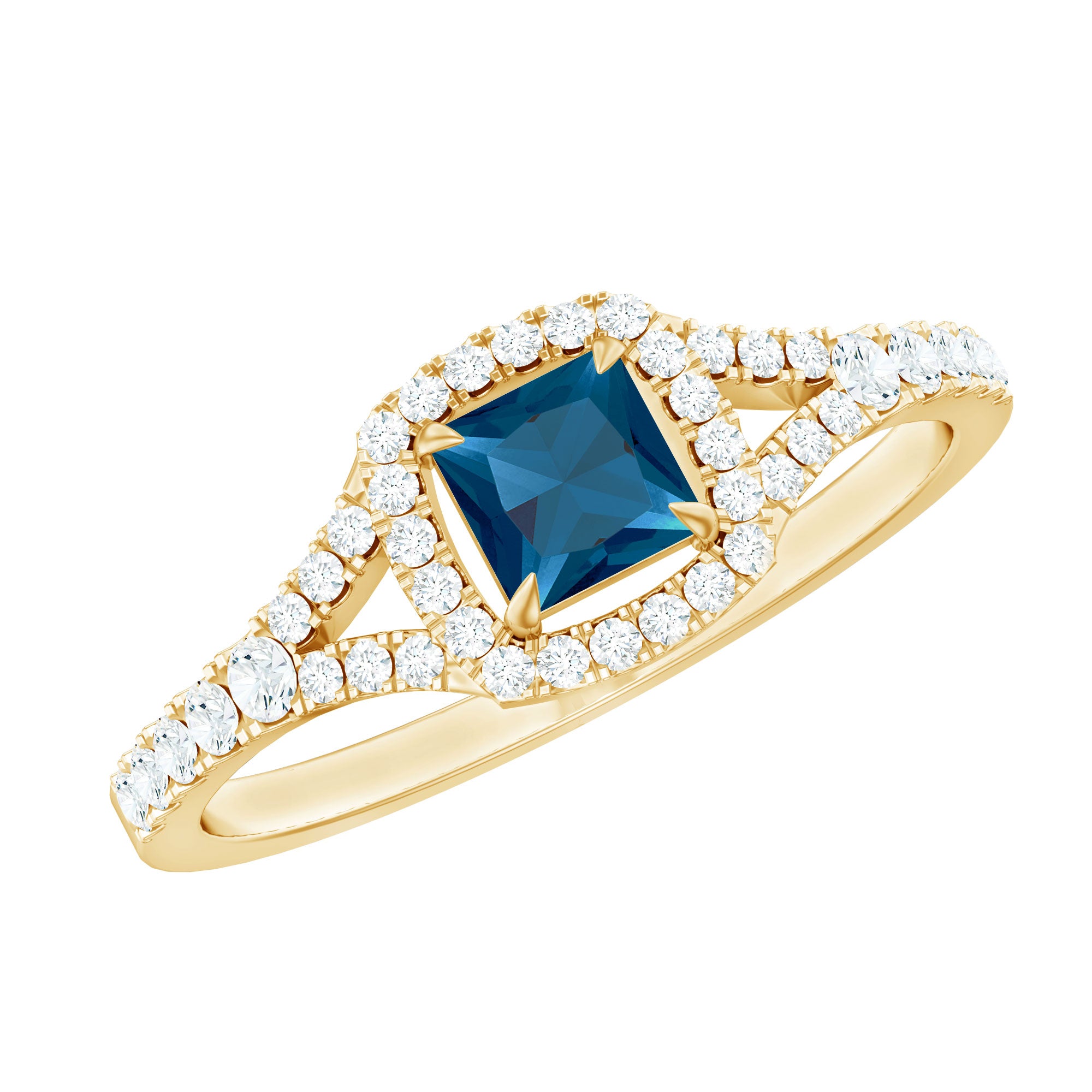 This stunning Square Engagement Ring serves as an excellent means to convey your affection to your beloved. At its core lies a 6 MM Princess cut London Blue Topaz, securely held in a claw setting surrounded with small round shape diamonds set as halo style. The Split Shank Engagement Ring features a open shank band, embellished with round cut Diamond stones. Meticulously crafted, this London Blue Topaz Engagement Ring exudes a designer aesthetic and refined details, making it perfect for anyone in search of something unique and striking. Whether you are proposing or celebrating a significant milestone, this Split Shank Ring is intended to radiate and be treasured for a lifetime. It offers remarkable brilliance, durability, and timeless elegance without exceeding your budget. The Princess Cut Blue Topaz Ring is presented in an exquisite jewelry box, ideal for gifting. Additionally, you will receive a certificate of authenticity for the stone, ensuring your confidence in your purchase. This fashionable and Halo Engagement Ring is designed to shine in every aspect, just like your love.