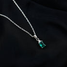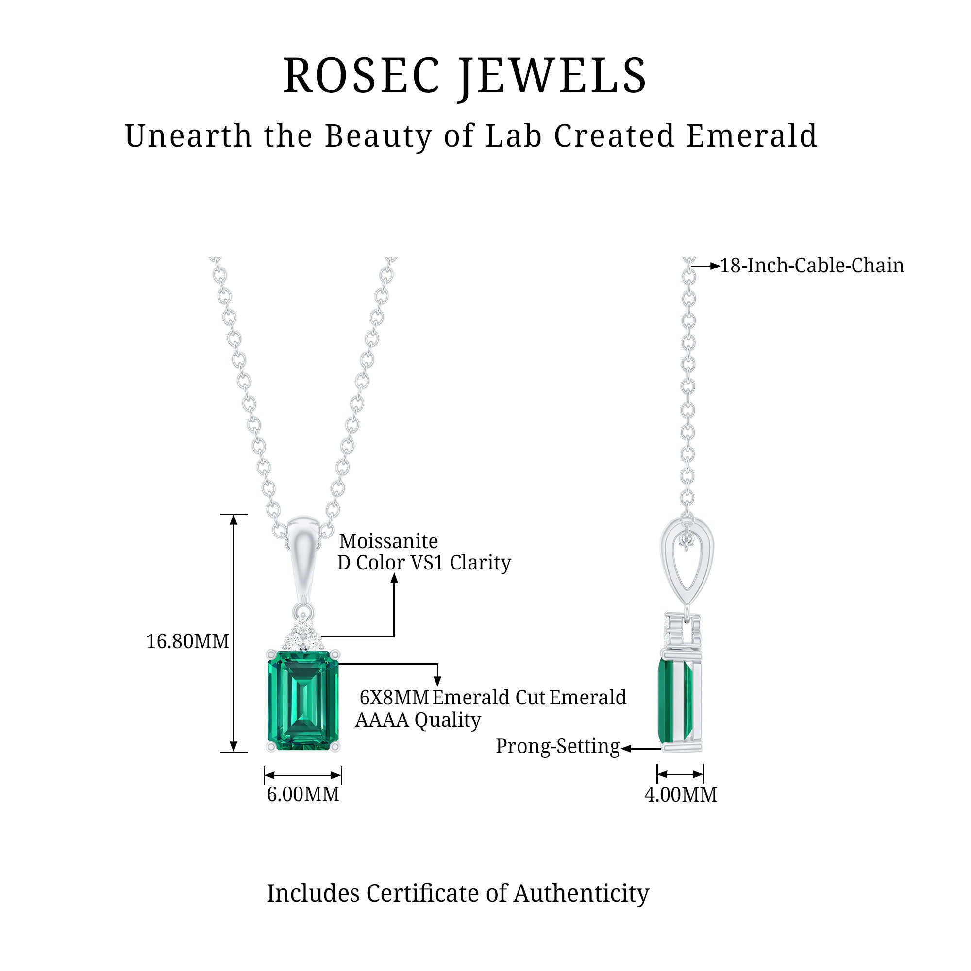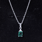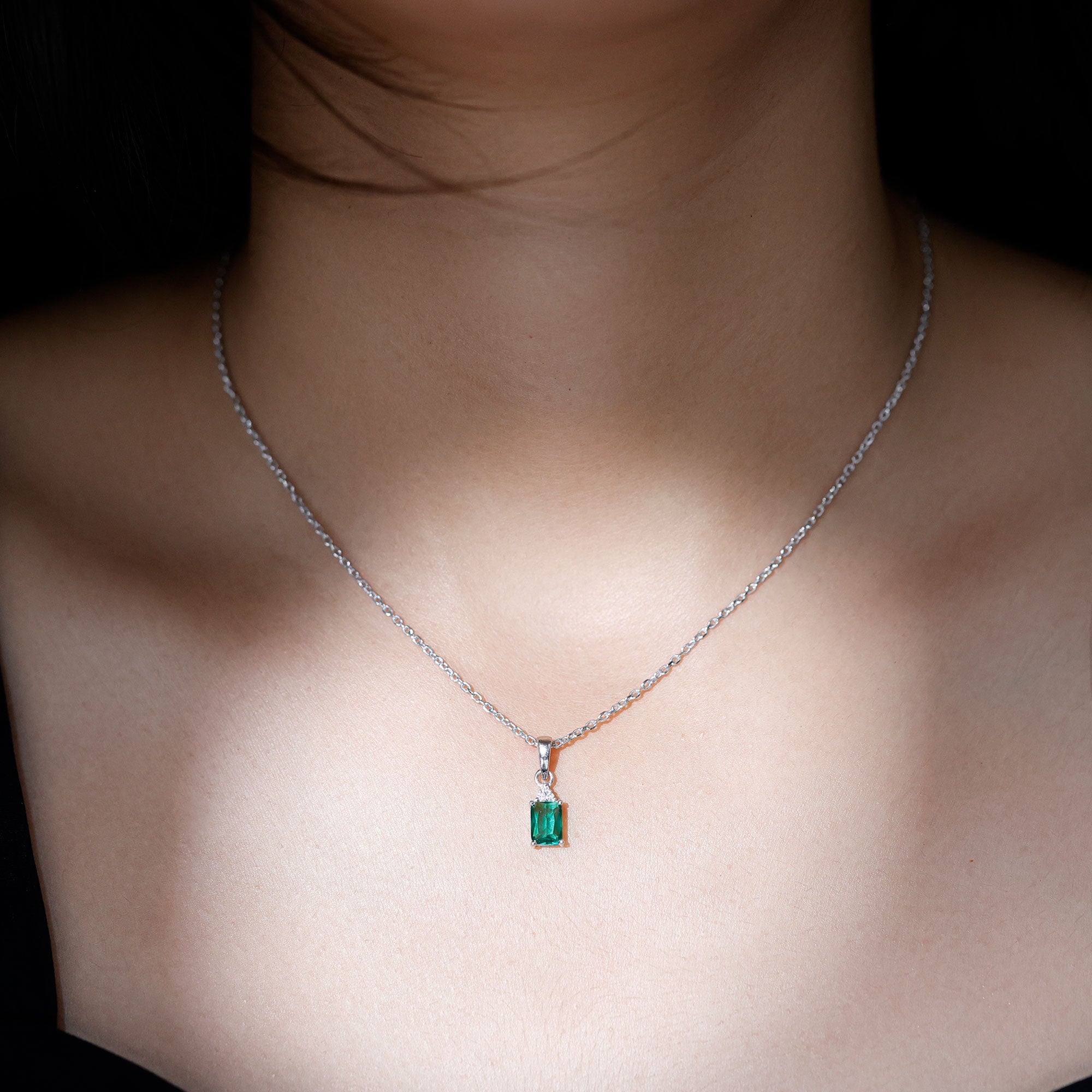 If youre in search of a timeless accessory, our Solitaire Emerald Necklace is just what you need. Crafted from white gold plated silver, this Emerald Cut Pendant is designed to be both durable and lustrous. The prong setting securely holds the 6X8 MM emerald cut lab-grown emerald while beautifully enhancing its color. Above the main stone, a trio of round cut dainty moissanite adds a touch of sparkle. Made with meticulous attention to detail to meet high standards, it pairs well with any outfit, infusing a sense of sophistication. This Emerald Necklace Silver is a thoughtful gift for birthdays, anniversaries, or simply to show you care. The Solitaire Pendant design is timeless, making it a classic addition to any jewelry collection. Featuring a standard bail, it hangs gracefully from a cable chain, resting comfortably around your neck, merging beauty with practicality. Its classic design and premium materials guarantee that it will be a cherished piece for years to come. Elevate your wardrobe with this exquisite Emerald Cut Emerald Necklace.