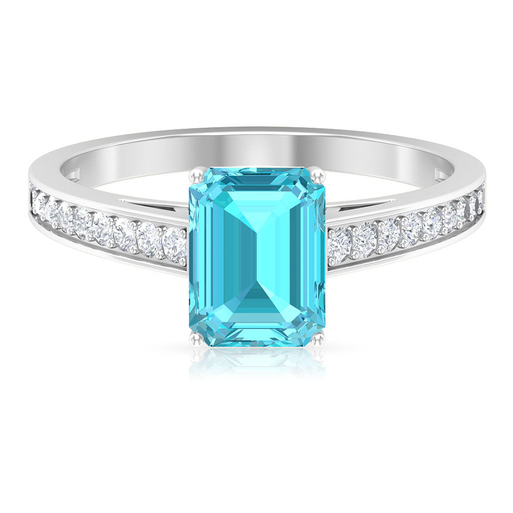 6X8 MM Emerald Cut Shaped Swiss Blue Topaz Solitaire with Diamond Side Stone Ring
