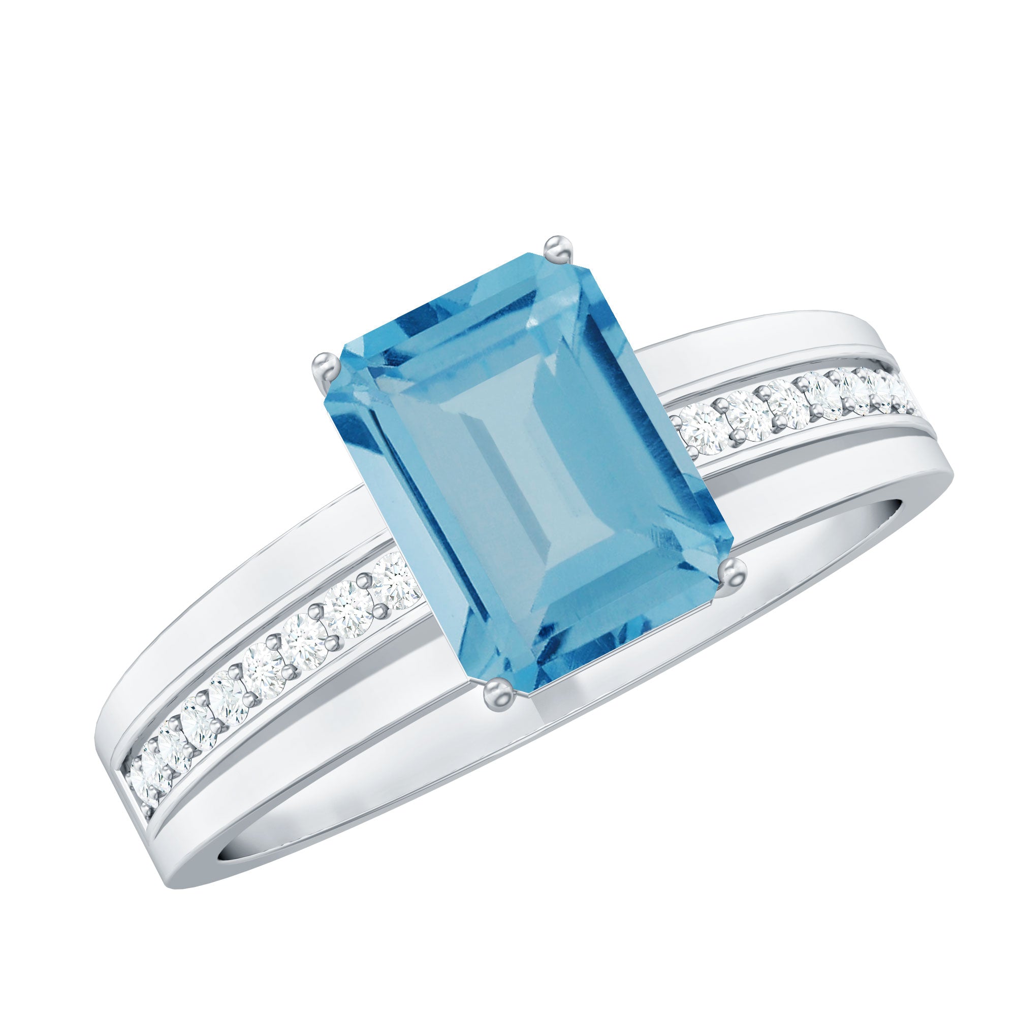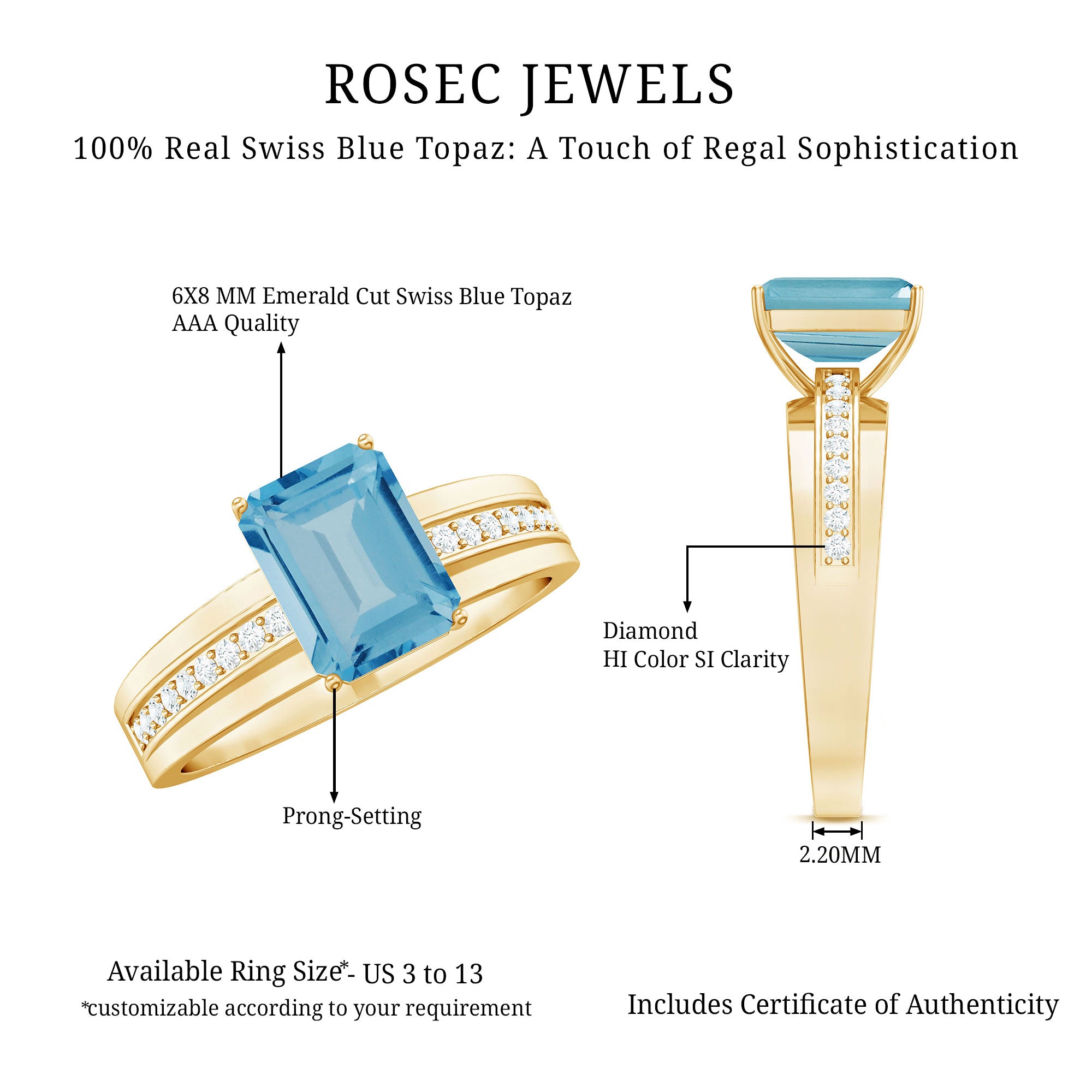 This Two Tone Engagement Ring is embellished with Emerald Cut Swiss Blue Topaz Gemstone is set as Solitaire in a Prong Setting with Brilliant Round Shape Diamonds are set as Side Stones, crafted in a Solid Gold Metal.