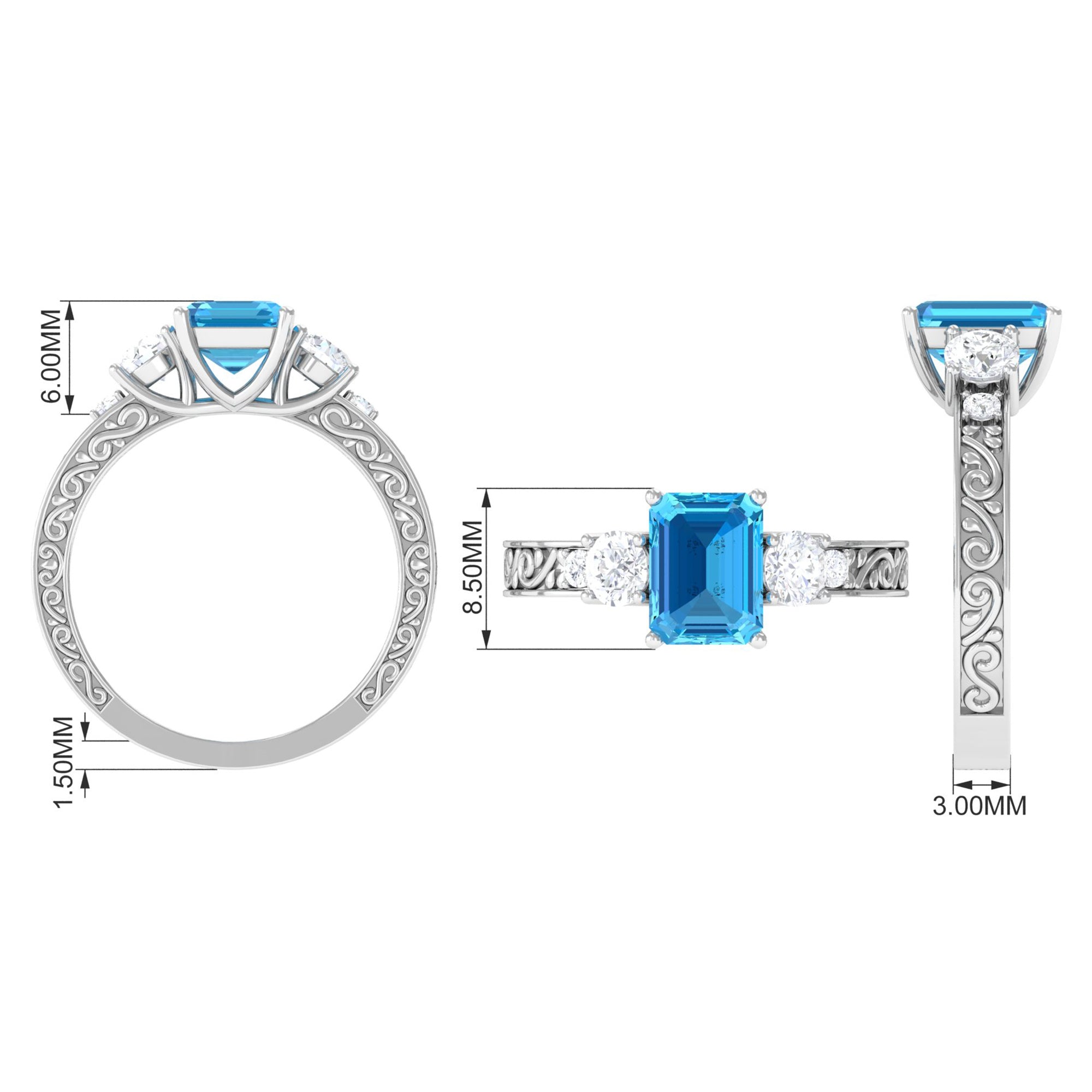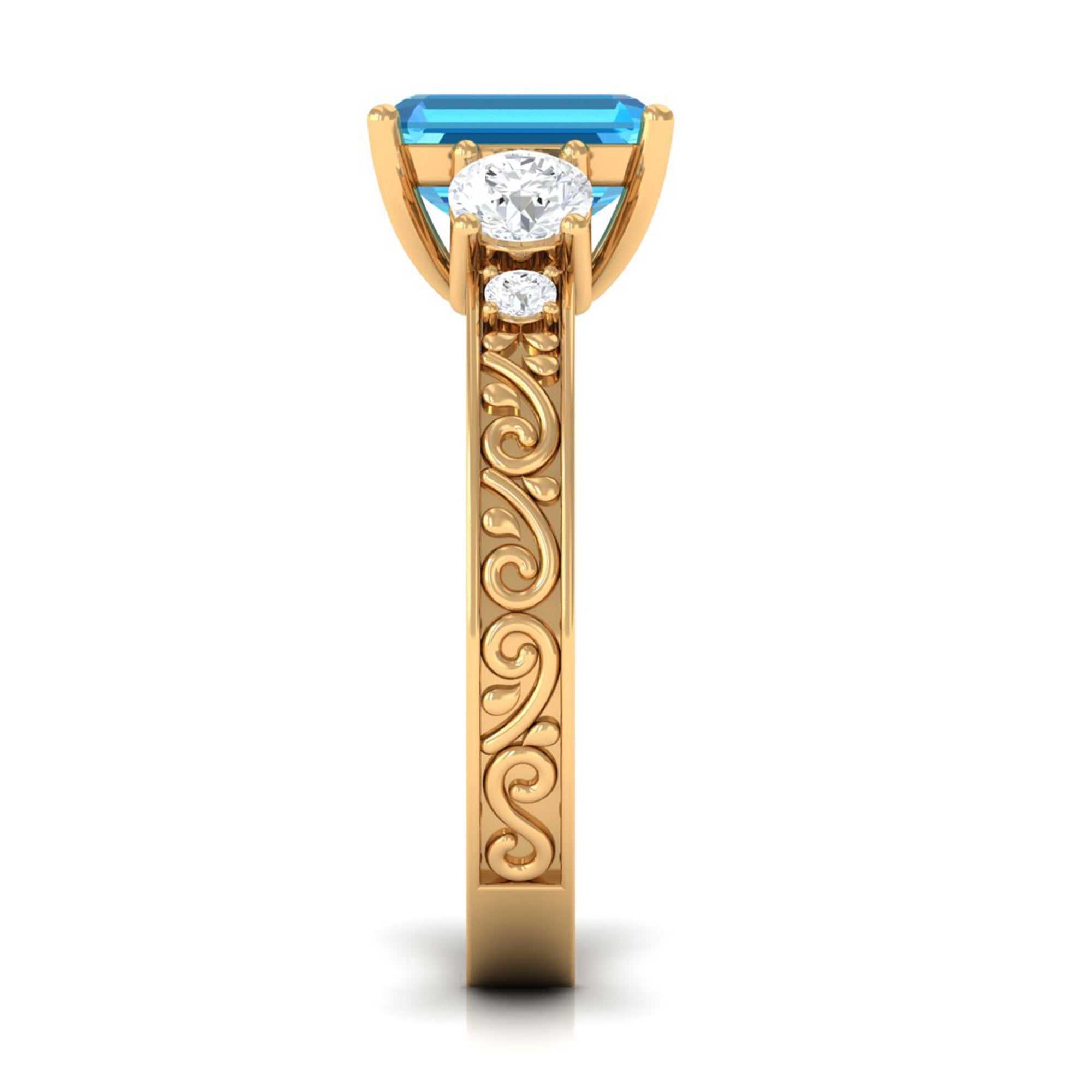 Personifying an exquisite style, this Engraved Ring features an Octagon Cut Swiss Blue Topaz as Solitaire and Round Brilliant Cut Moissanites embellished in Prong Setting for your girl. This Three Stone Ring is a perfect Engagement Ring with an attractive colour pallette to put you on spotlight.