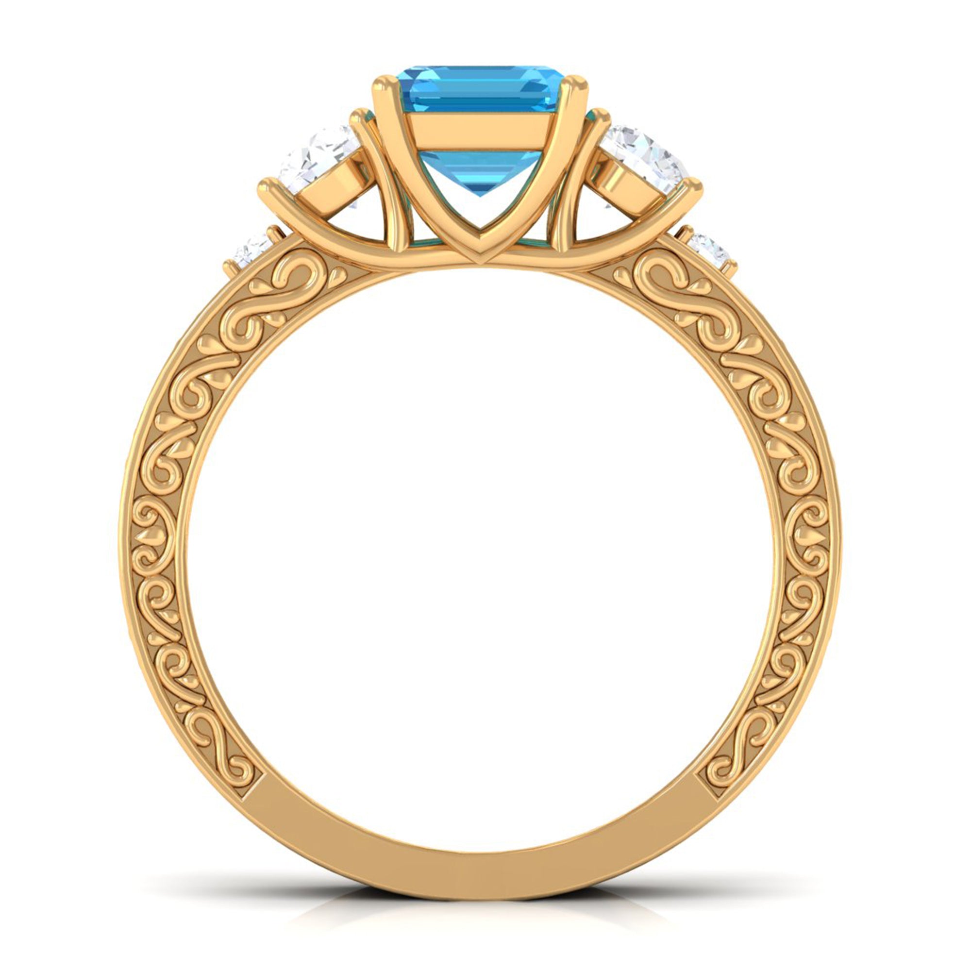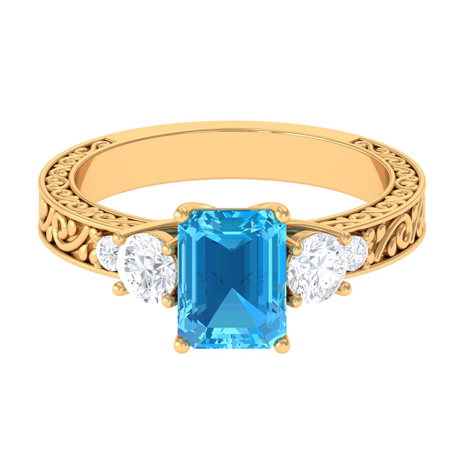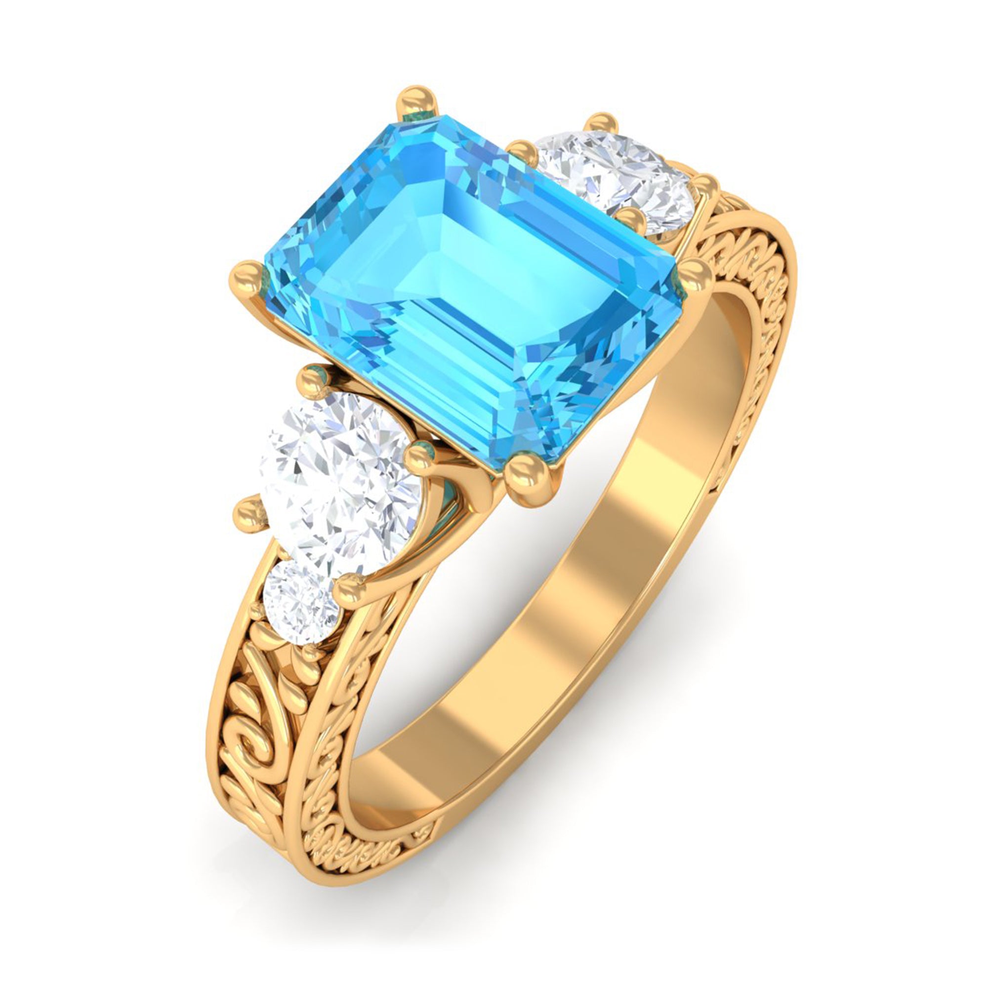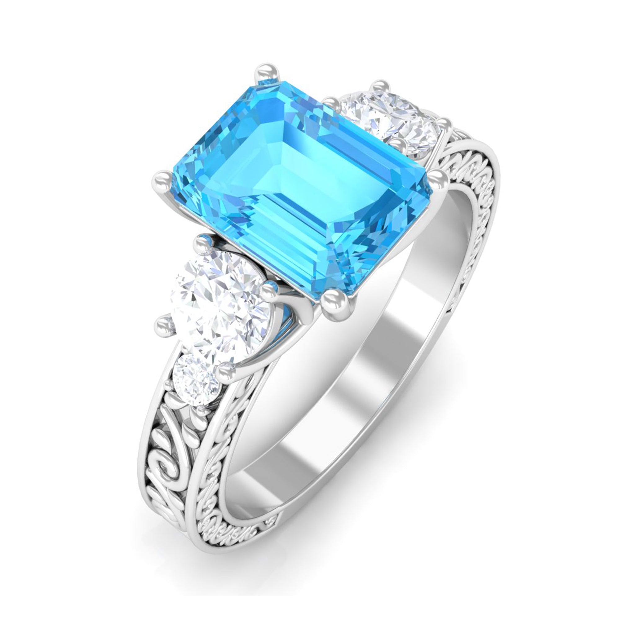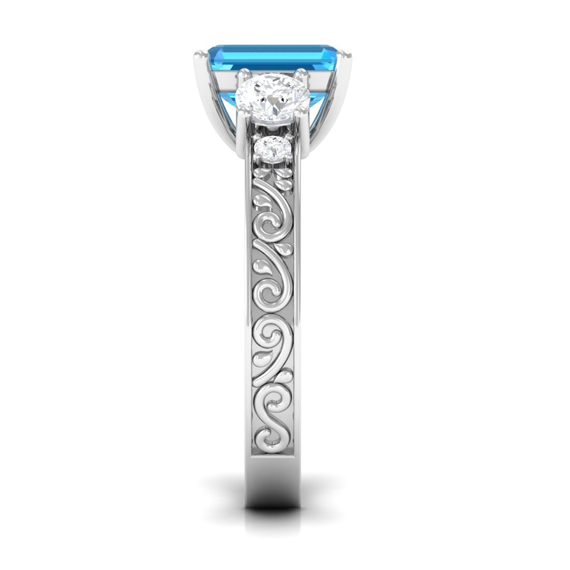 Personifying an exquisite style, this Engraved Ring features an Octagon Cut Swiss Blue Topaz as Solitaire and Round Brilliant Cut Moissanites embellished in Prong Setting for your girl. This Three Stone Ring is a perfect Engagement Ring with an attractive colour pallette to put you on spotlight.