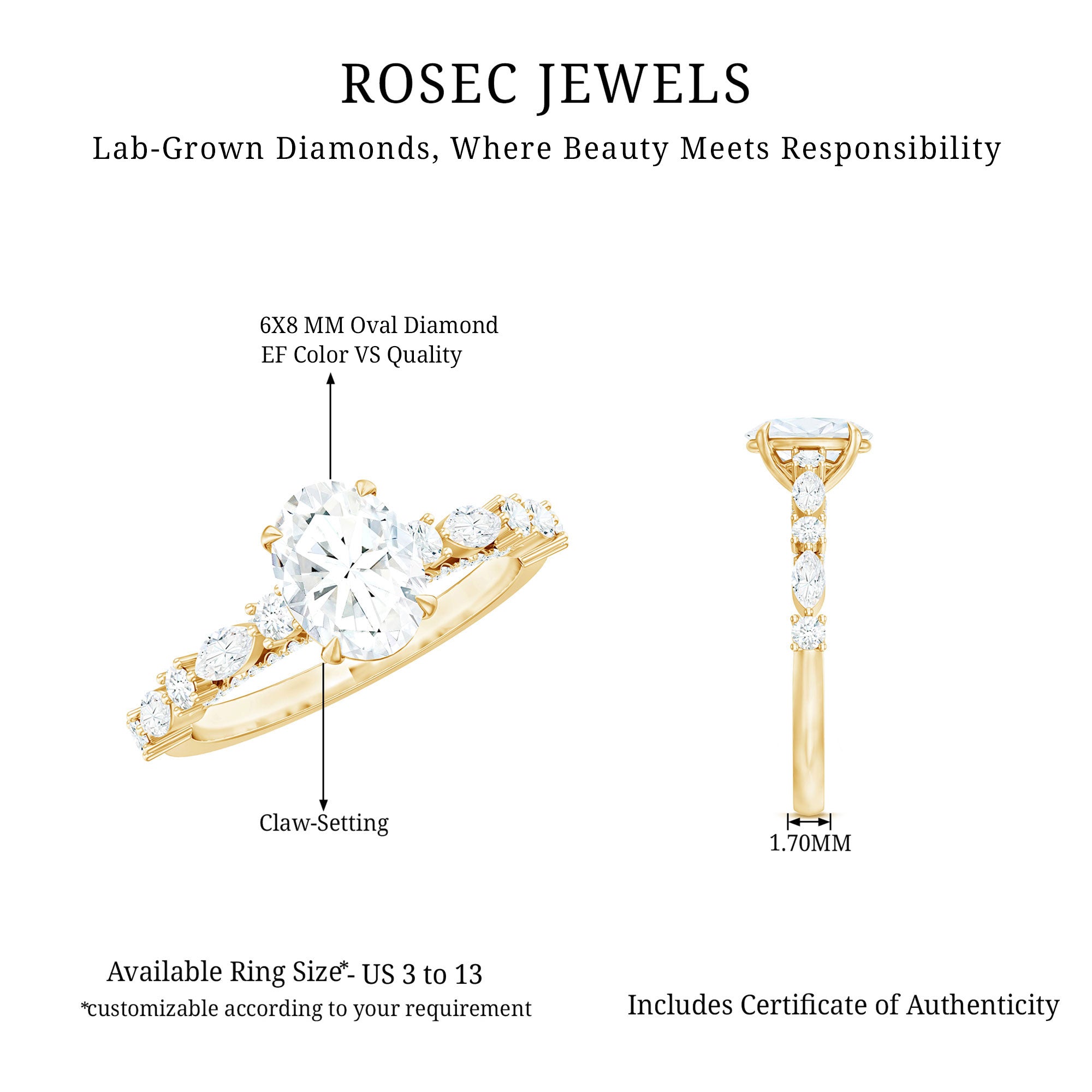The stunning design of the Lab Grown Diamond Engagement Ring is truly magical, making it an ideal representation of your everlasting connection. This ring is carefully crafted from premium metal and features a 6X8 MM Oval Shape Lab Grown Diamond set in a claw setting. As a symbol of love and dedication, this Oval Shaped Ring showcases marquise and round brilliant cut lab-created diamonds as side stones, beautifully enhancing the band. Additionally, there is a delightful surprise - a row of round cut stones that adds a special sparkle beneath the center stone. This Oval Diamond Engagement Ring not only speaks brilliance but also boasts a contemporary style where classic elegance meets modern sophistication. Striking a balance between timeless beauty and contemporary flair, this Solitaire Engagement Ring exemplifies simplicity and iconic design, serving as a lovely homage to modern romance. Its unique beauty makes it suitable for any occasion, whether its an Engagement, Wedding, or Anniversary.