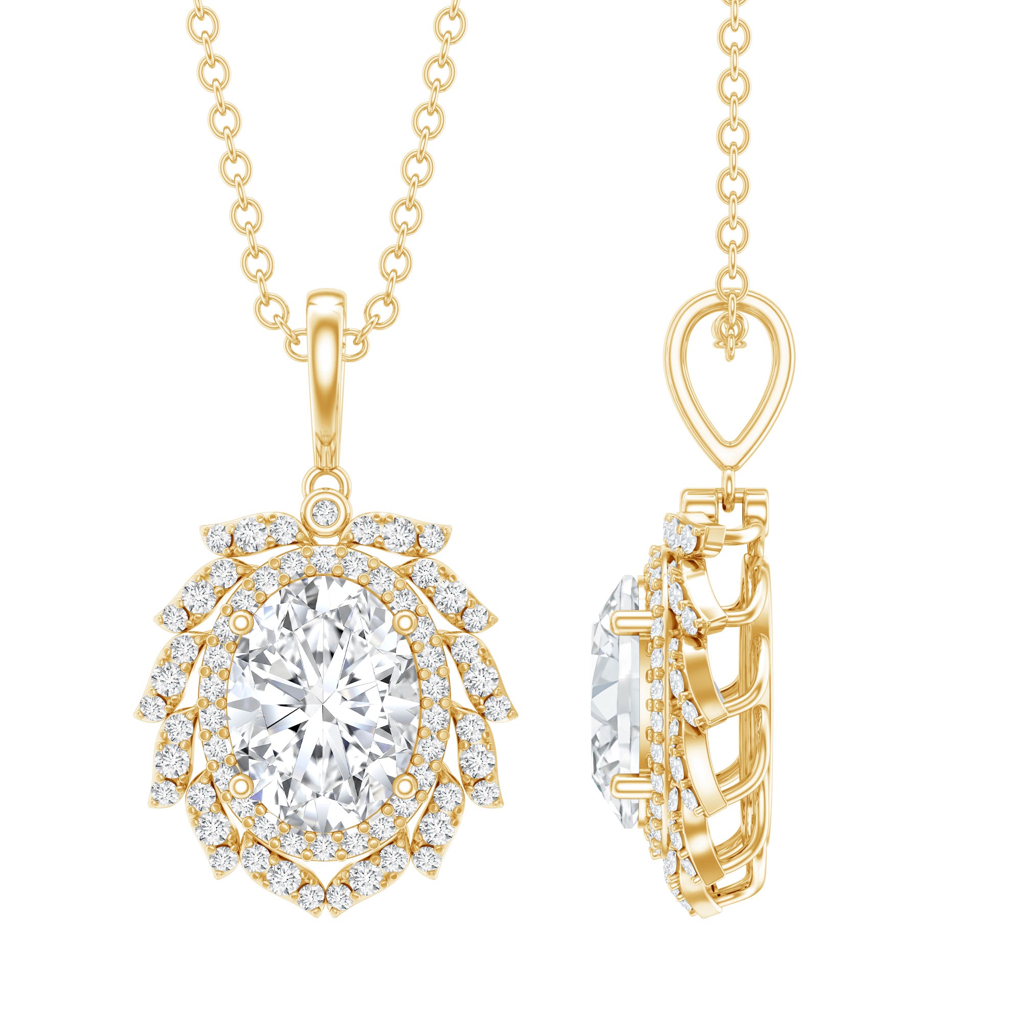 Bold, luxurious, and breathtakingly beautiful, this Diamond Antique Necklace is the ultimate expression of elegance. The centerpiece features a 6X8 MM oval shaped diamond of EF-VS Quality set in secure prong setting, radiating unmatched brilliance. Surrounding it are two diamond halos, the first one is simple, just framing the center stone with its sparkle while the second one resembles a blooming flower with meticulously placed round dainty diamonds over leaf-like metalworks. Each petal-like layer adds depth, sparkle, and grandeur, making this Oval Diamond Pendant Necklace a true showstopper. Hanging from a standard bail that seamlessly blends with the design, this floral Halo Pendant is a classic piece of jewelry.