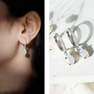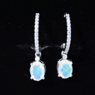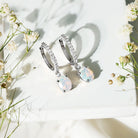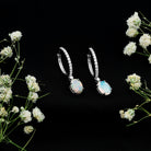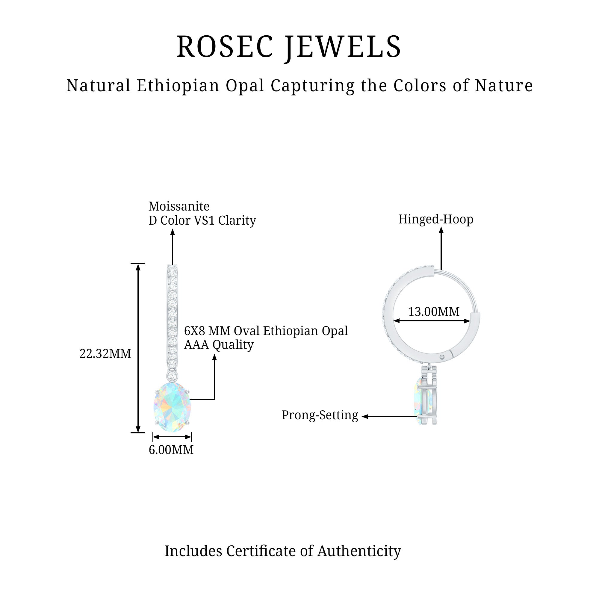 Rosec Jewels Ethiopian Opal Earrings feature a stunning, one-of-a-kind, colorful display that represents love and joy. The enchanting allure of the Hinged Hoop Earrings brings a sprinkle of magic to your ensemble. Made from White Gold Plated Silver, these Opal Drop Earrings showcase a 6X8 MM oval cut Ethiopian opal in prong setting, hanging as a drop, while the small hoop is embellished with round cut moissanite stones for an extra sparkle in the design. With a delicate hint of shimmer, this pair produces a brilliant effect that is bound to catch attention. These Rainbow Opal Earrings are the epitome of glam, adding a magical touch to your experience. The captivating design highlights the latest trends and makes it a must-have jewelry piece for your collection.