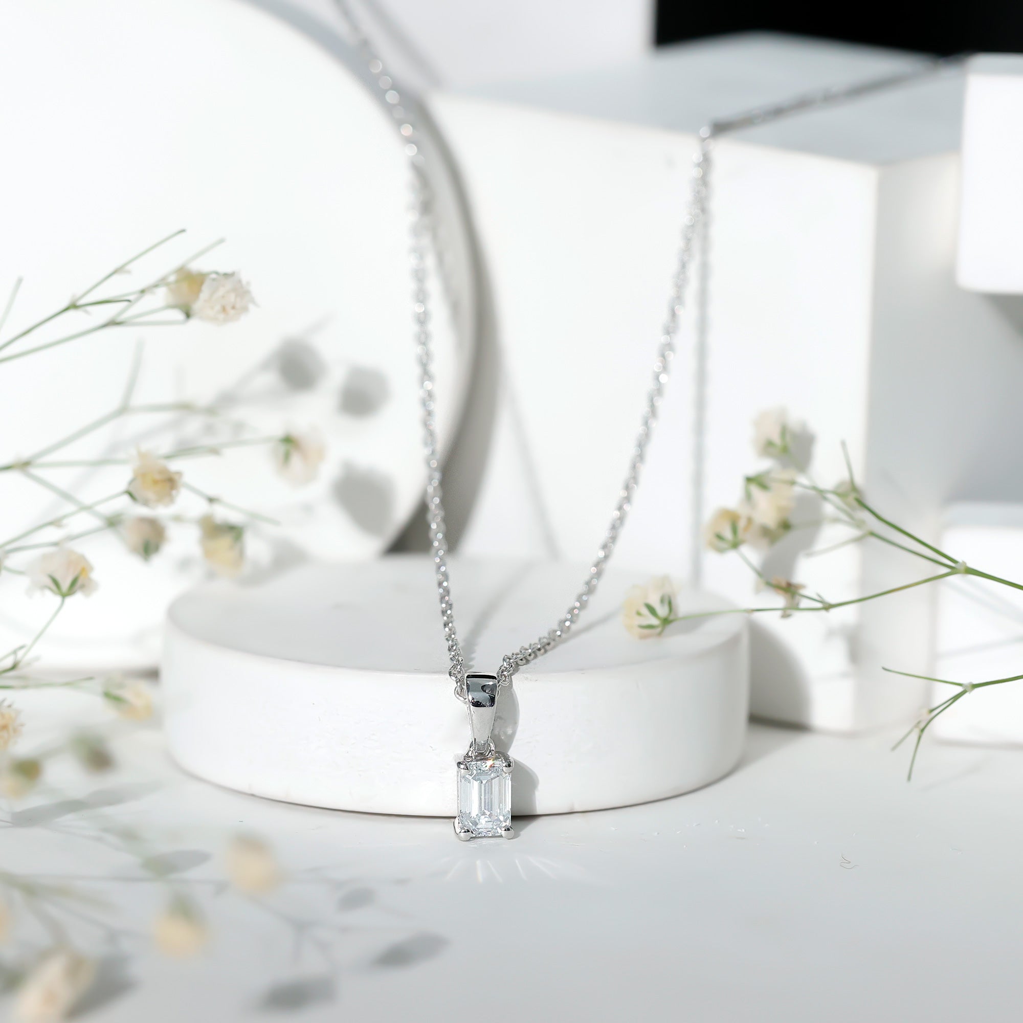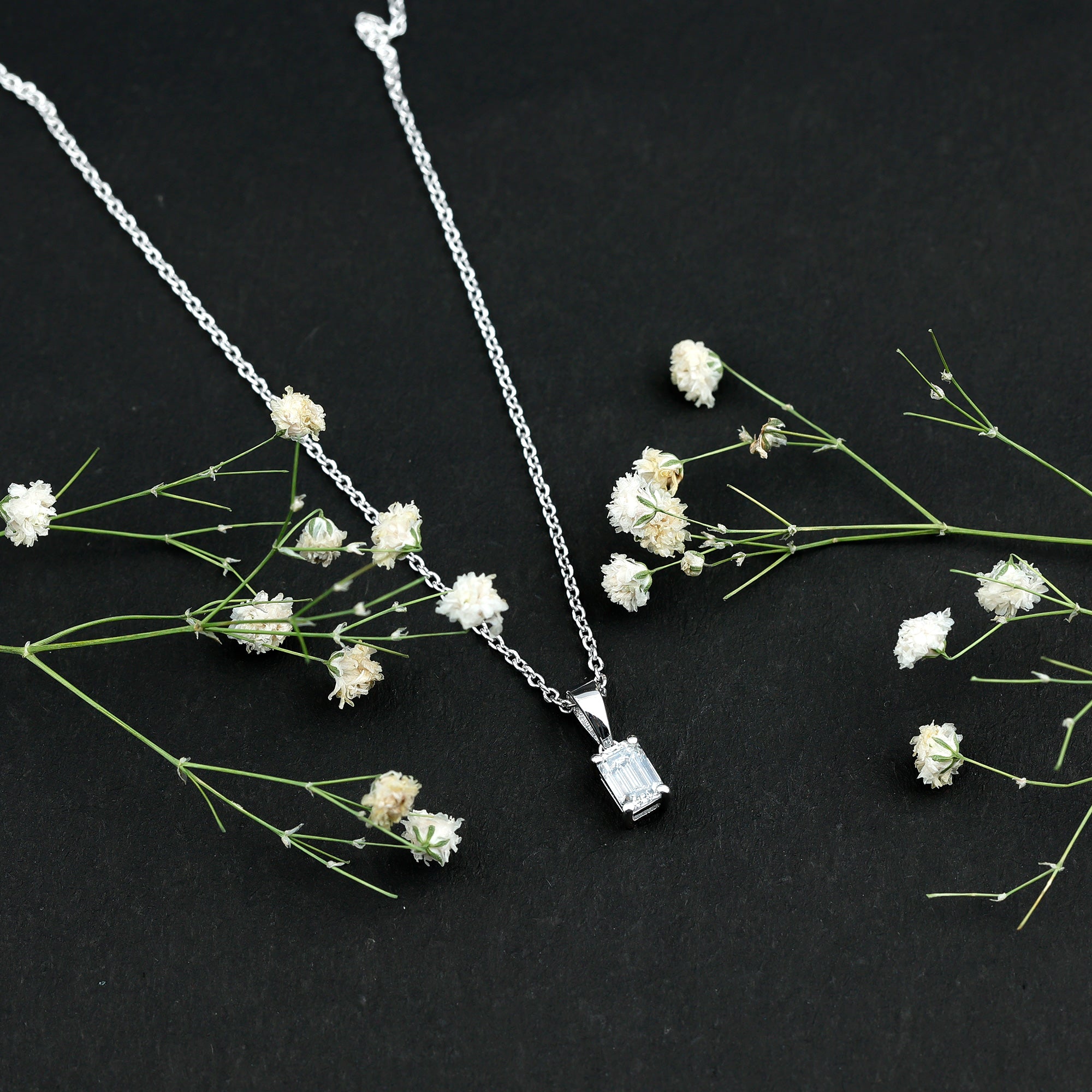 If you are looking for a classic accessory, our Solitaire CZ Pendant is exactly what you need. We made this Single Stone Pendant in white gold plated silver, ensuring it stays durable and shiny. The prong setting holds the 6X8 MM emerald cut cubic zirconia securely while enhancing its sparkle. Made with care to meet high standards, it complements any outfit, adding a touch of sophistication. This Simulated Diamond Silver Pendant makes a thoughtful gift for birthdays, anniversaries, or just to show you care. A Solitaire Pendant design is timeless, making it a classic addition to any jewelry collection. With a standard bail, it hangs from a cable chain, resting comfortably around your neck, blending beauty and practicality. Whether you are treating yourself or buying a gift, our CZ Diamond Pendant is the perfect option. Its classic design and high-quality materials ensure it is a piece you will cherish for years. Enhance your wardrobe with this stunning accessory.