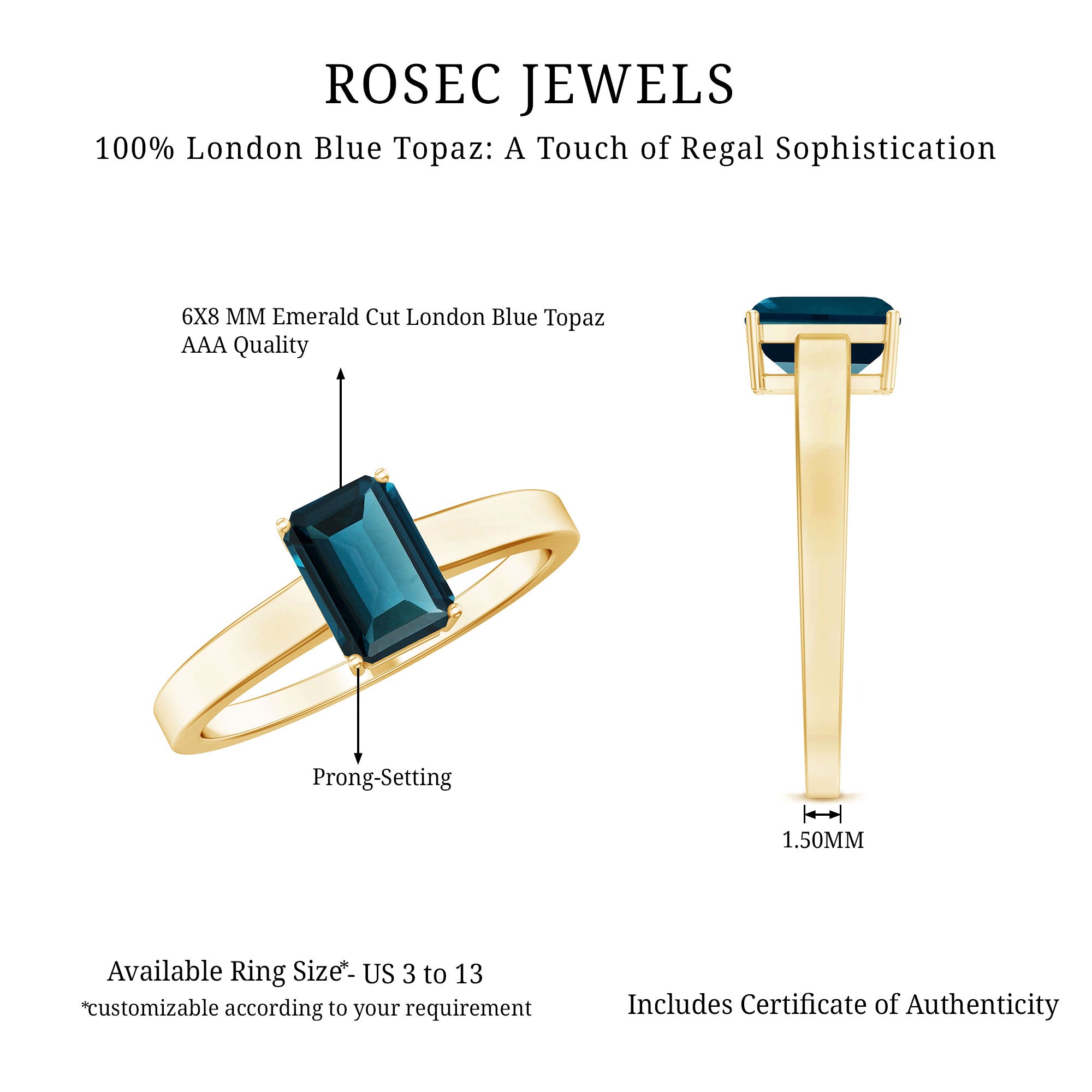Create an unforgettable love story with this luminous London Blue Topaz Engagement Ring, designed to enchant hearts and attract attention. This classic piece showcases a stunning 6X8 MM emerald cut London Blue Topaz as its focal point, expertly held in a prong setting. Mounted on a sleek and polished metal band, this Emerald Cut Engagement Ring emphasizes the breathtaking center stone. The minimalist design enhances the blue topaz brilliance while providing a refined and graceful outline. This exquisite piece beautifully combines style and symbolism, making it ideal for individuals who desire their jewelry to convey a profound significance. Crafted with meticulous attention to detail, it features AAA quality London blue topaz. The Emerald Cut Solitaire Ring not only exudes luxury but also offers a comfortable fit for daily wear. Whether you are proposing, commemorating a significant event, or presenting it as a gift to a cherished person, this Blue Topaz Solitaire Ring is designed to endure and be treasured for many years to come. It is presented in an elegant jewelry box, ready to astonish, please, and become an integral part of your narrative. Rosec Jewels presents this Solitaire Engagement Ring in various sizes and metal choices, enabling you to customize it to perfectly reflect your love story.