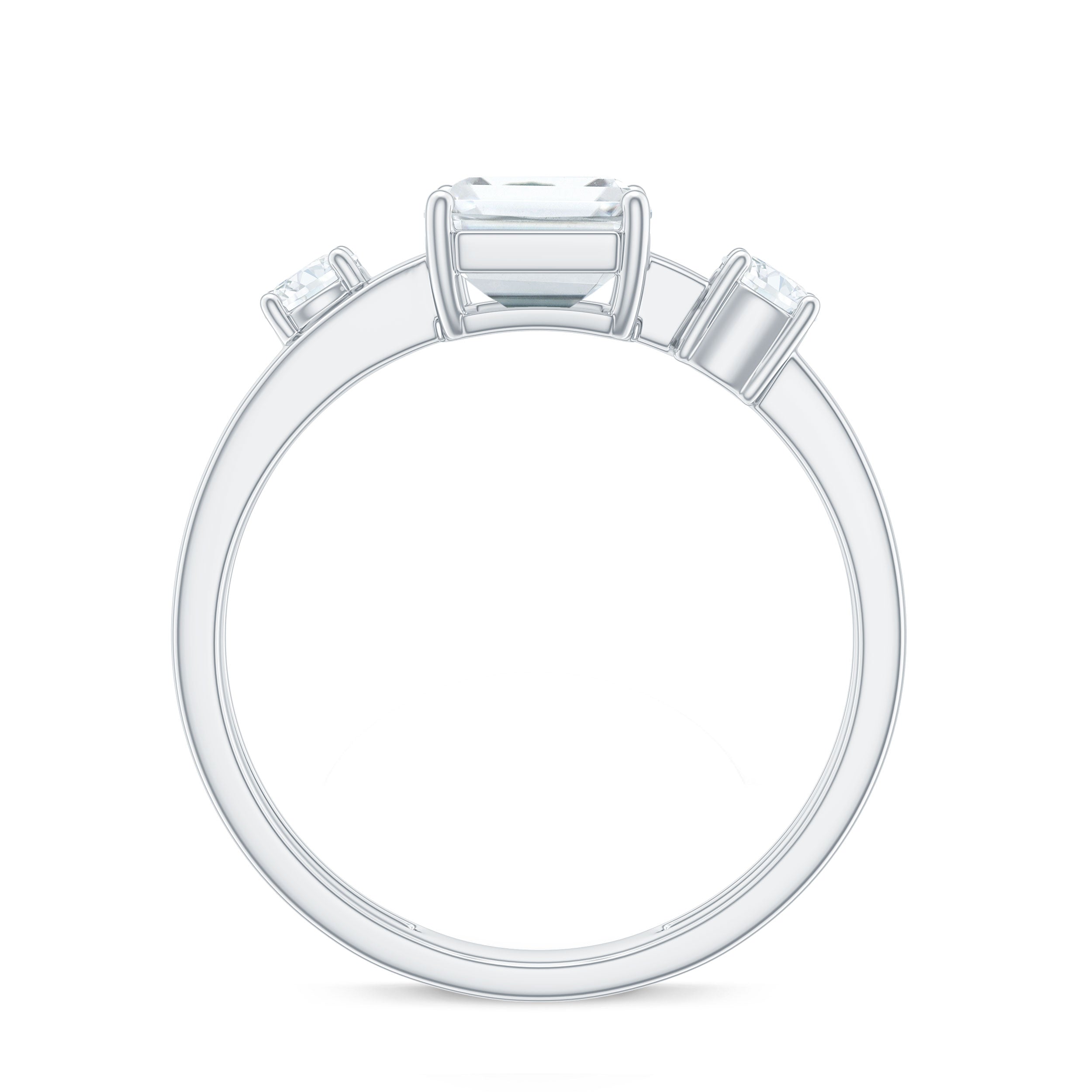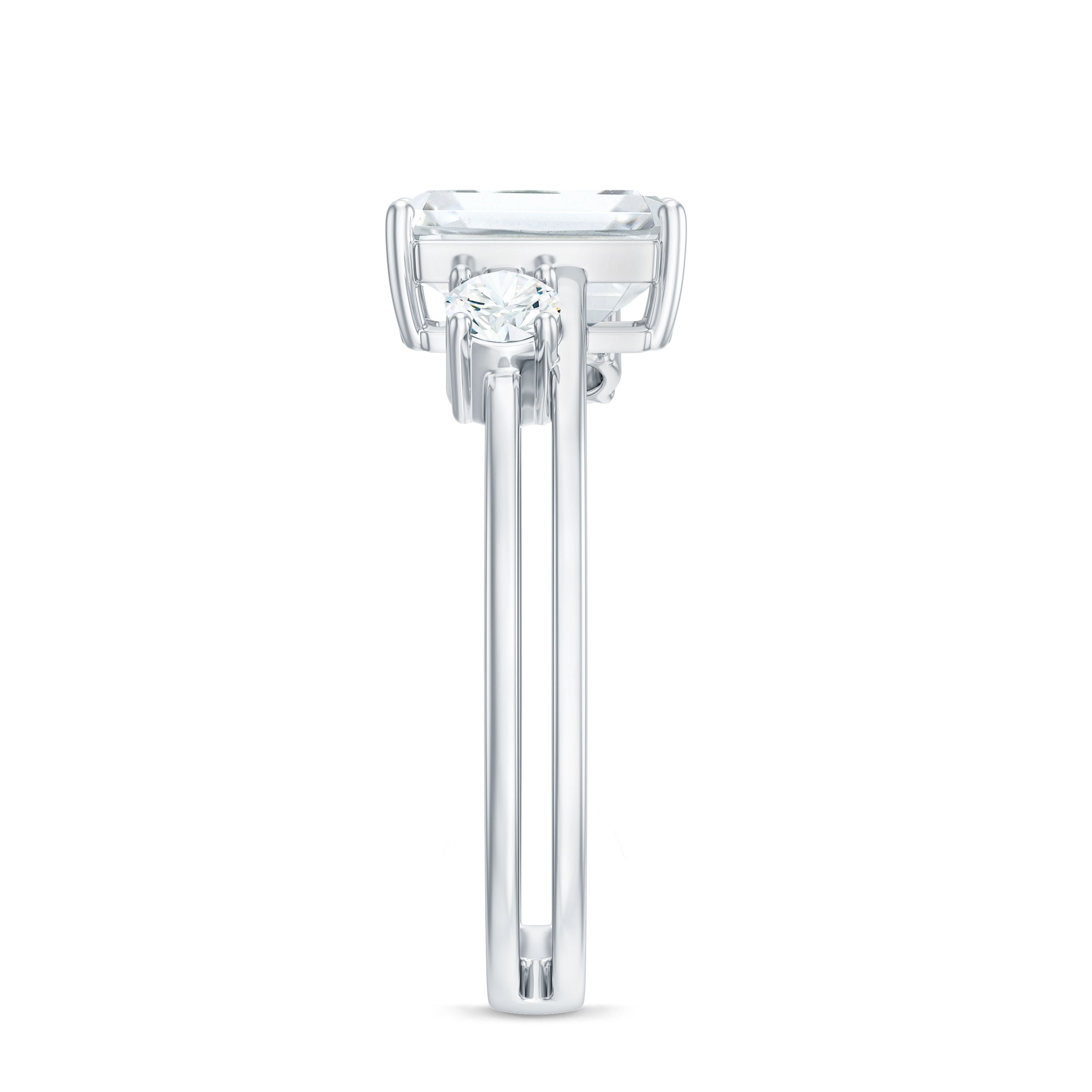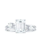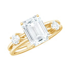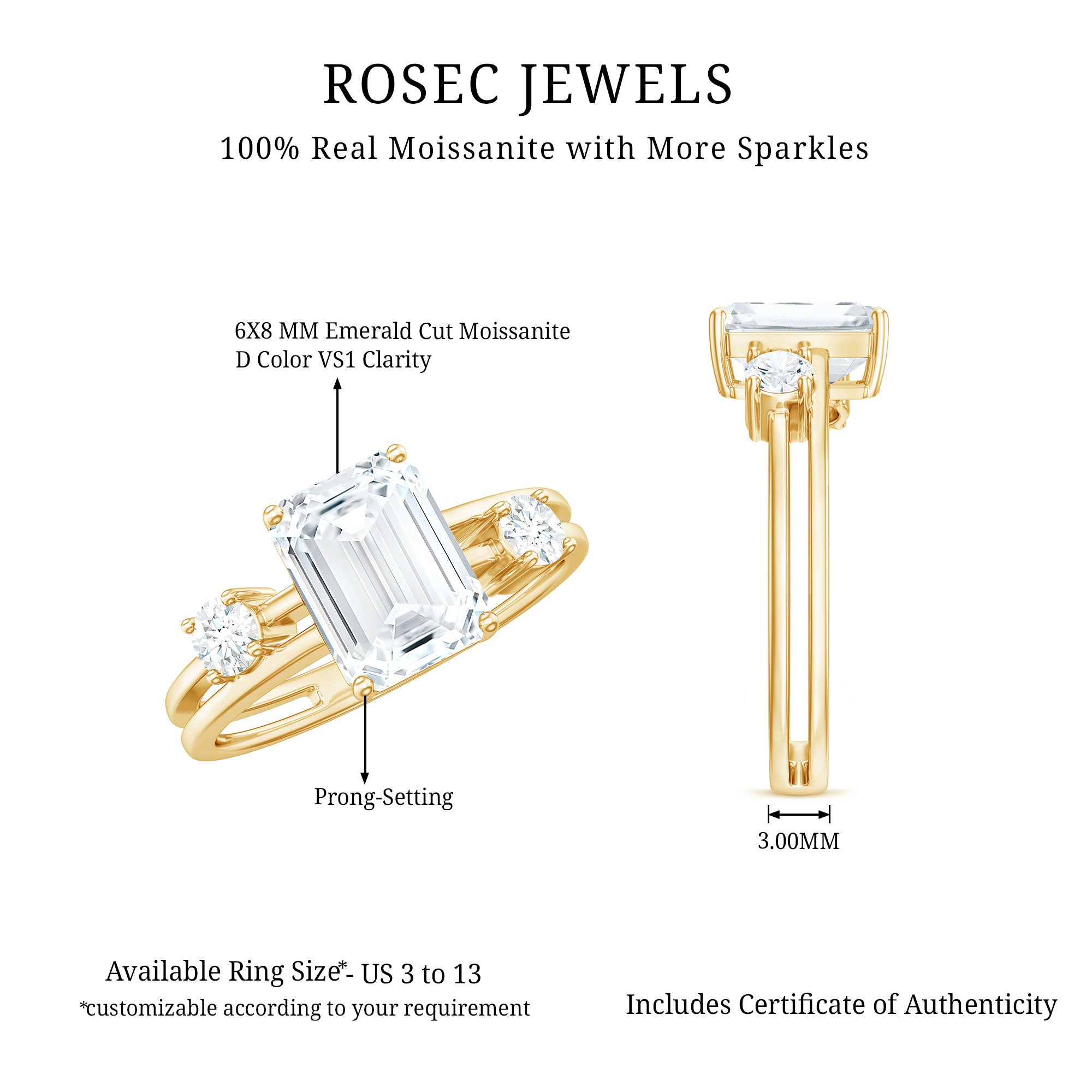 This stunning Moissanite Engagement Ring is a symbol of new beginnings, designed for this fresh chapter in your lives. Adorned with 6X8 MM Emerald Cut Moissanite in Prong Setting and Round Moissanite on Double Band shank will complete up your look. This timeless Solitaire Moissanite Ring can be dressed up with enhancers or your wedding bands too. The Double Band Engagement Ring carries a total weight of 2 Carat with a quality of D Color VS1 Clarity. Moissanite outshines other gemstones with a brilliance and fire even greater than that of a diamond, making it the one of the most sparkling gemstone. This Solitaire Engagement Ring comes with a gemstone certificate, assuring authenticity and exceptional craftsmanship, making it a true emblem of enduring beauty and elegance. Its intricate craftsmanship comes together to create a 2ct Moissanite Ring that will truly resonate with your heart.