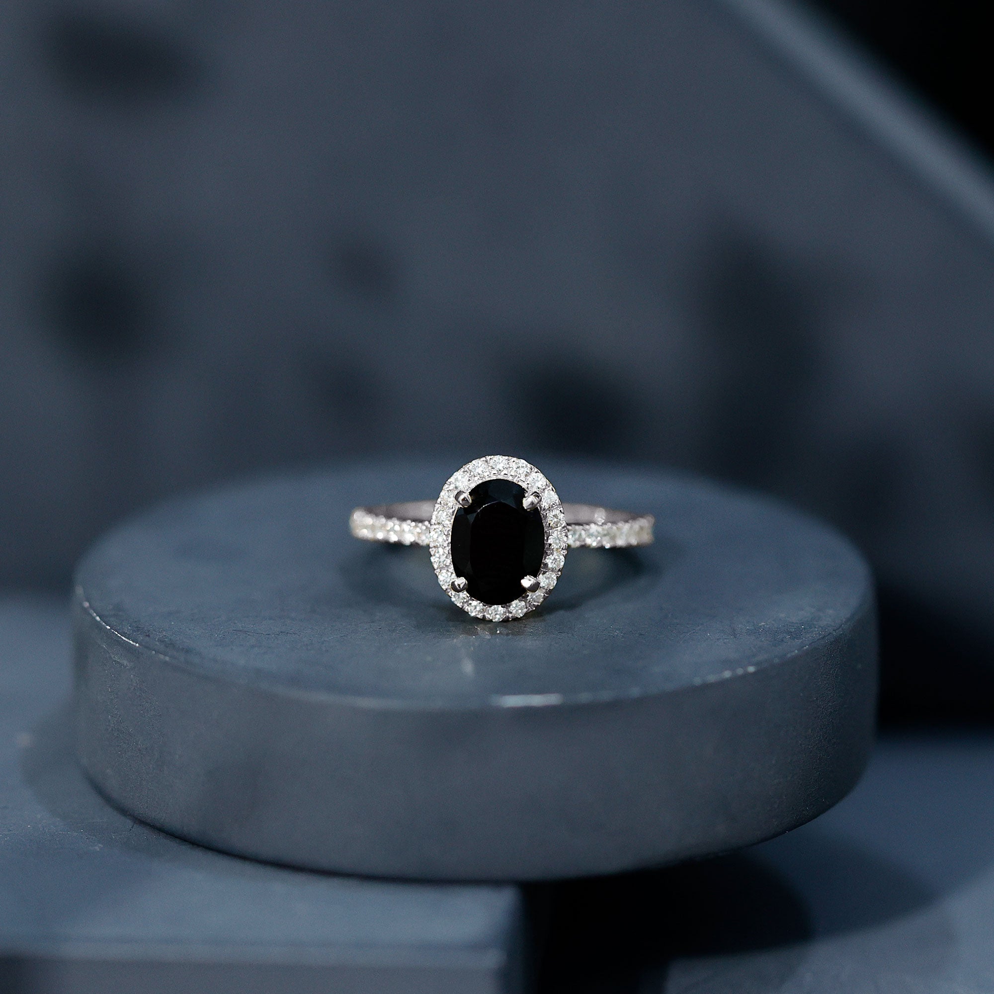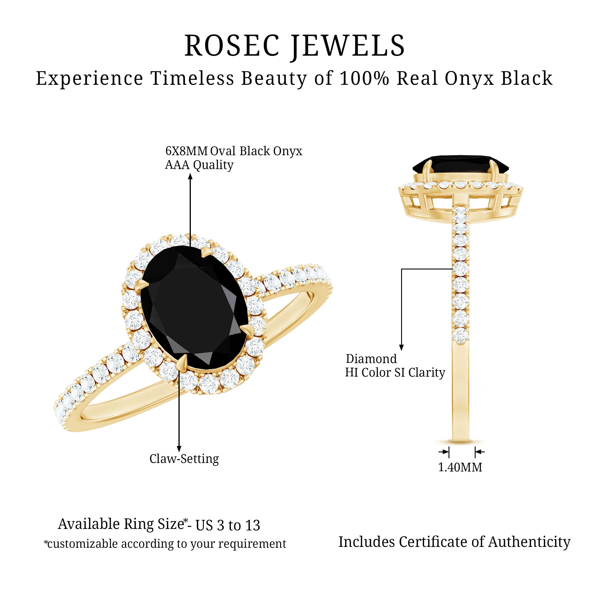This Oval Black Onyx Ring is designed for those who want something classic but with a modern design. At the center, you will find a stunning 6X8 MM oval cut black onyx securely set in strong claw setting and surrounded by a floating halo of sparkling round diamonds that add the perfect touch of shine. The diamond studded band continues the sparkle, making this Oval Shaped Engagement Ring glow from every angle. It is elegant, eye-catching, and totally unforgettable. The AAA quality black onyx gives the Halo Engagement Ring its bold and mysterious charm, while the HI-SI quality diamonds bring brilliant sparkle and lasting beauty. Whether you are marking a special moment, starting a new chapter, or simply love that black and white look, this Onyx and Diamond Engagement Ring is made to impress. It pairs bold style with timeless grace, perfect for someone who wants a ring that feels both chic and meaningful. This is not just another engagement ring. It is a symbol of love that is as fearless and one-of-a-kind as the person wearing it.
