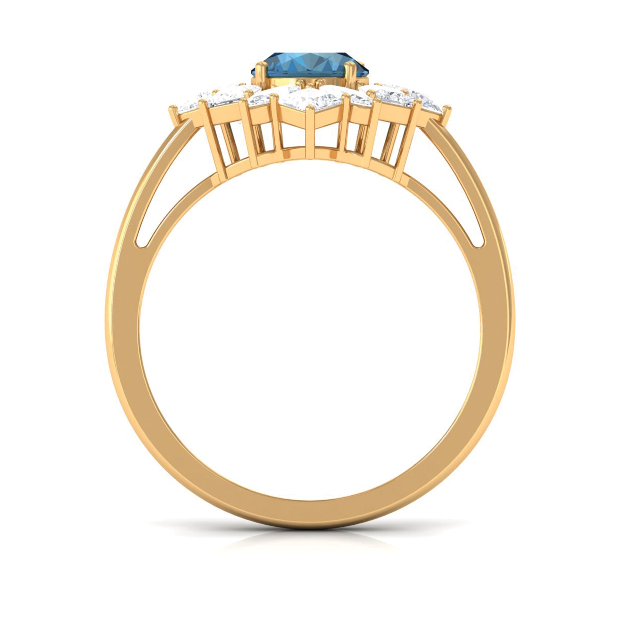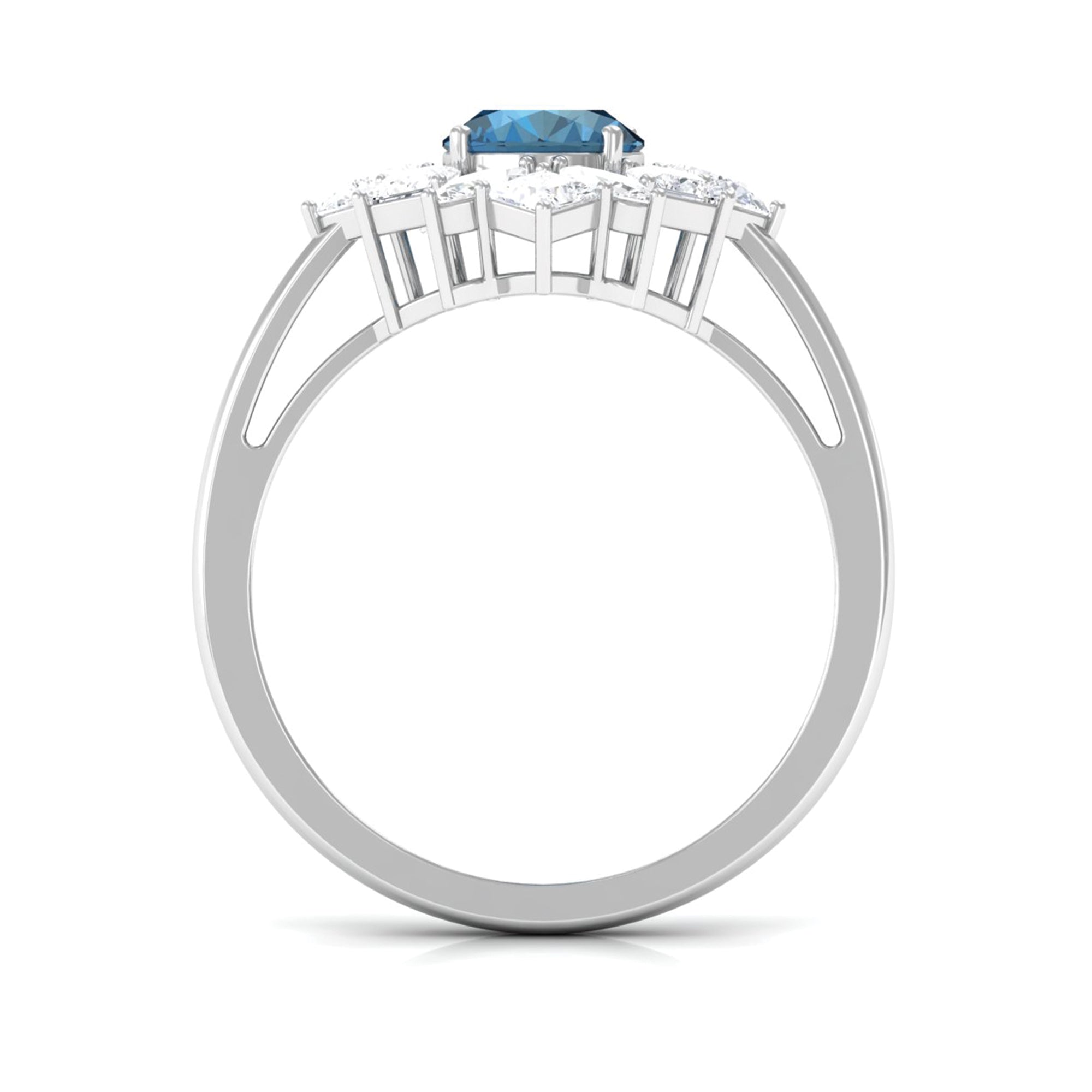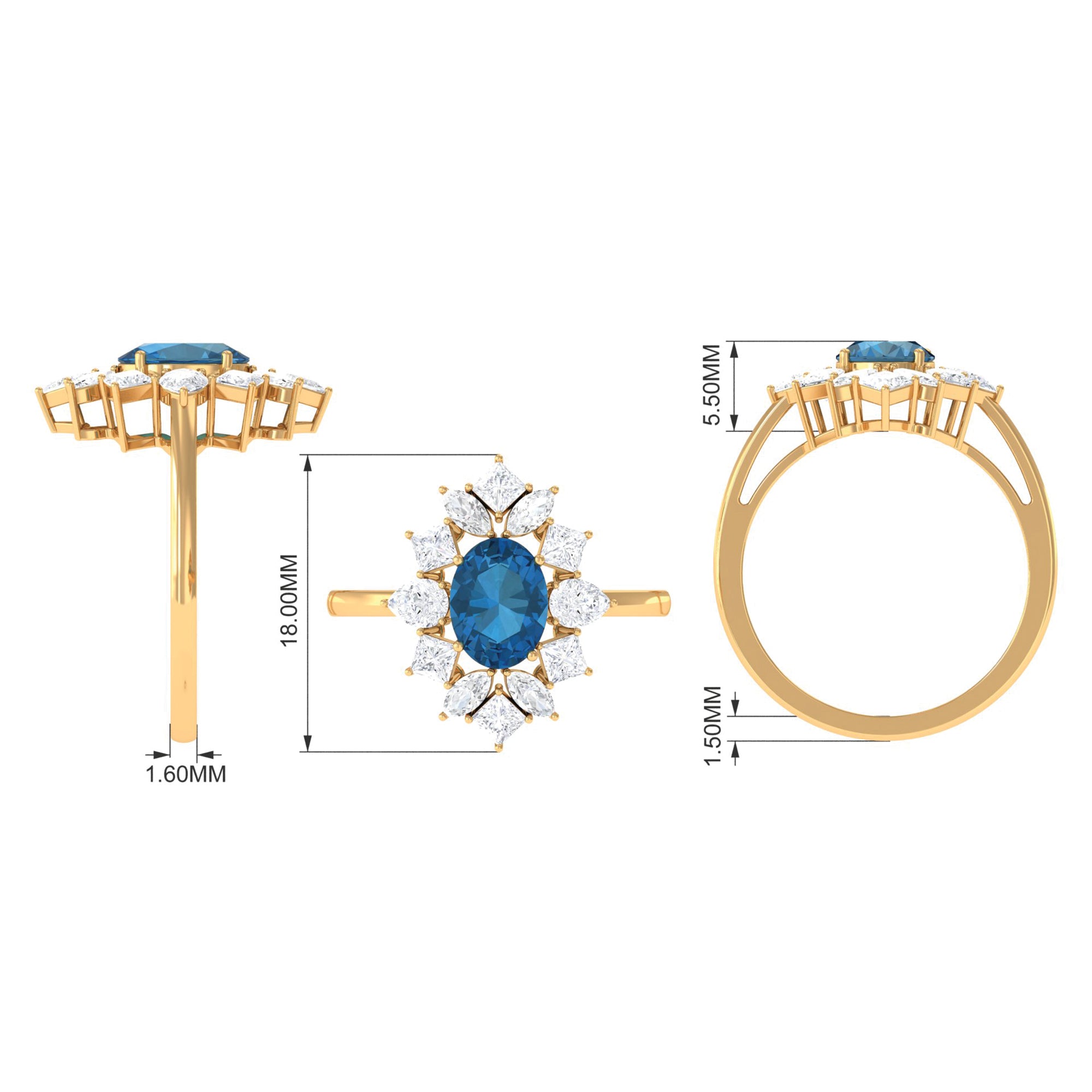 Prepare to capture attention with this stunning London Blue Topaz Statement Ring, an ideal accessory for your upcoming special event. At its heart lies a striking 6X8 MM oval cut London Blue Topaz that captivates with its vibrant blue brilliance. This AAA quality topaz boasts exceptional color and clarity, imparting a sense of richness and luxury. The topaz is elegantly encircled with marquise, oval, princess and pear cut moissanite stones, encircling the central stone is a halo style, contributing the perfect touch of sparkle to enhance the overall radiance of the ring. The sleek band maintains an elegant and harmonious appearance, allowing the topaz to take center stage. Whether you are preparing for an evening affair or simply wish to elevate your style, this Oval Engagement Ring is an excellent selection. It is bold, sophisticated, and effortlessly stylish, perfect for women who appreciate jewelry that makes a statement while remaining refined. This Statement Ring is not merely beautiful; it serves as a conversation starter. Crafted for both comfort and elegance, it fits exquisitely and is comfortable to wear throughout the day or night. Ideal as a gift or a personal indulgence, it arrives in a charming box, ready to impress from the moment it is unveiled.