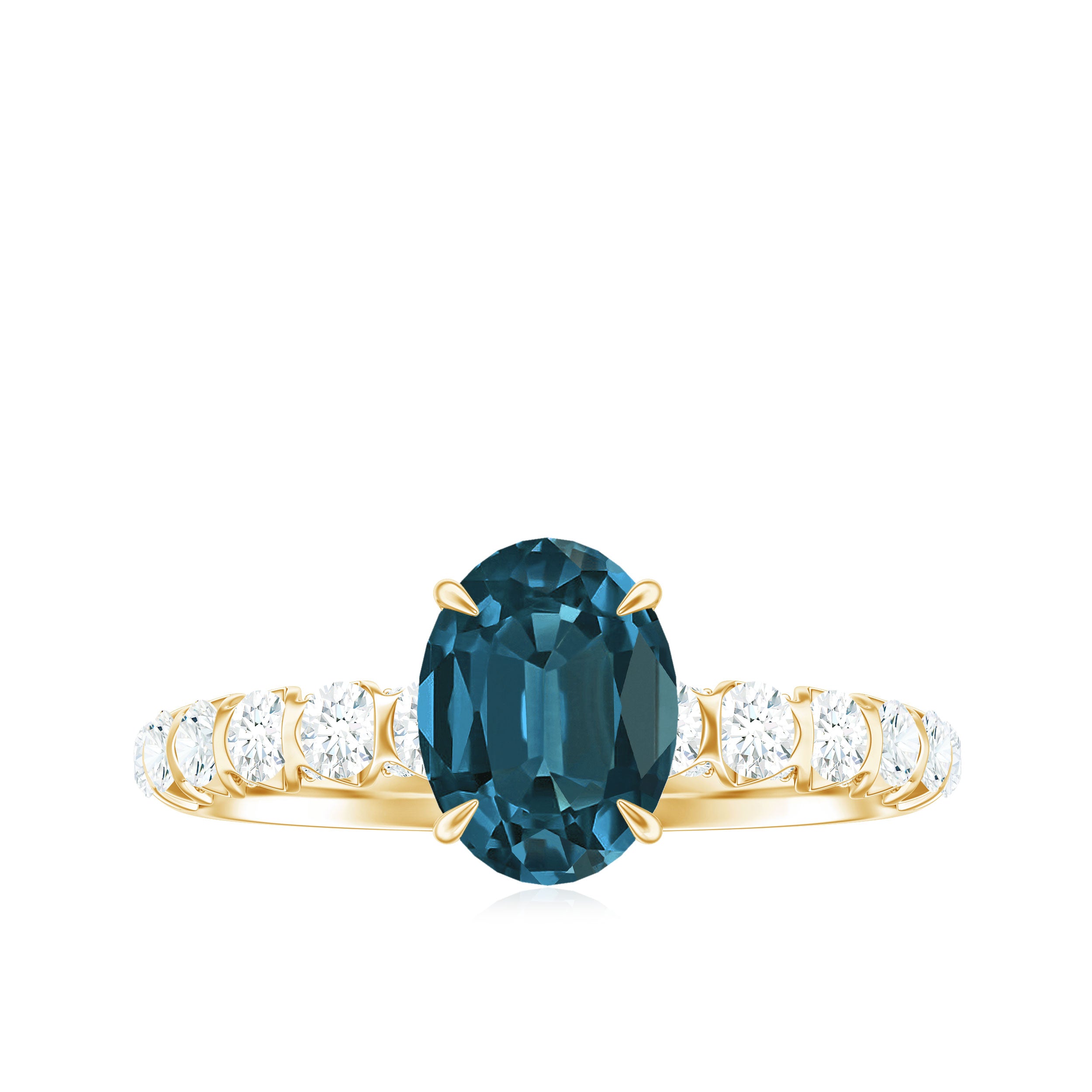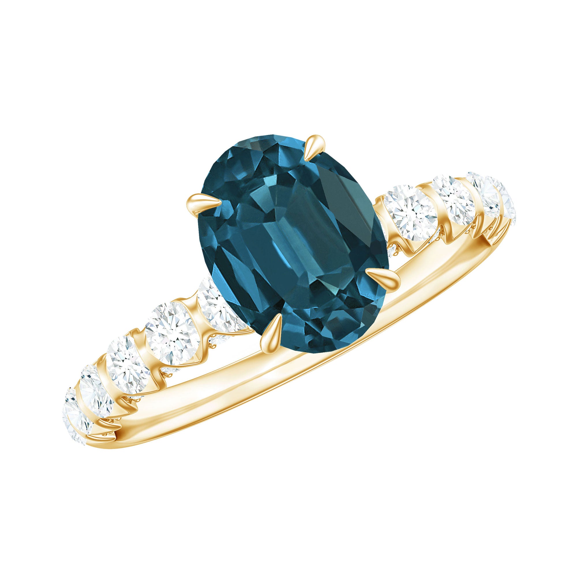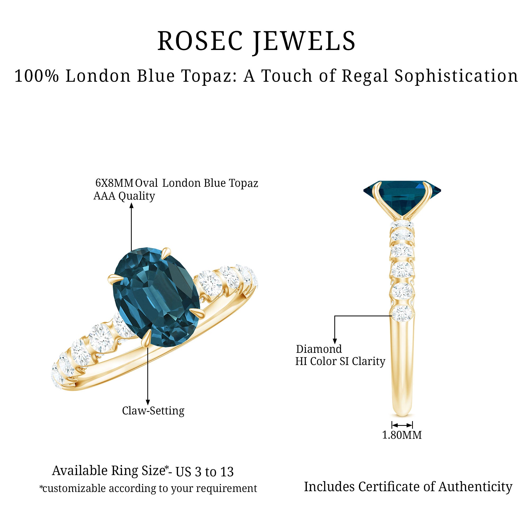 6X8mm Oval Cut London Blue Topaz Solitaire Engagement Ring with Diamond Side Stones