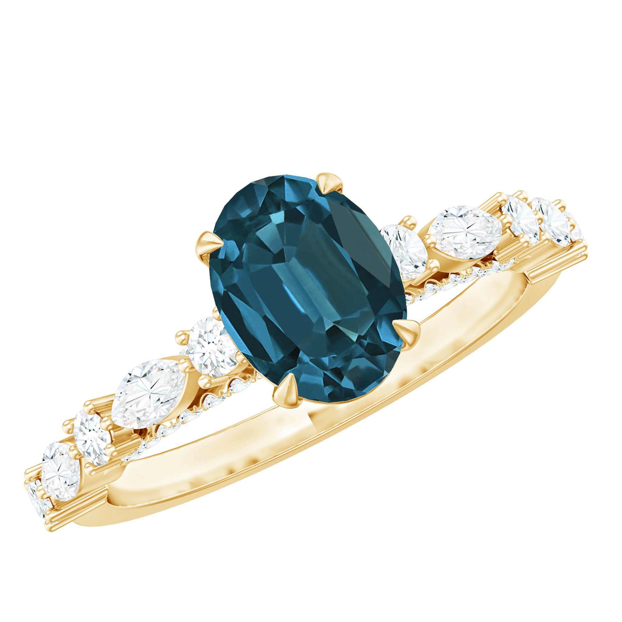 This engagement ring highlights a 6x8 mm oval London blue topaz as its central gemstone. The elongated oval shape enhances the gemstone’s rich blue tone while creating a balanced and graceful appearance. Its deep color brings a distinctive character to the ring, offering a refined alternative to traditional engagement gemstones.