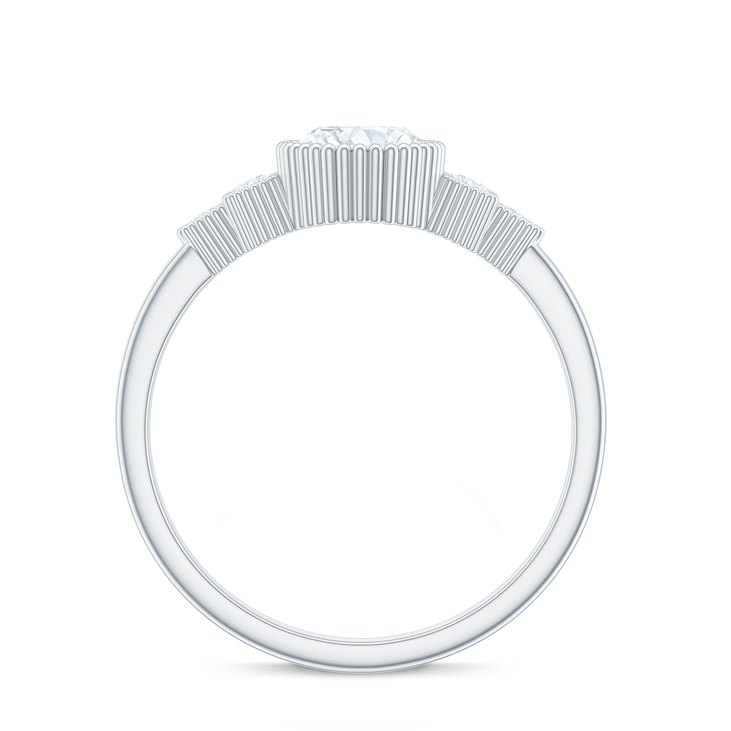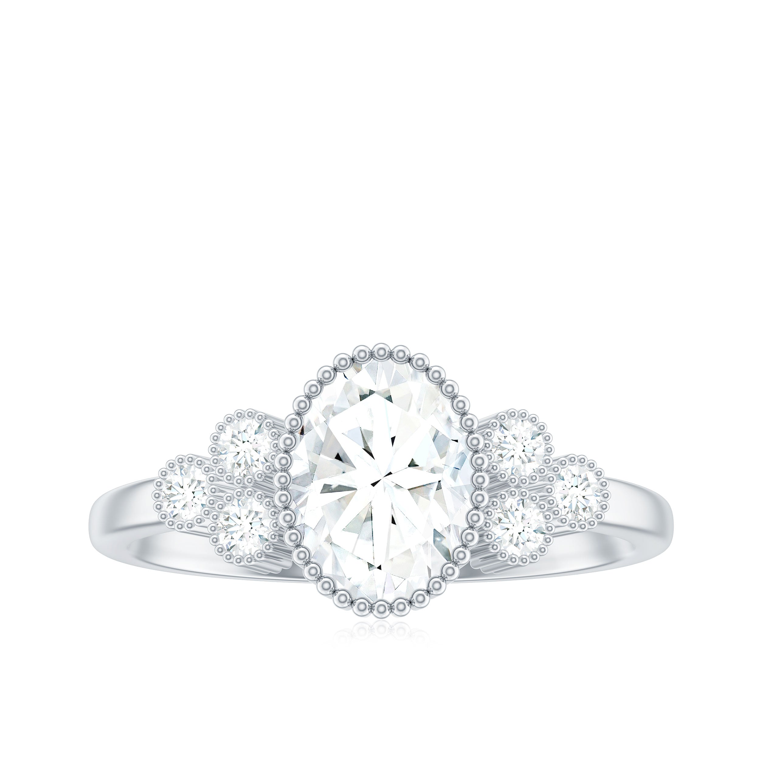 If elegance defines your style, then this Moissanite Engagement Ring is undoubtedly a must-have addition to your jewelry collection. It features a 6X8 MM Oval Cut Moissanite set in a Beaded Bezel, complemented by a trio of Round Moissanite stones on either side of the shank, making this Cluster Engagement Ring a truly unique piece. This Moissanite Wedding Ring will always hold a special place in her heart, it has a total weight of 2 Carats and boasts a quality rating of D Color with VS1 Clarity. All our gemstones are authentically certified and undergo rigorous quality checks. Presented in an exquisite jewelry box, this Oval Engagement Ring with Side Stones is perfectly poised to capture hearts during significant events such as proposals, anniversaries, birthdays, or any memorable occasion. Offered in a wide array of US sizes ranging from 3 to 13, this Oval Cut Moissanite Ring is handcrafted to ensure a comfortable fit while looking breathtaking on any hand. Designed for dreamers, romantics, and those with a sense of adventure, this Designer Engagement Ring not only glimmers but also conveys a powerful message.