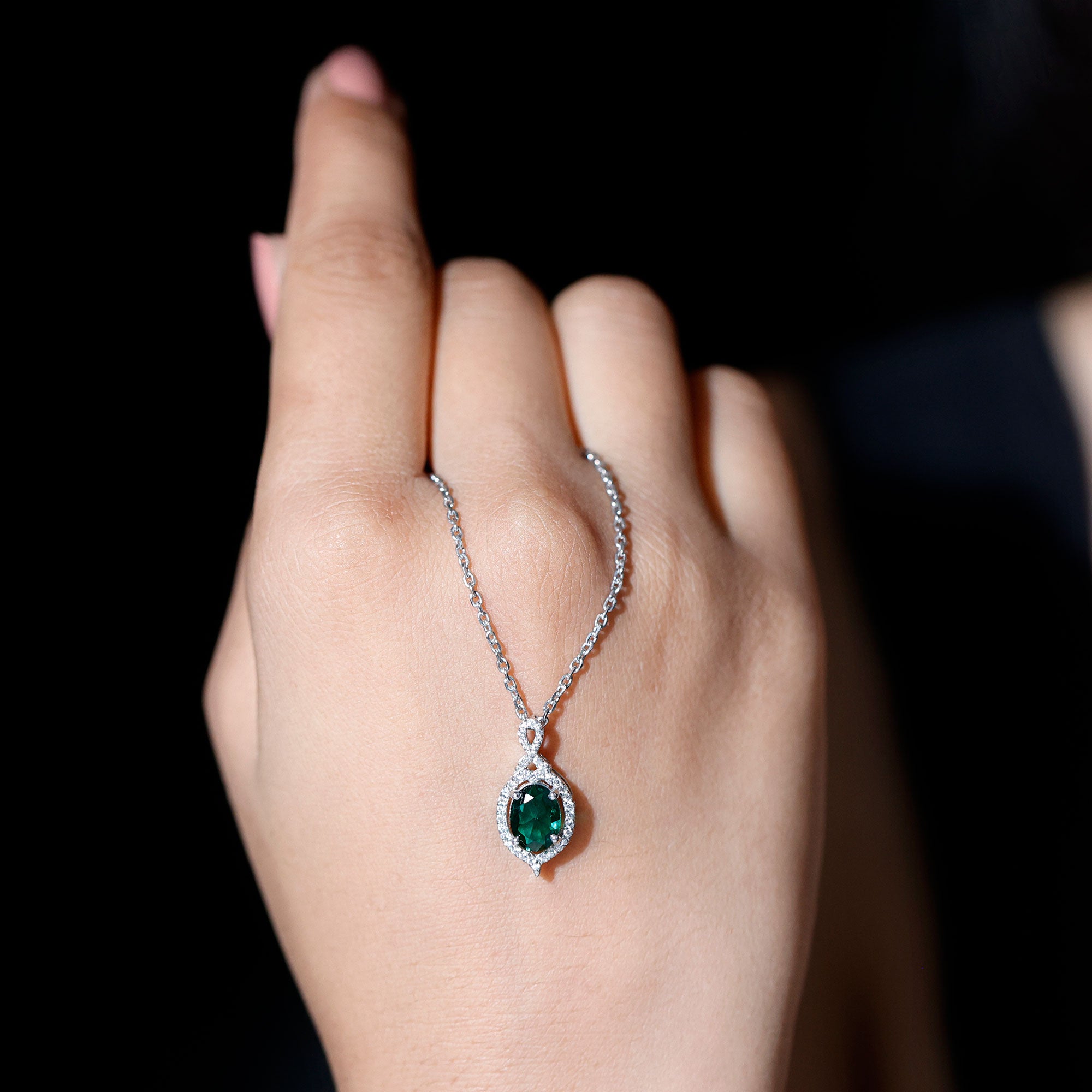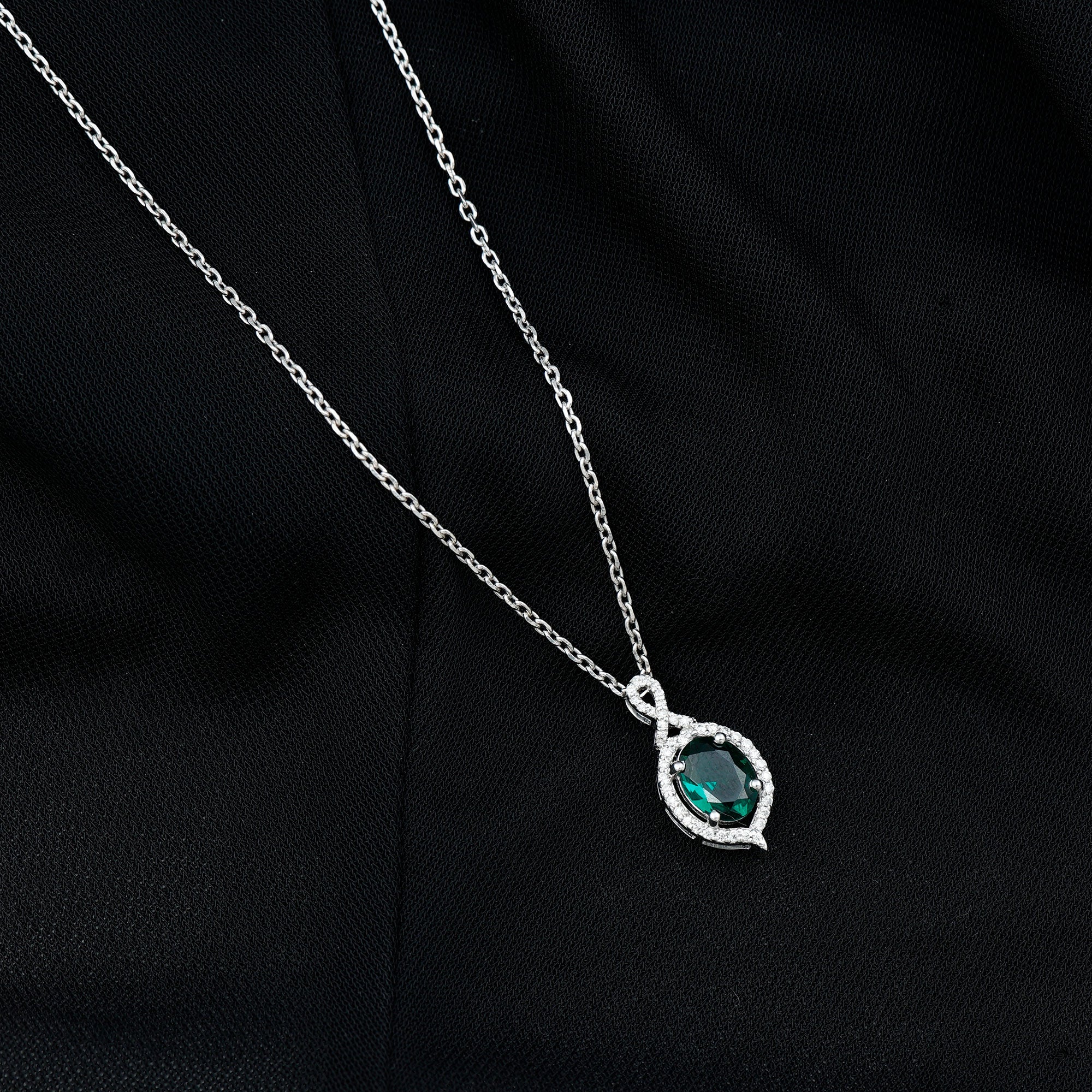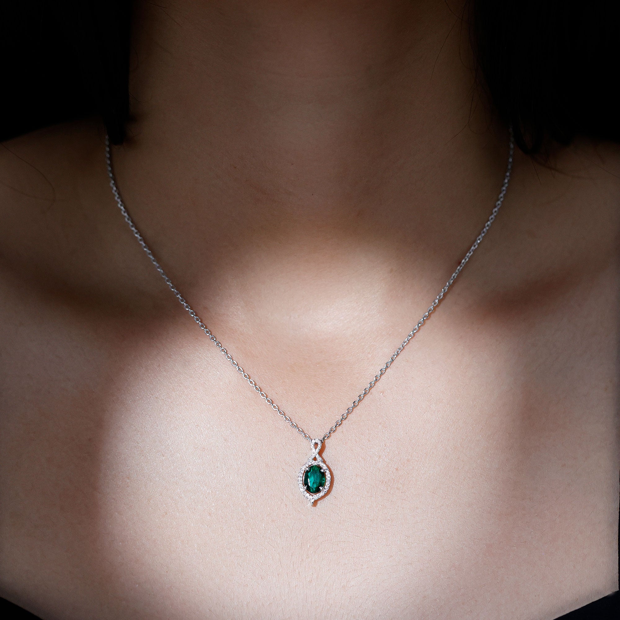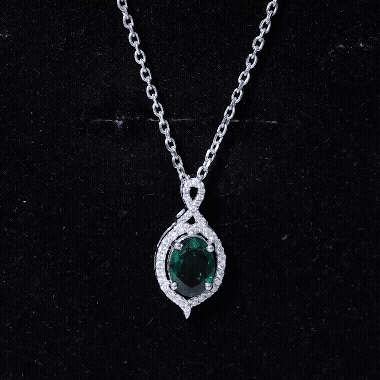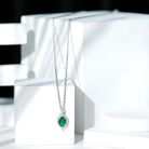 Discover the enchanting beauty of our Lab Grown Emerald Pendant Necklace, made from stunning 14k white gold plated sterling silver. Embellished with sparkling moissanite stones and a vibrant lab grown emerald, this Antique Necklace is crafted to leave a lasting impression and elevate any outfit. The pendant showcases a refined design, featuring a prong set 6X8 MM oval cut lab-created emerald at its center, surrounded by small moissanite gems, which also adorn the unique bail for added brilliance. With its subtle old-world charm, this Emerald and Moissanite Necklace beautifully enhances your style. The deep green hue of the emerald radiates elegance and charm, making it a perfect accessory for any occasion. This Emerald Vintage Necklace is suitable not only for everyday wear but also for cocktail parties as a stylish fashion statement, as a gift for birthdays, anniversaries, or Valentines Day to someone special, or even worn on your wedding day for a stunning contrast.