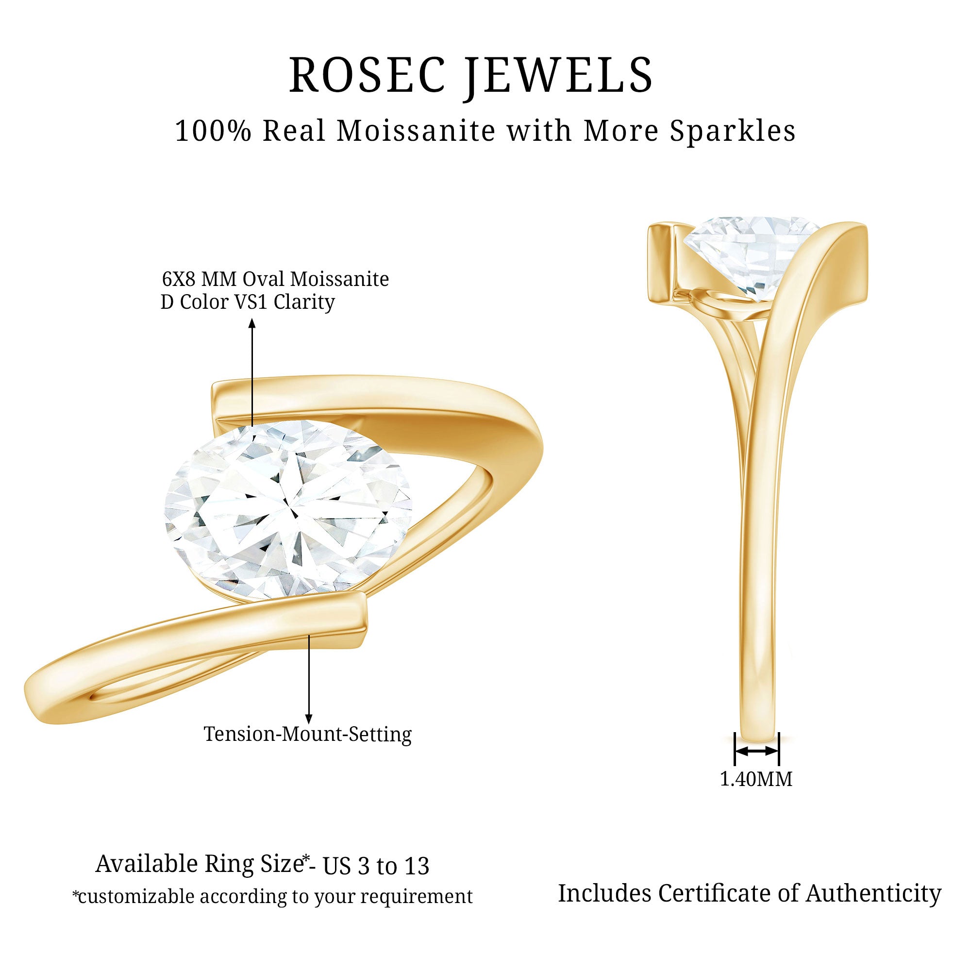Turn every gaze with this brilliant Moissanite Engagement Ring – A True Solitaire Stunner. Elevate your love story with this 6X8 mm oval cut D-VS1 Quality Moissanite solitaire engagement ring, thoughtfully crafted to capture every heartbeat of your devotion. Designed in a striking bypass shank ring style, its fluid silhouette elegantly cradles the centerpiece, creating a seamless dance of brilliance and emotion. The tension mount setting secures the dazzling moissanite in a way that enhances its fire and clarity, delivering a powerful visual impact in every glance. With a target weight of 1.29 ctw, this east west moissanite ring brings a bold twist to classic romance, making it the perfect symbol for your forever. Whether youre drawn to solitaire rings for women or seek a modern bypass engagement ring, this piece radiates timeless charm with contemporary elegance. Celebrate your engagement with a ring that redefines expectations – a radiant promise, a modern masterpiece, and a dazzling reflection of your journey ahead.