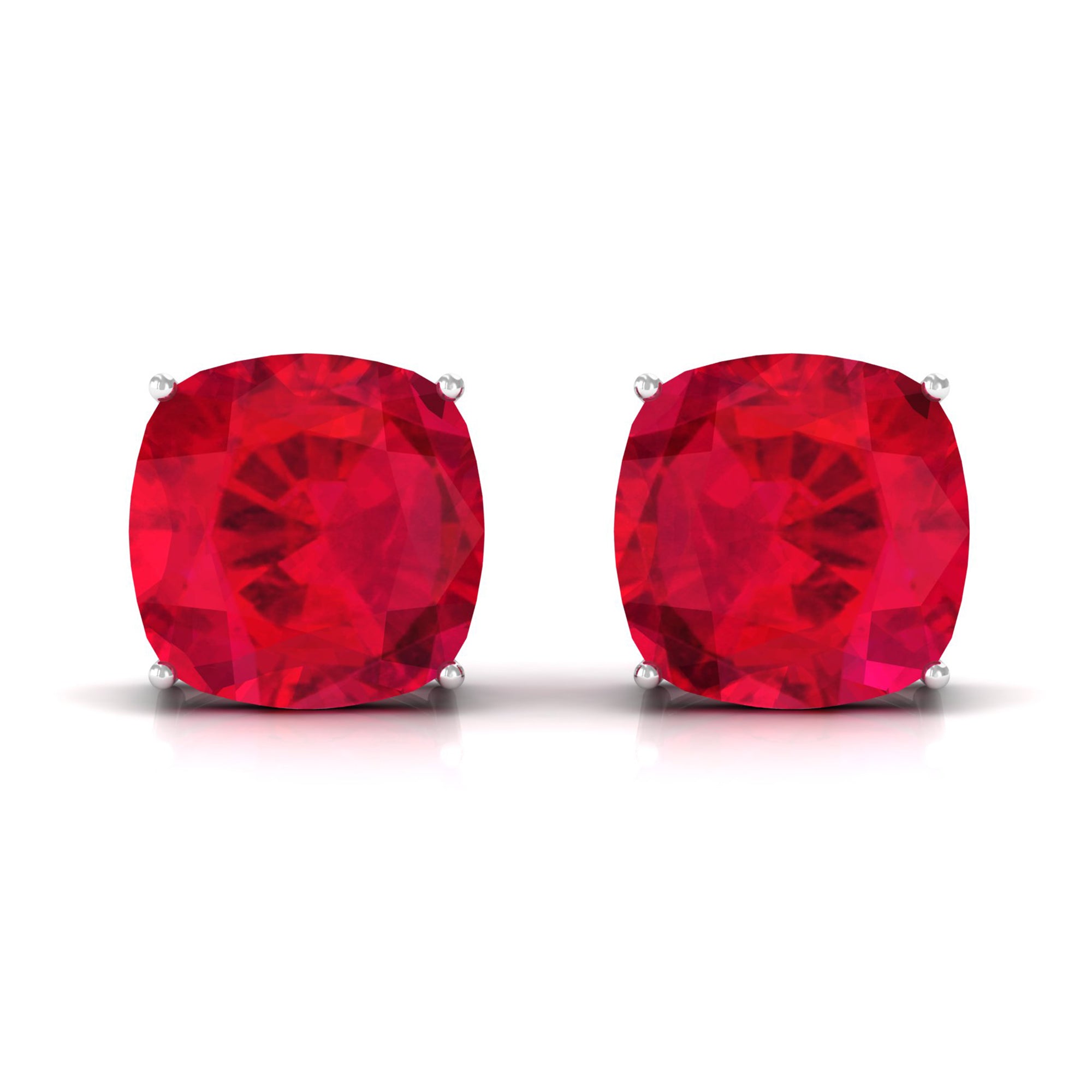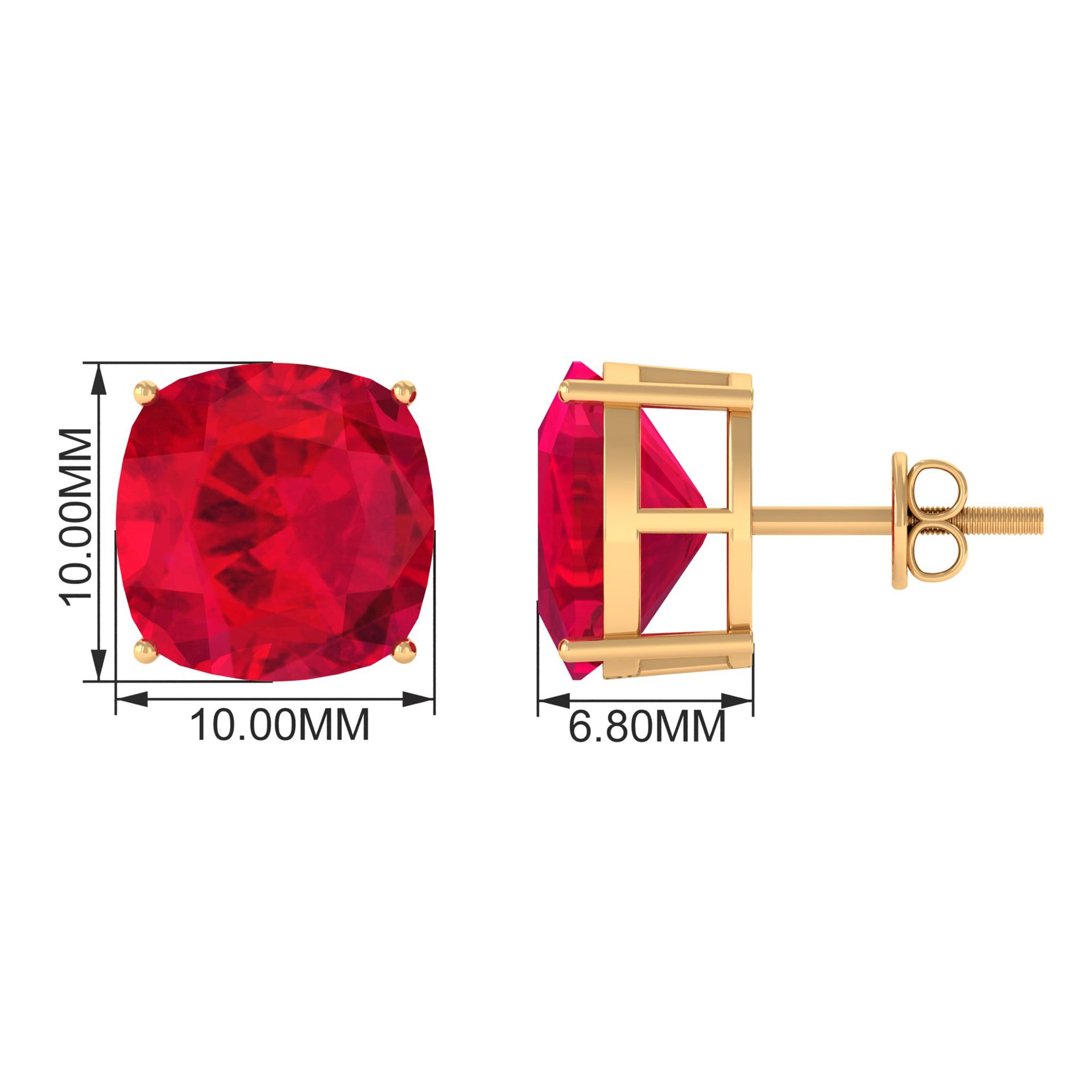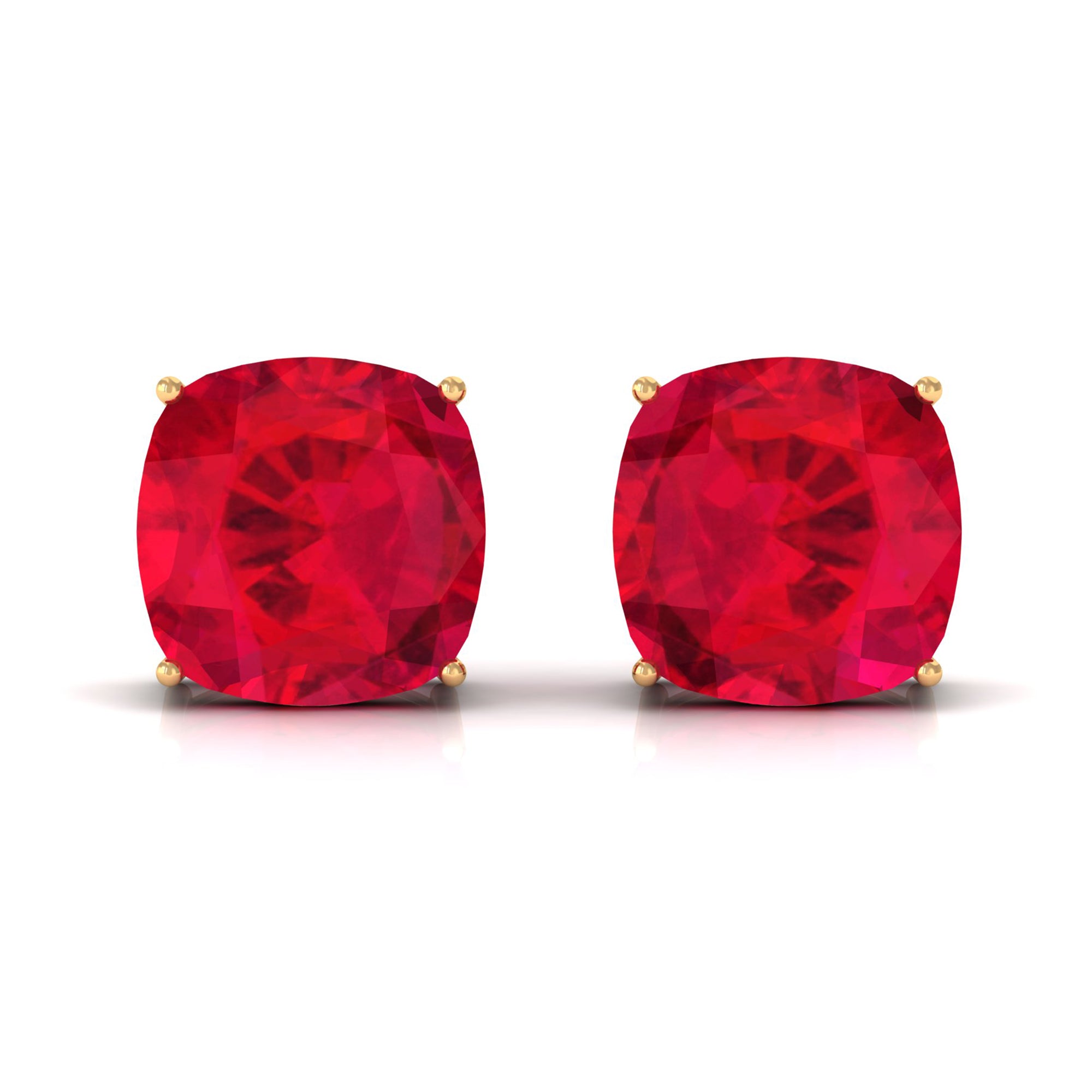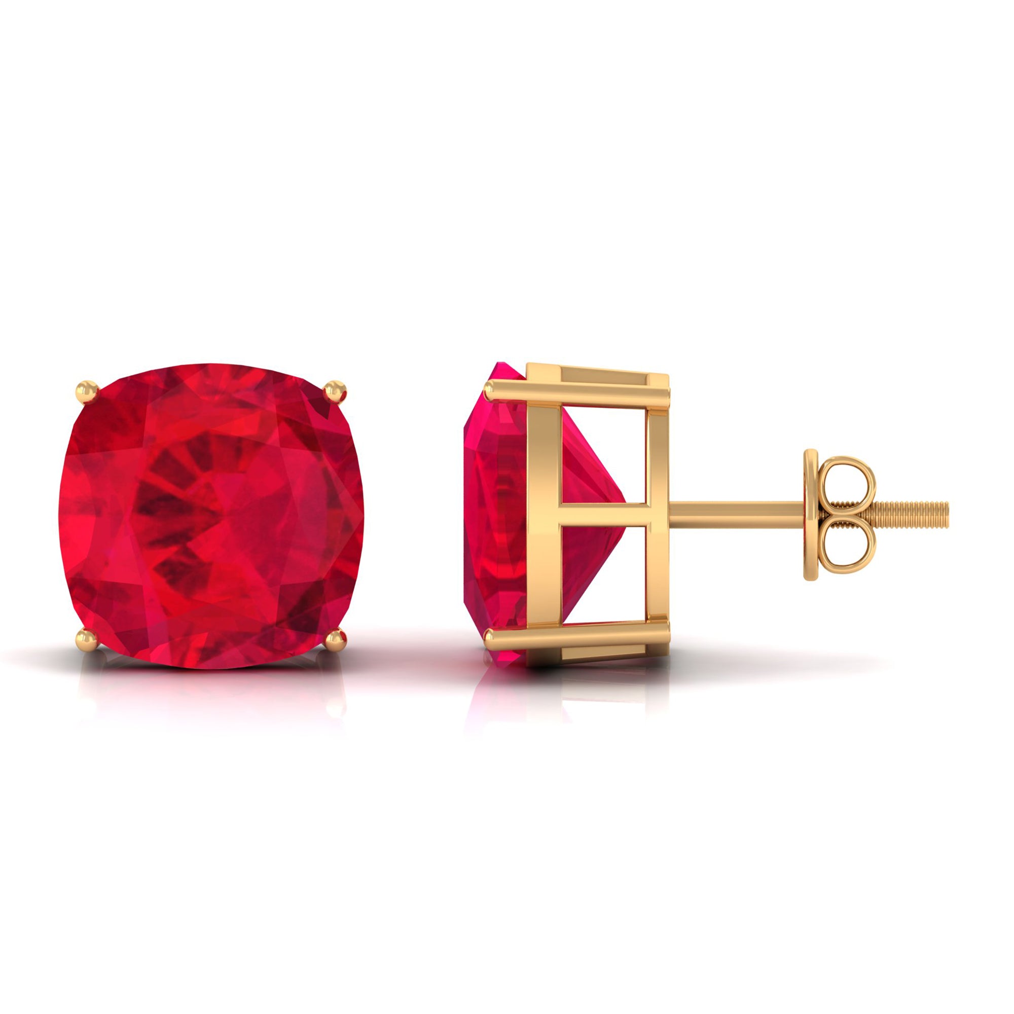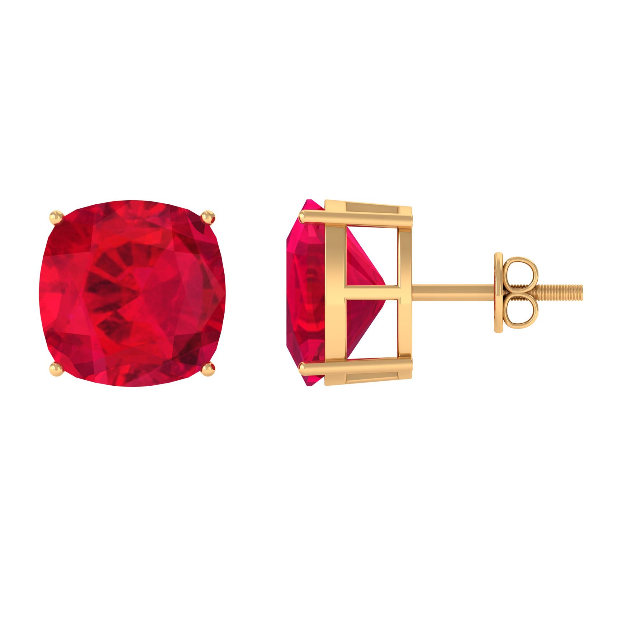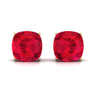 Be Dazzle and Grace your look with these Beautiful Solitaire Stud Earrings. The Screw Back Finding Stud Earrings are embellished with 10x10 MM Cushion Cut Lab Created Ruby as Solitaire in 4 Prong Setting. Solid Gold composition Enhance the Over all Look of the Jewelry Piece.