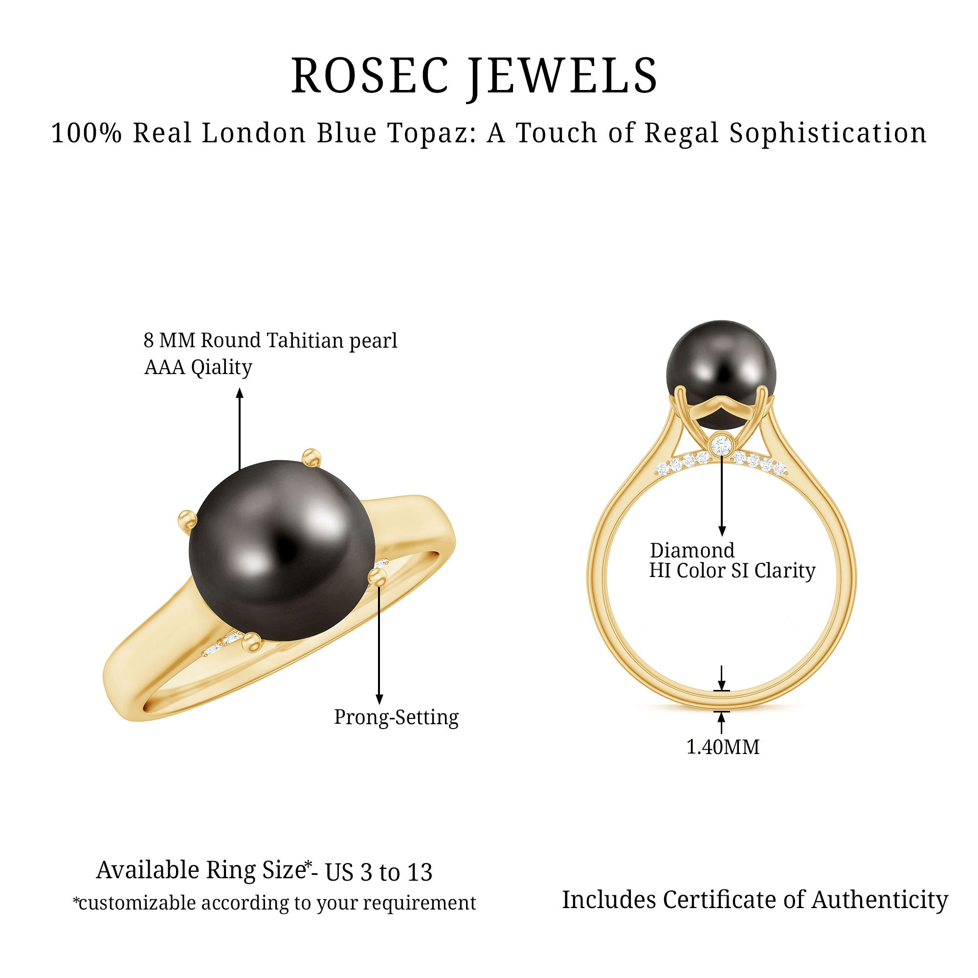 A dazzling classic, this Solitaire Tahitian Pearl and Diamond Ring is ready for every beautiful moment. Tahitian Pearl - Tahitian Pearl exhibits AAA Quality and possess exotic color. Semi-Precious June Birthstone summons intelligence, and prosperity. It is Natural and Certified, helps in boosting vitality of the wearer. Its huge range of colorful overtones makes it a captivating and desirable gem. Diamond - HI-SI Quality exhibited by Brilliant Cut Diamond give justice to its incredible value. Diamond summons beauty, attractiveness and unbreakable love. It is Certified and helps in bringing success and luxury to the wearer. Its Durability and Luster is enhanced by Lab Created Treatment, to further make it a captivating and desirable gem.