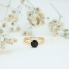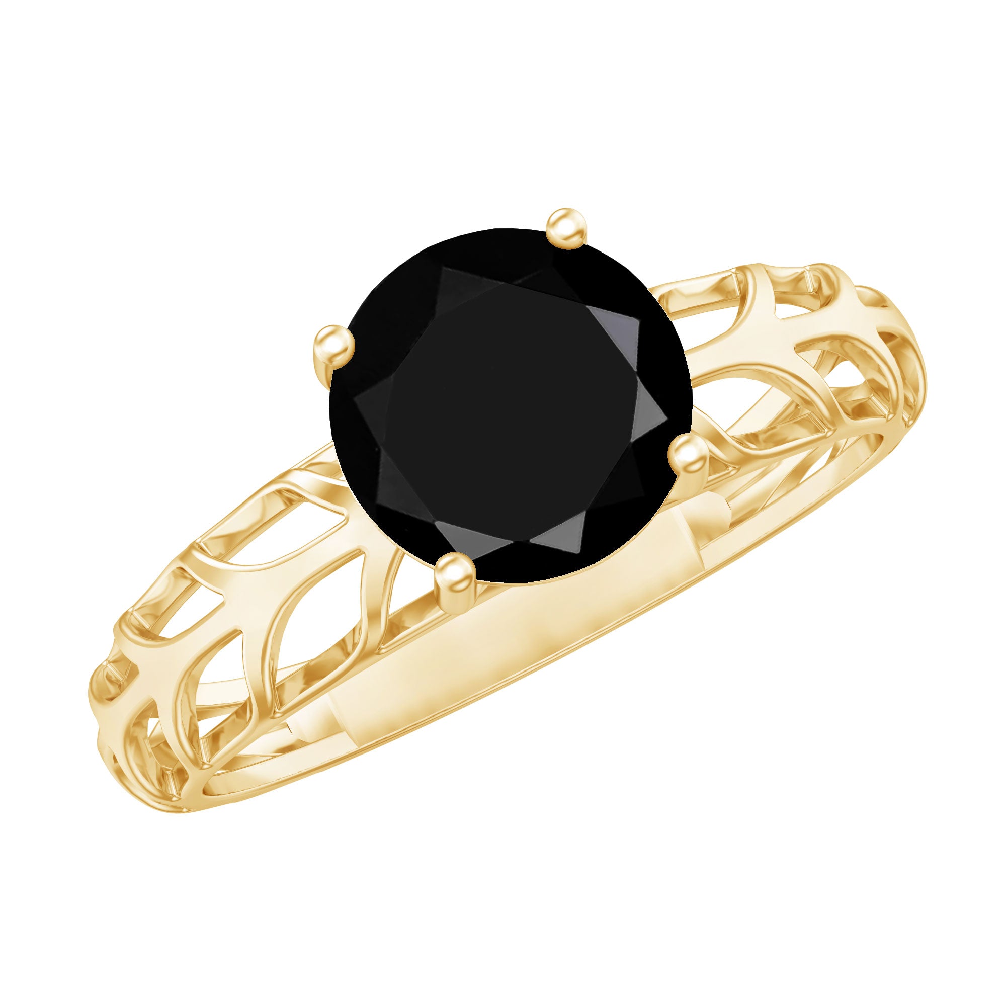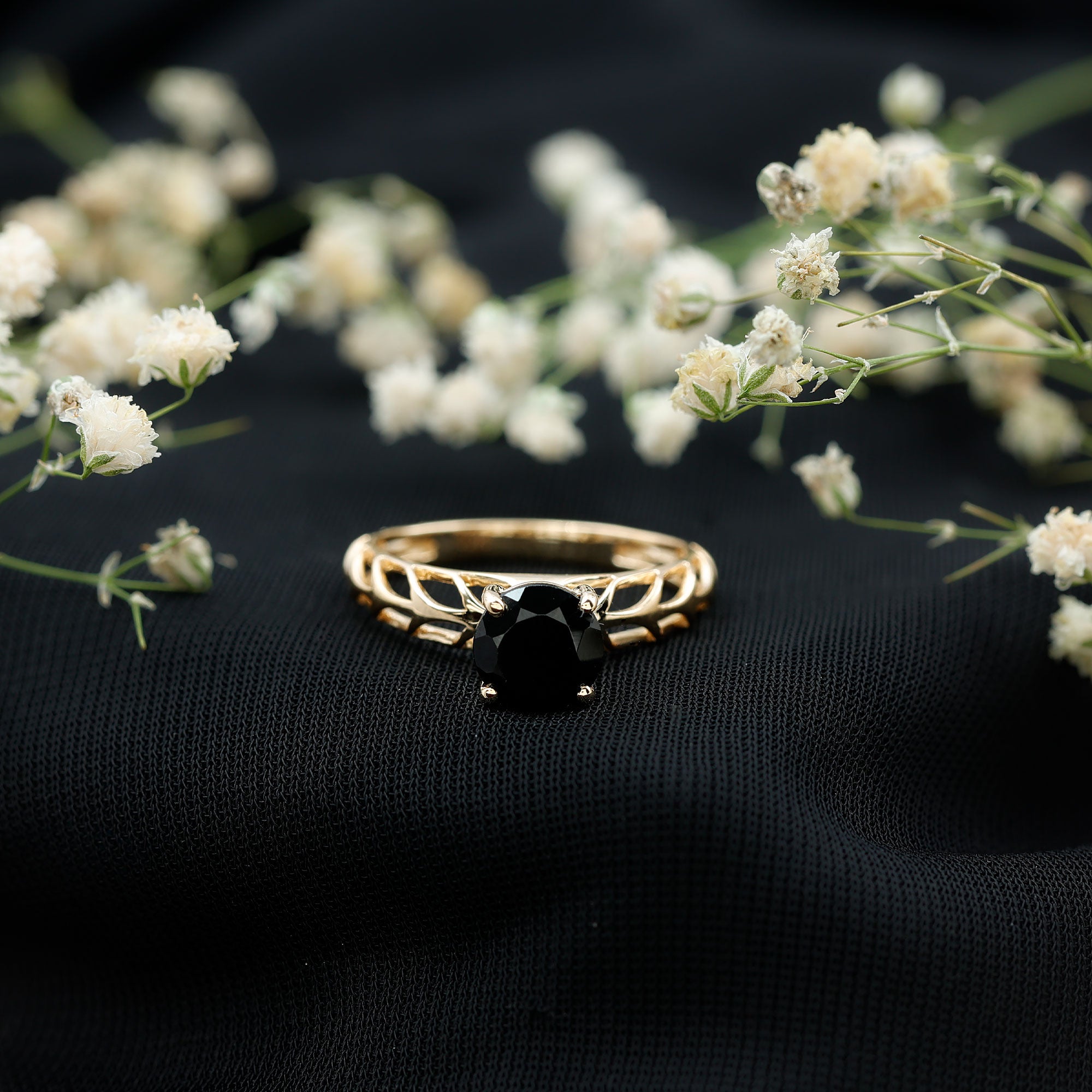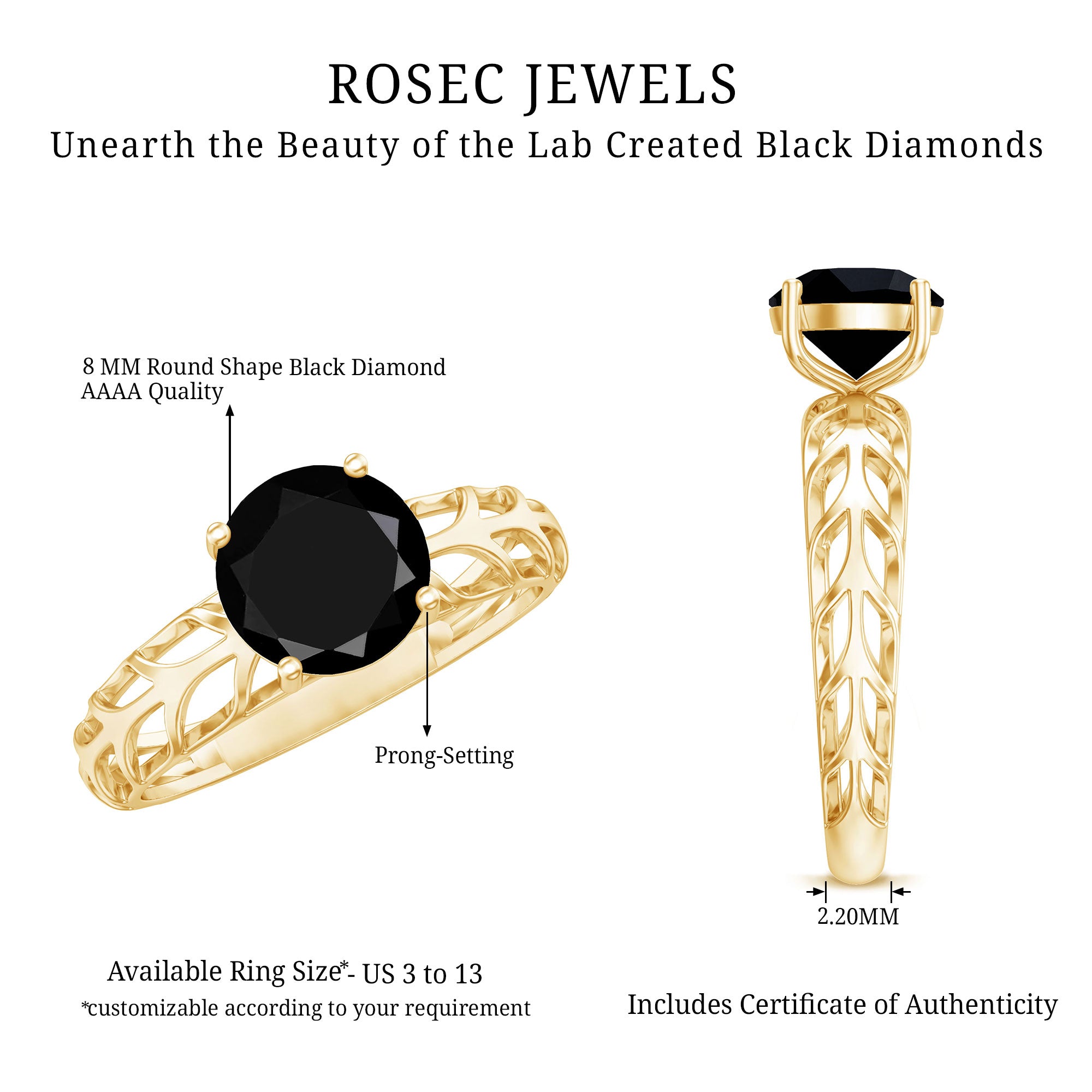 Embrace sophistication with this stunning Black Solitaire Ring. A 7 MM Round Shape Created Black Diamond set as a center stone in Prong Setting that exudes timeless beauty. The cutout pattern on shank of this ring symbolizes both modernisms and vintageness.