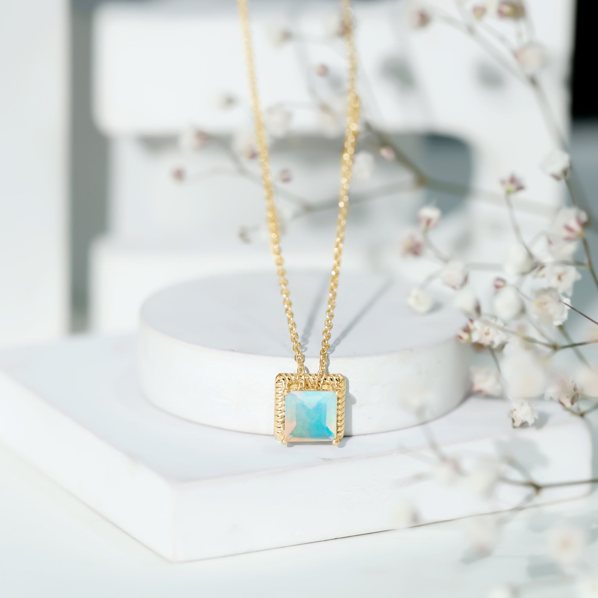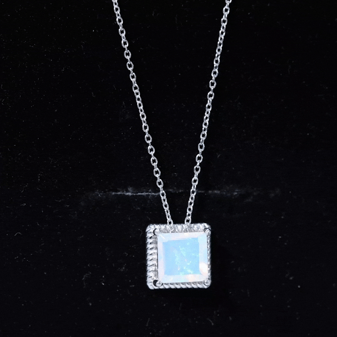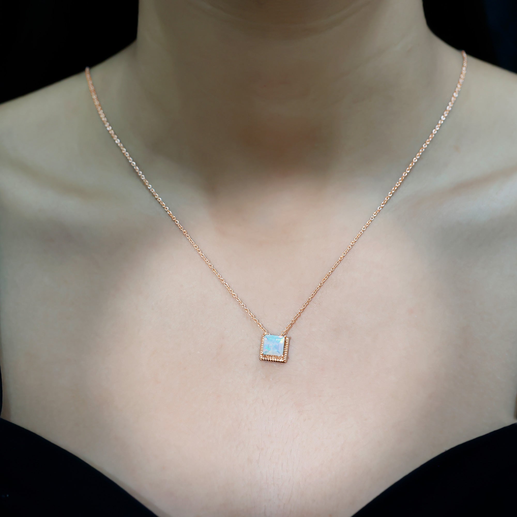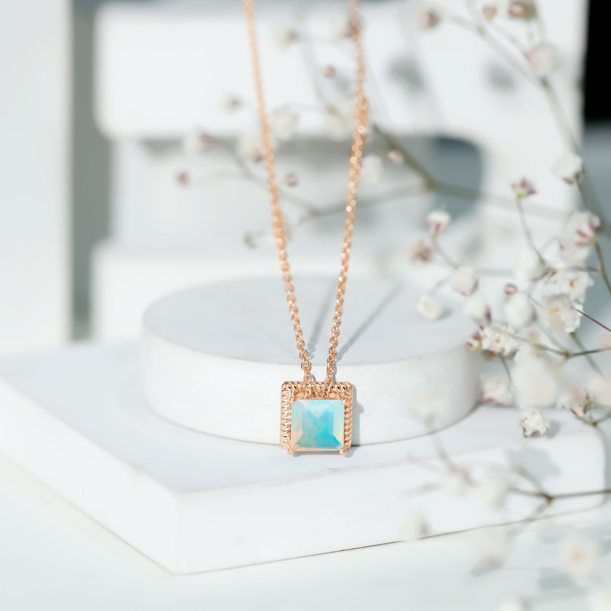 This Ethiopian Opal Pendant is a shiny and glossy jewelry. It features with Princess Cut Ethiopian Opal in Rope Frame in 4 Prong Setting on Solitaire Pendant. It is crafted in Solid Gold on Gold Solitaire Pendant. Gift your lady this mesmerizing Birthday Pendant on her special day.