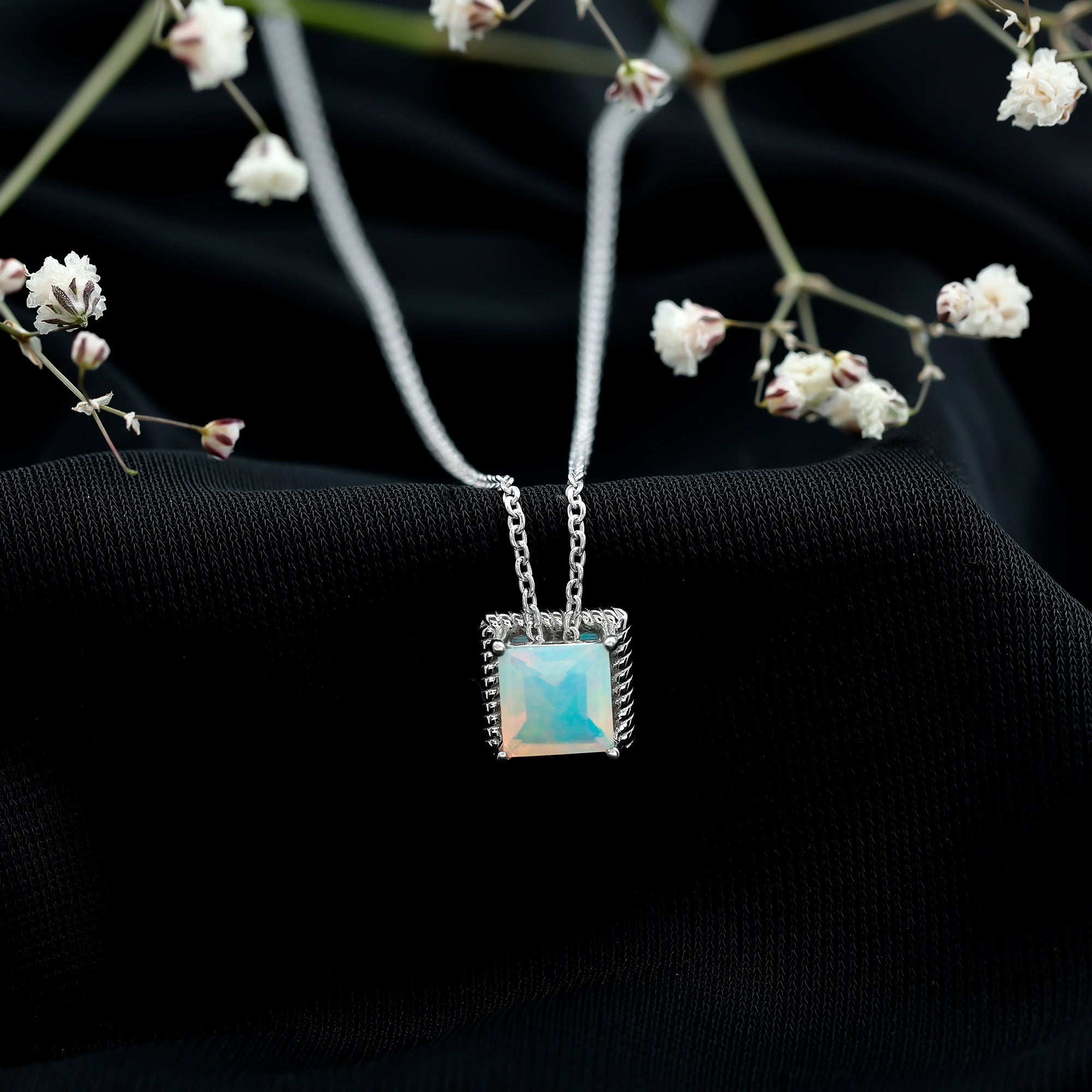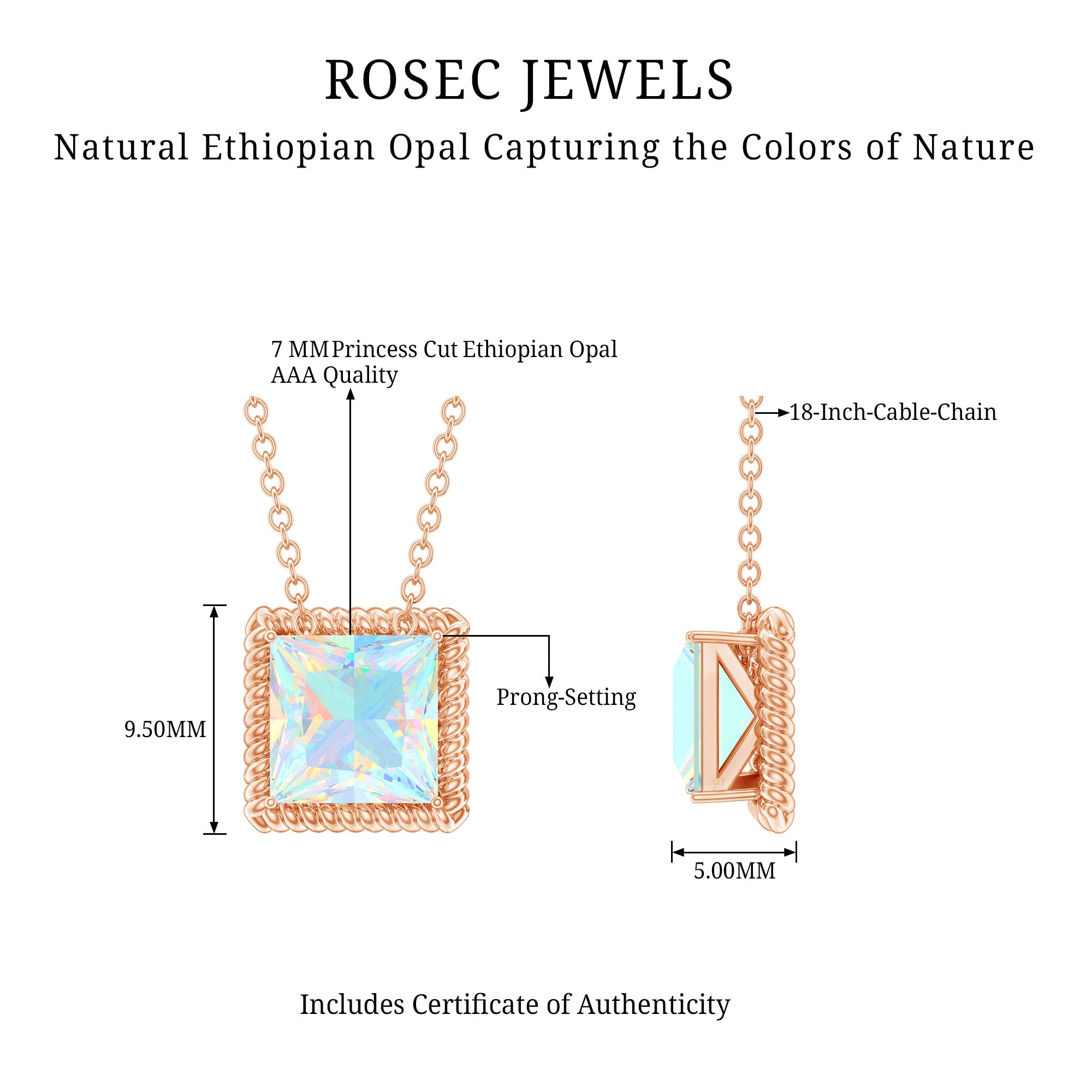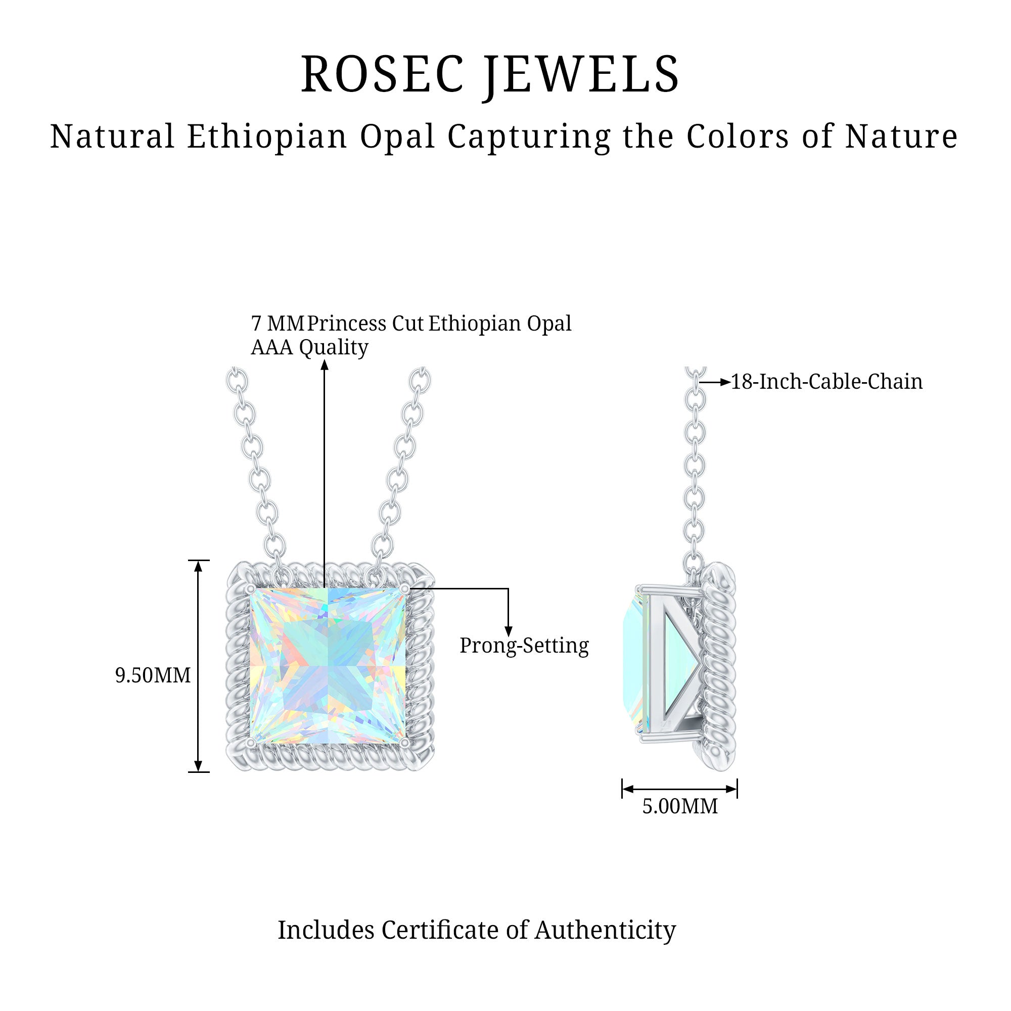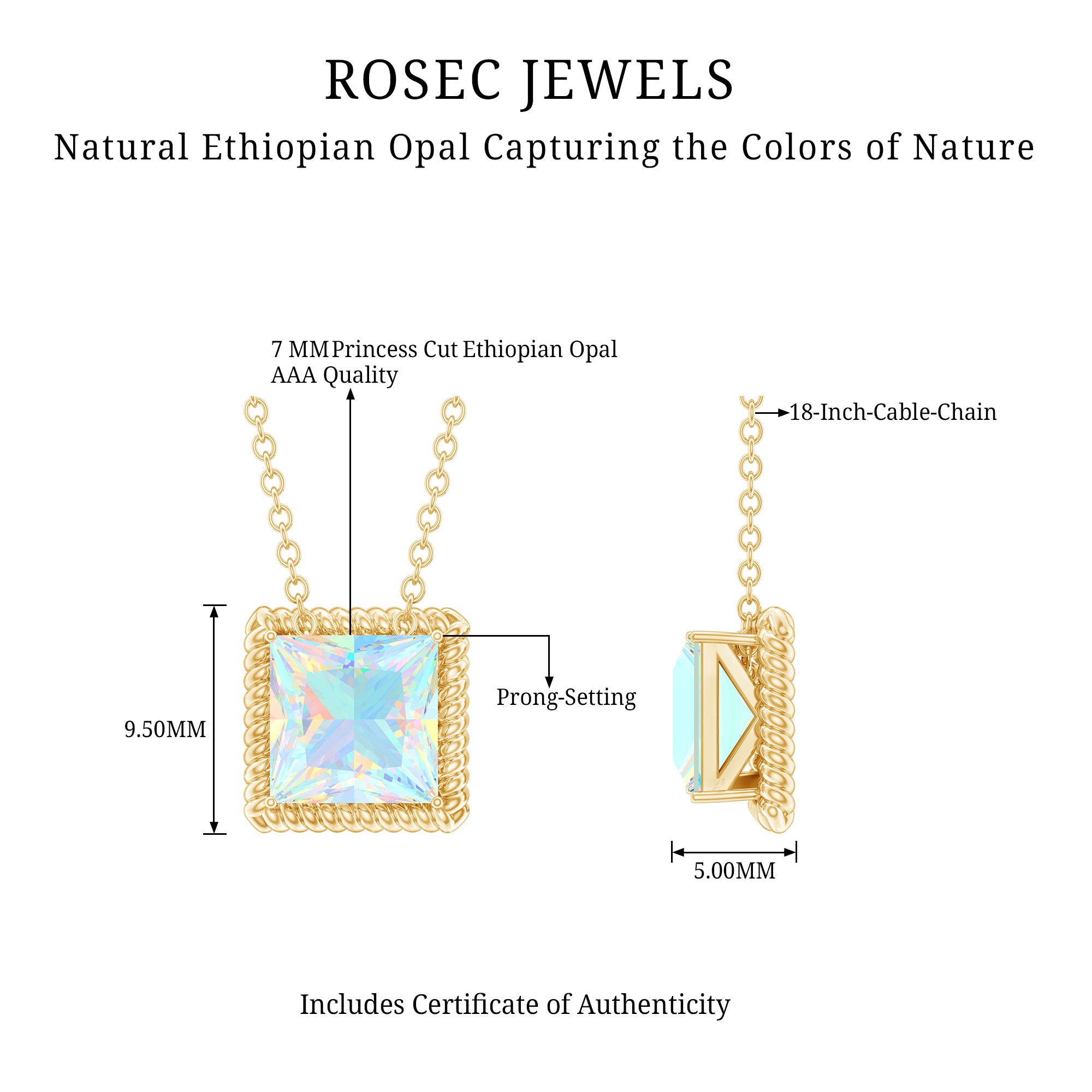 7 MM Princess Cut Ethiopian Opal Solitaire Pendant with Rope Frame Details