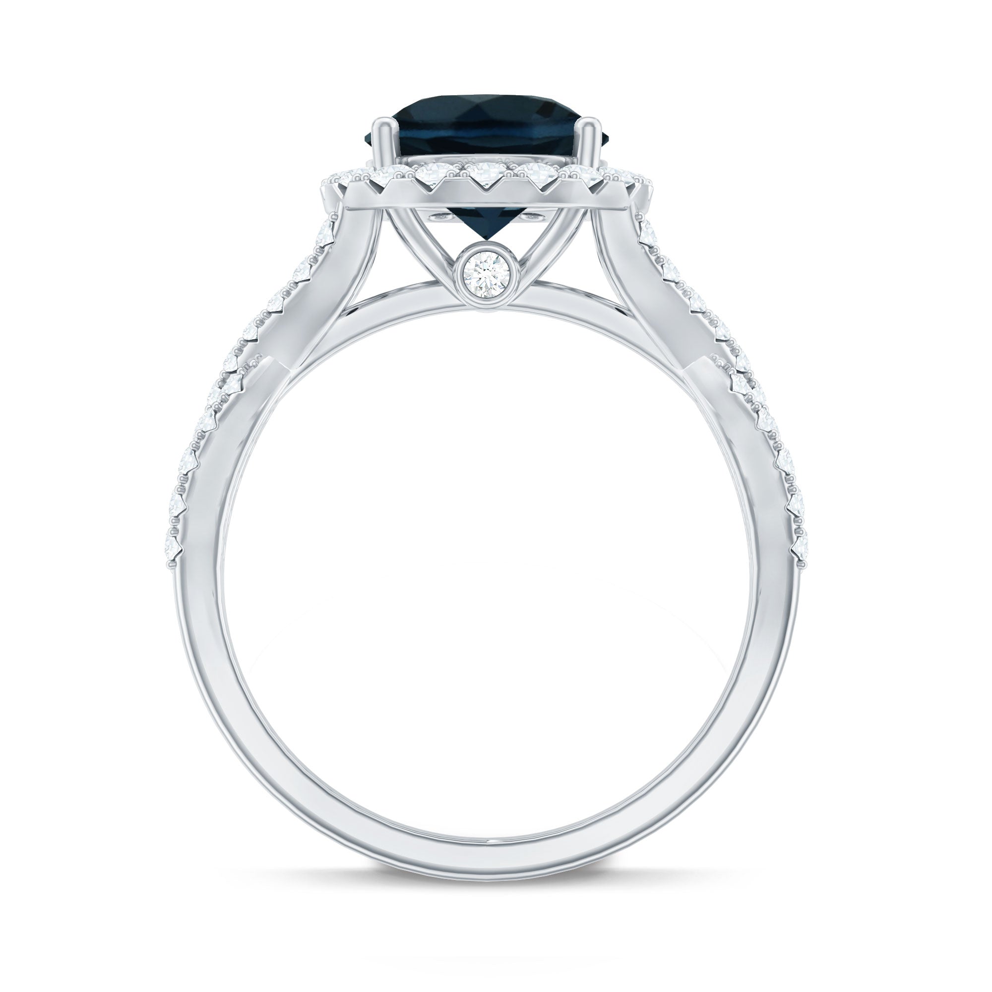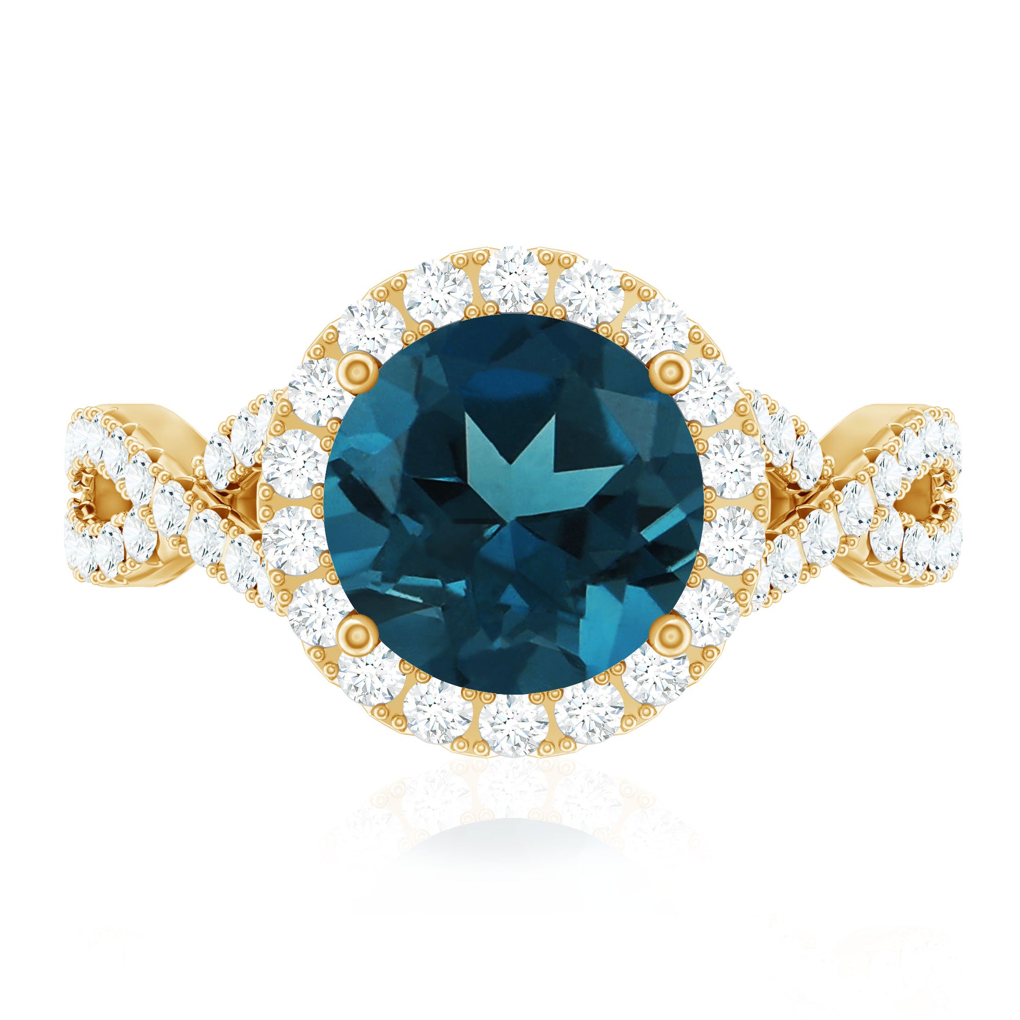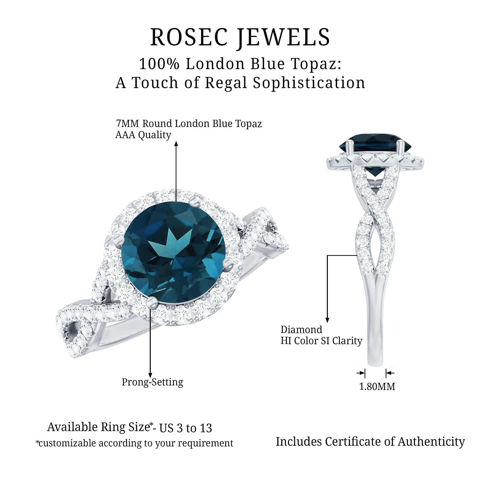 7mm Round London Blue Topaz Crossover Engagement Ring with Diamond Halo