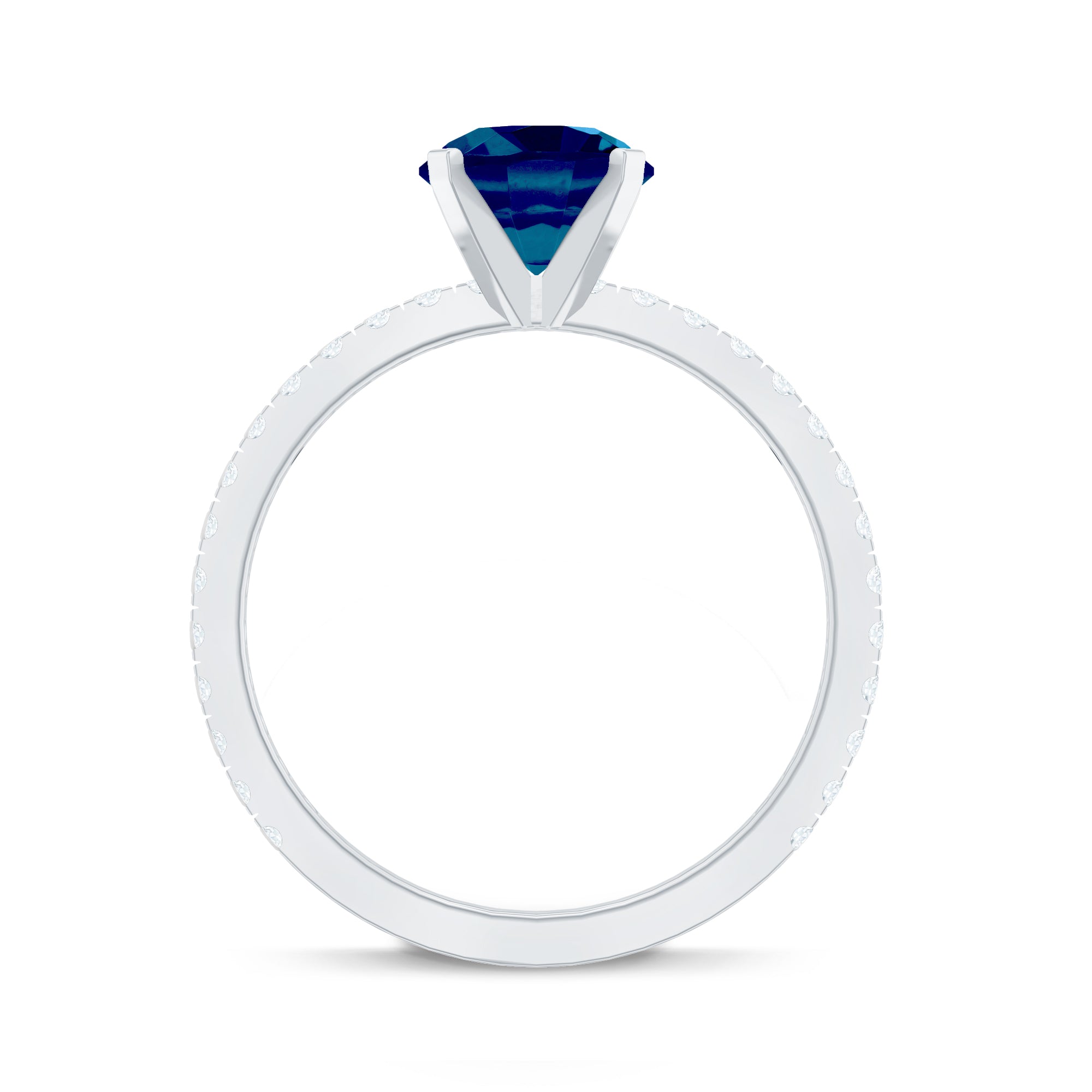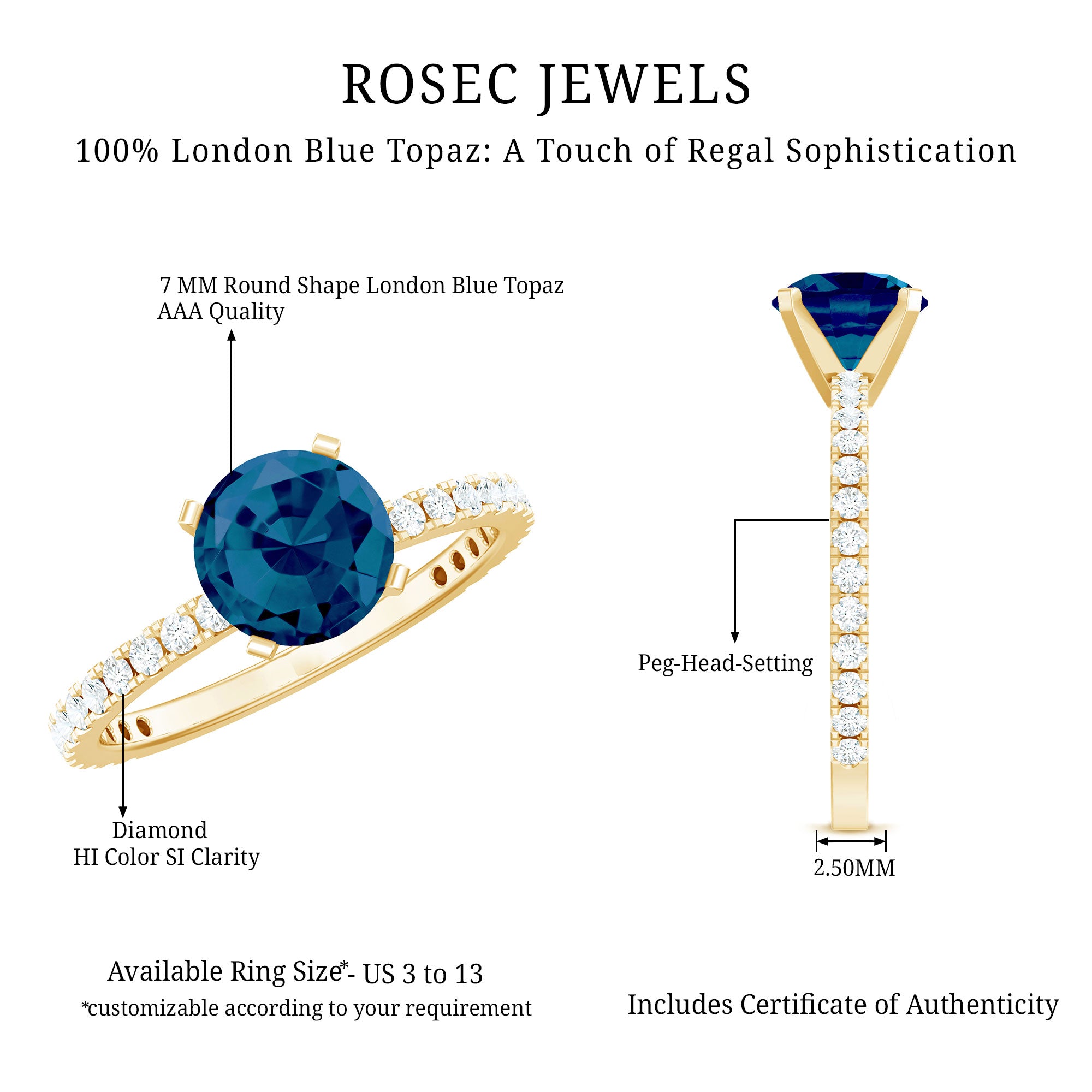 7mm Round London Blue Topaz Solitaire Ring with Diamond Side Stones