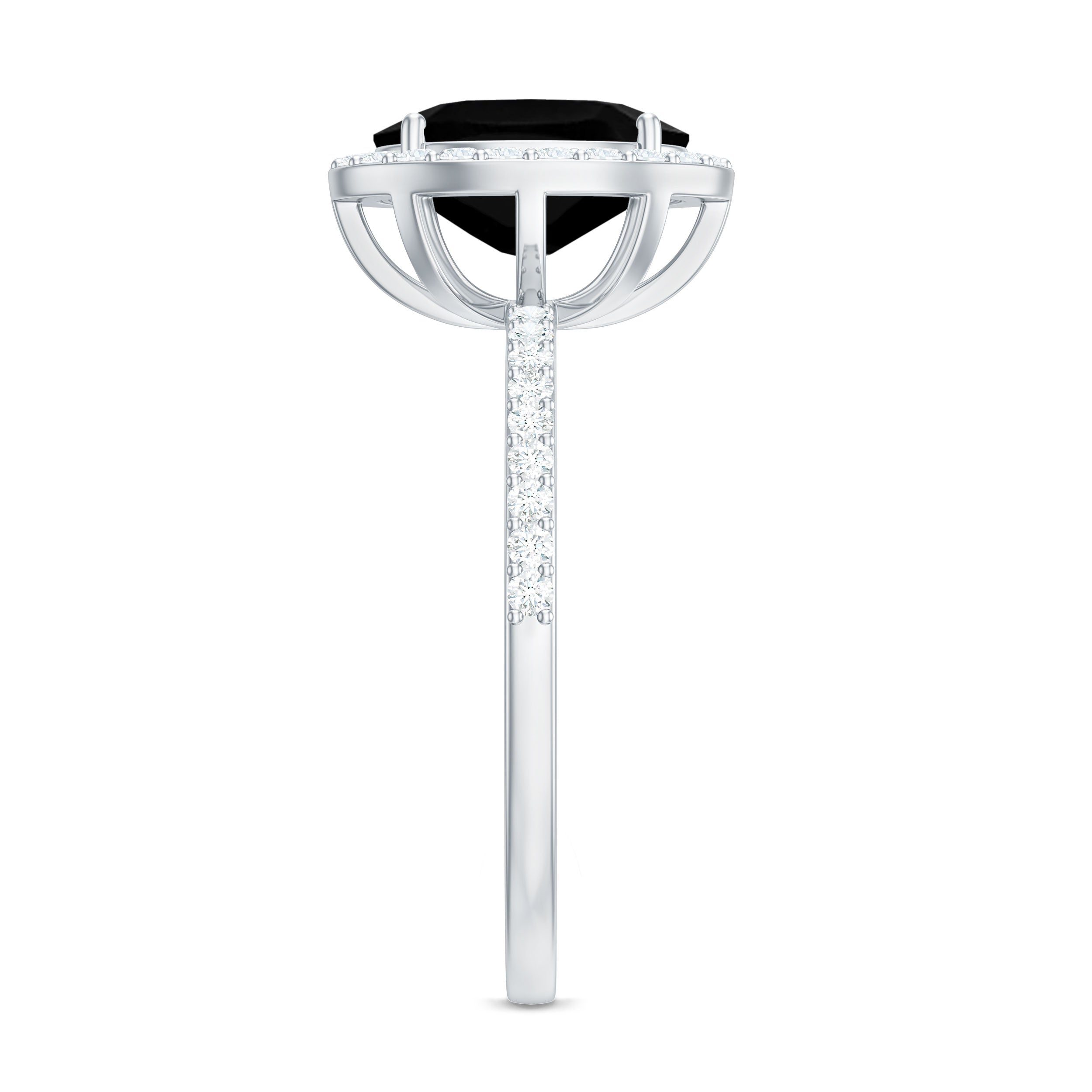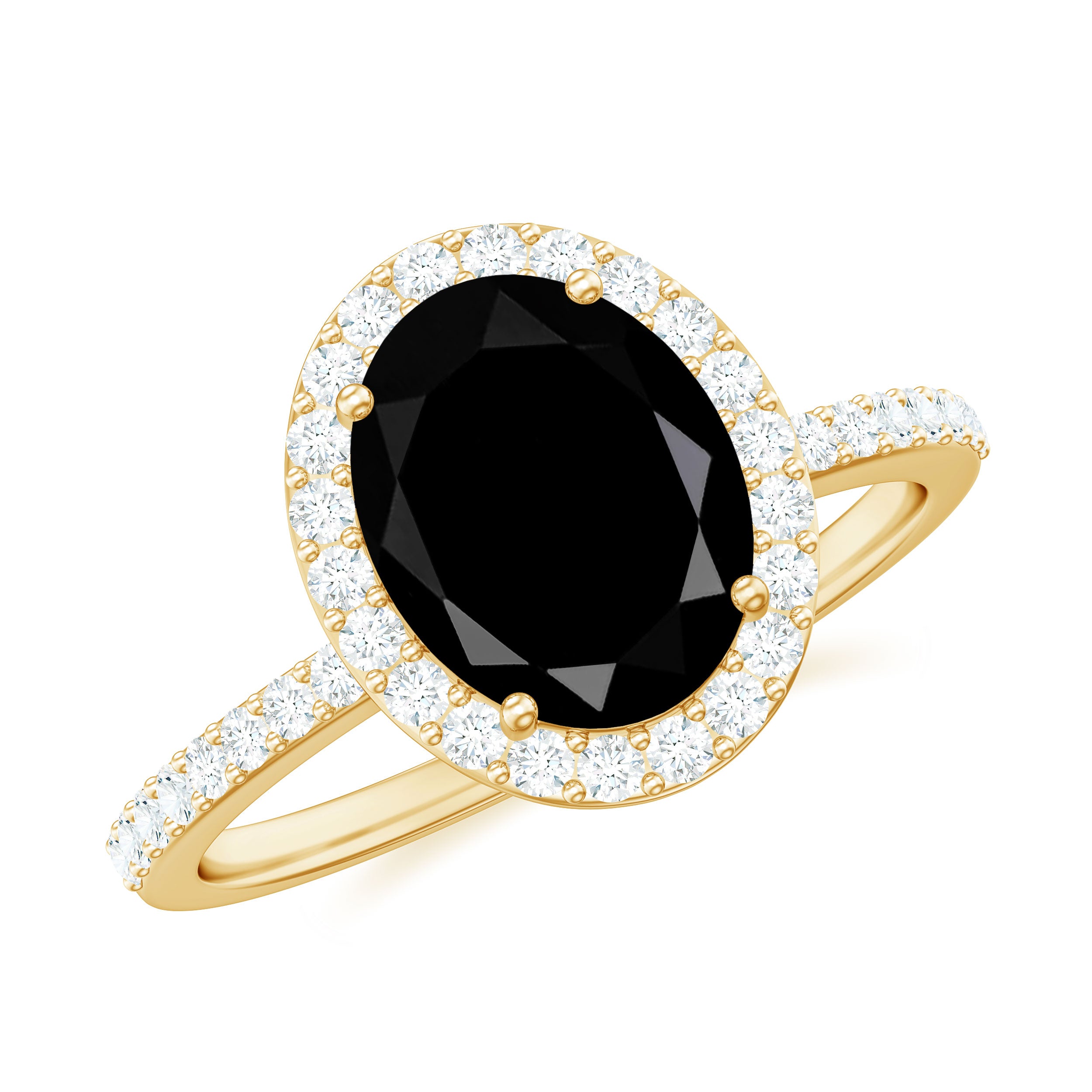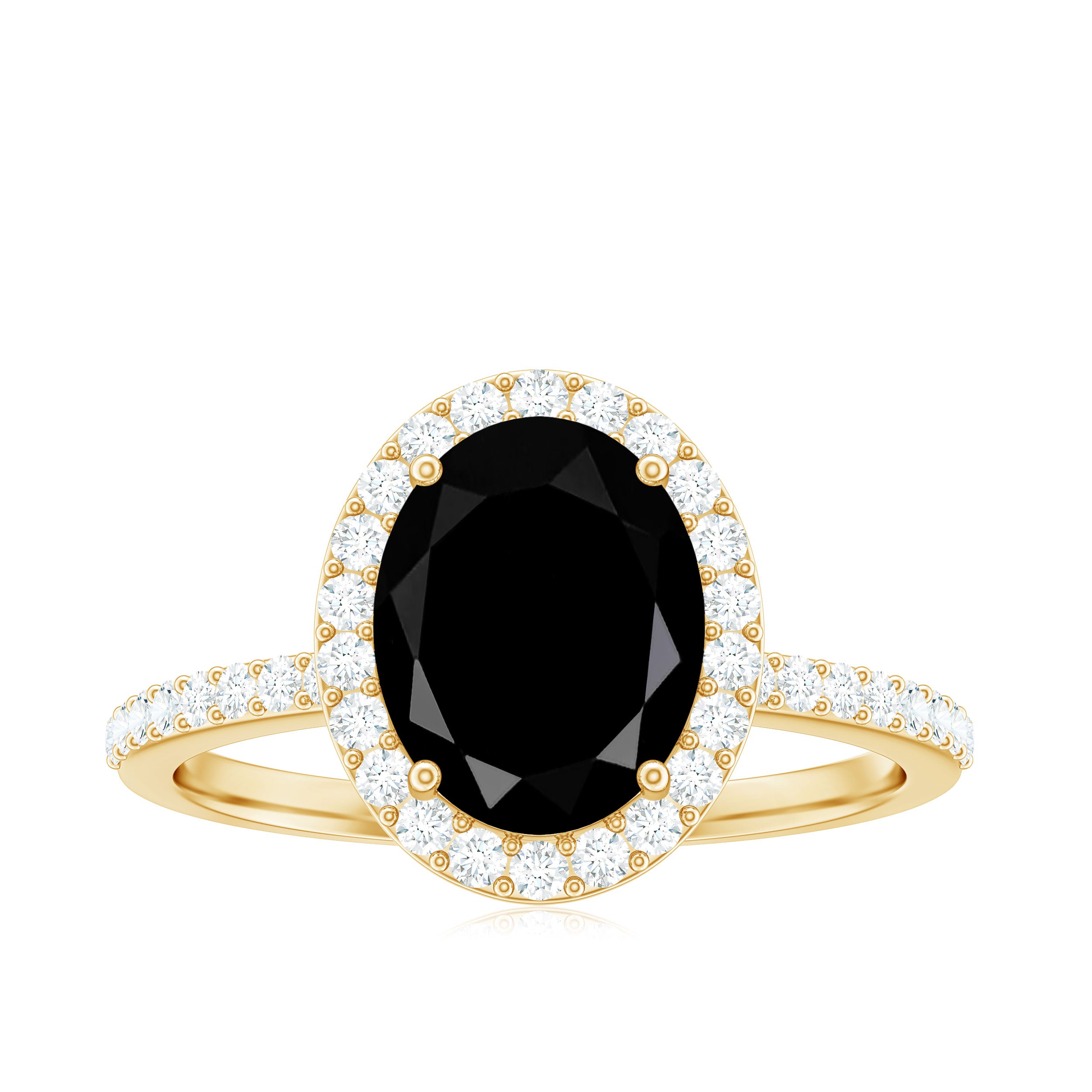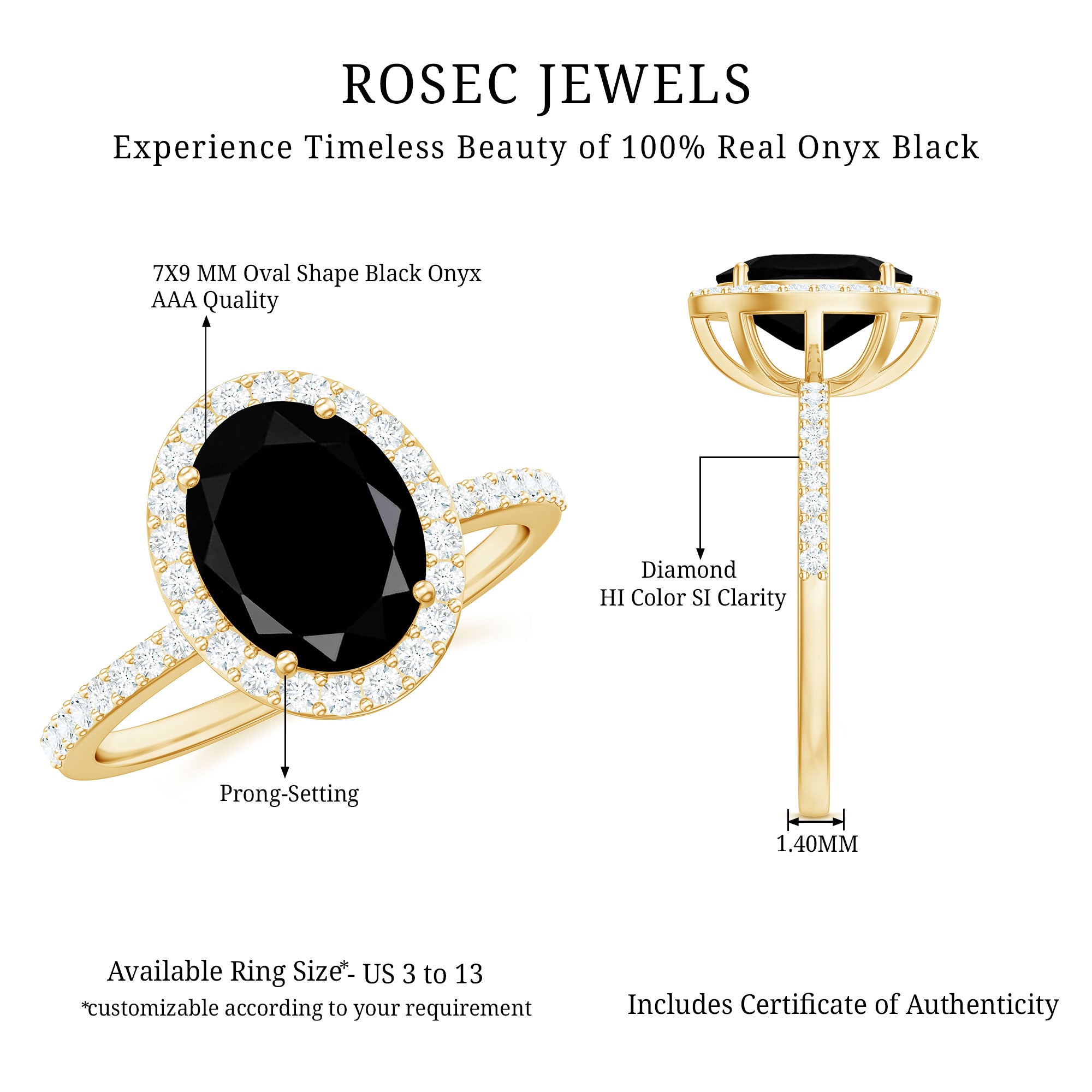 If you are looking for a ring that captures contemporary style, significance, and a hint of sparkle, this Halo Engagement Ring is an excellent option. At its core is a breathtaking 7X9 MM Oval Cut Black Onyx, beautifully set in a Prong Setting and surrounded by a diamond halo that exudes brilliance. What sets this Natural Black Onyx Ring apart is its unique oblong design, adorned with shimmering Round Shape Diamond stones. The blend of the shimmering diamond side stones and halo creates a look that is both unique and timeless, achieving a perfect harmony between boldness and elegance. The gemstones have been certified and subjected to rigorous quality assessments. This Halo Ring is ideal for those who appreciate a fusion of traditional and modern design elements. Available in US sizes 3 to 13, this Oval Engagement Ring is designed to provide an impeccable fit and comfort for everyday wear. Whether you are contemplating a proposal or gifting it as a cherished present, it is presented in a stunning jewelry box, ready to leave a lasting impression.