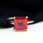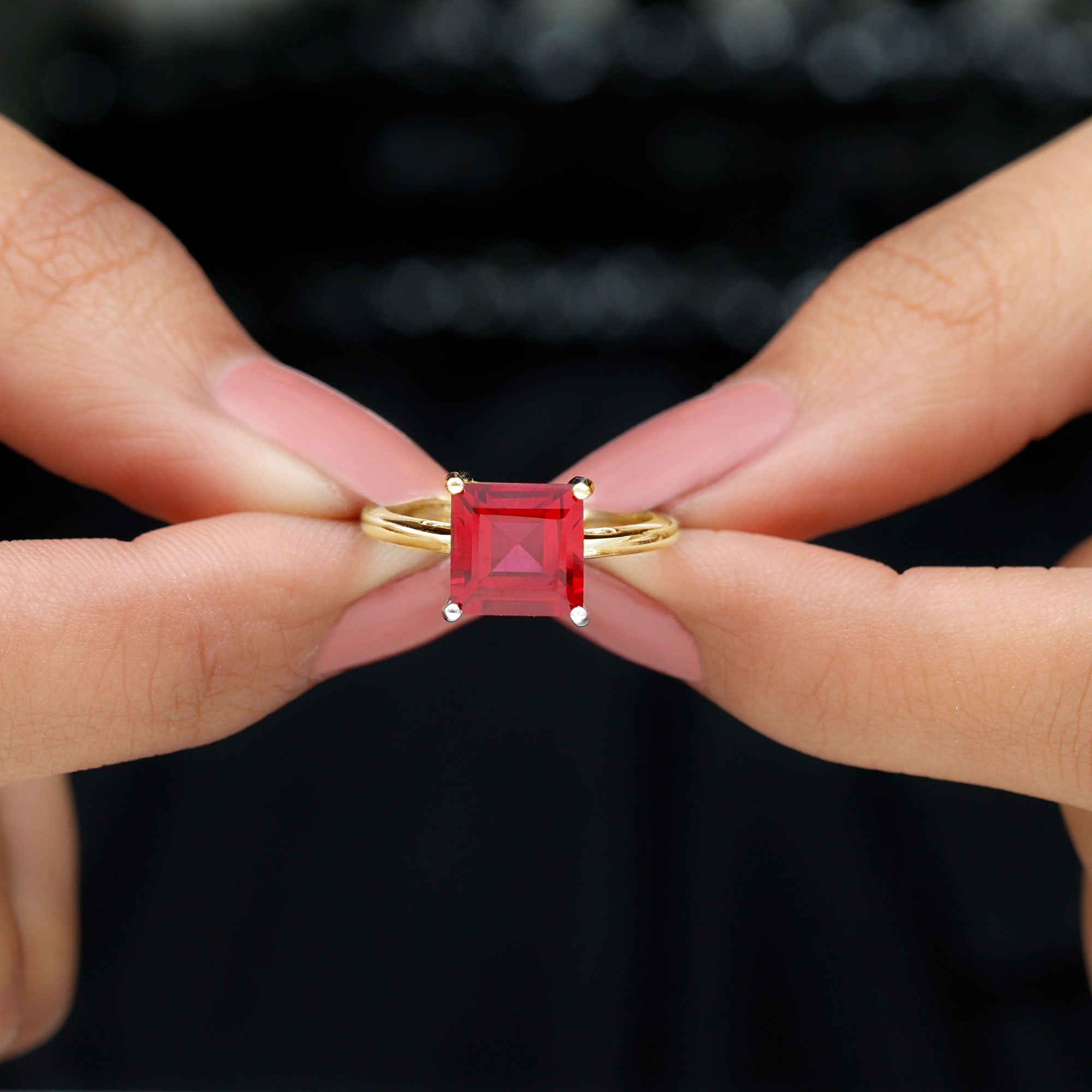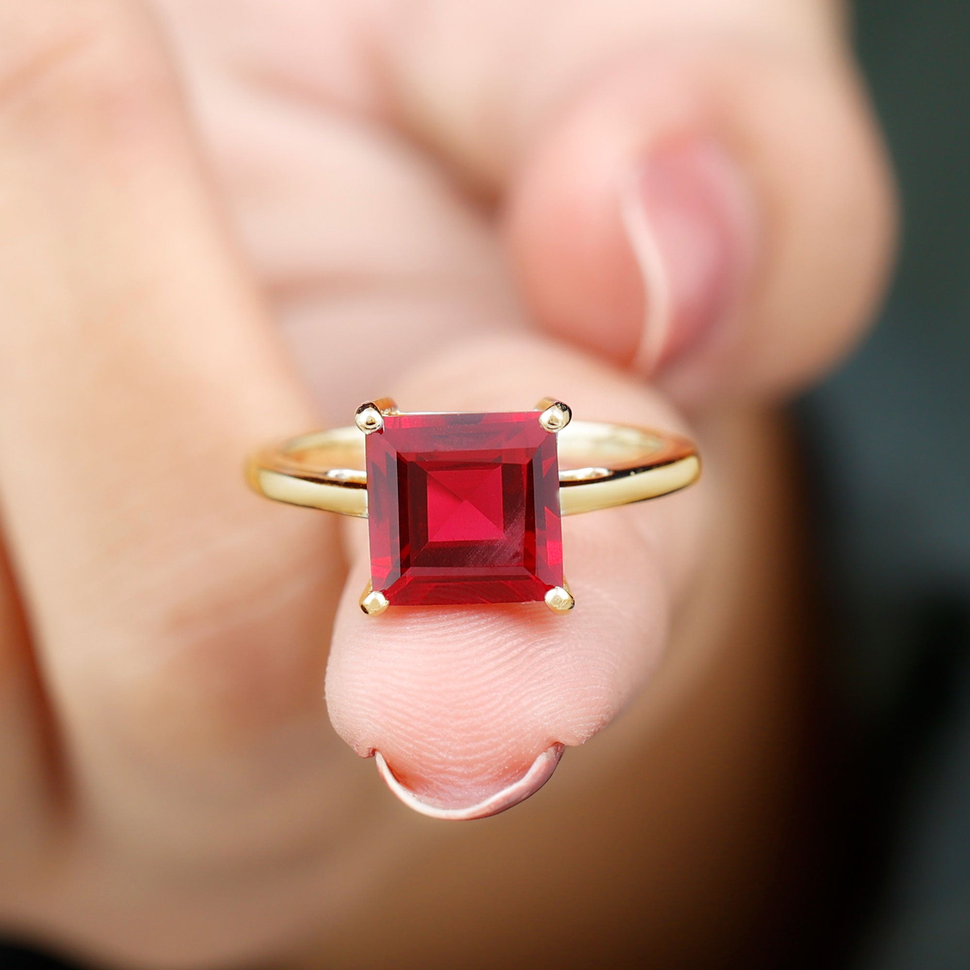 Unique Solitaire Ring is encased with sparkling 8.00 MM Princess Cut Created Ruby is set at the center in a prong setting. This Simple Engagement Ring is composed of Solid Gold, a perfect ring for your Love.