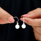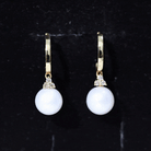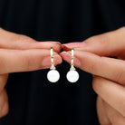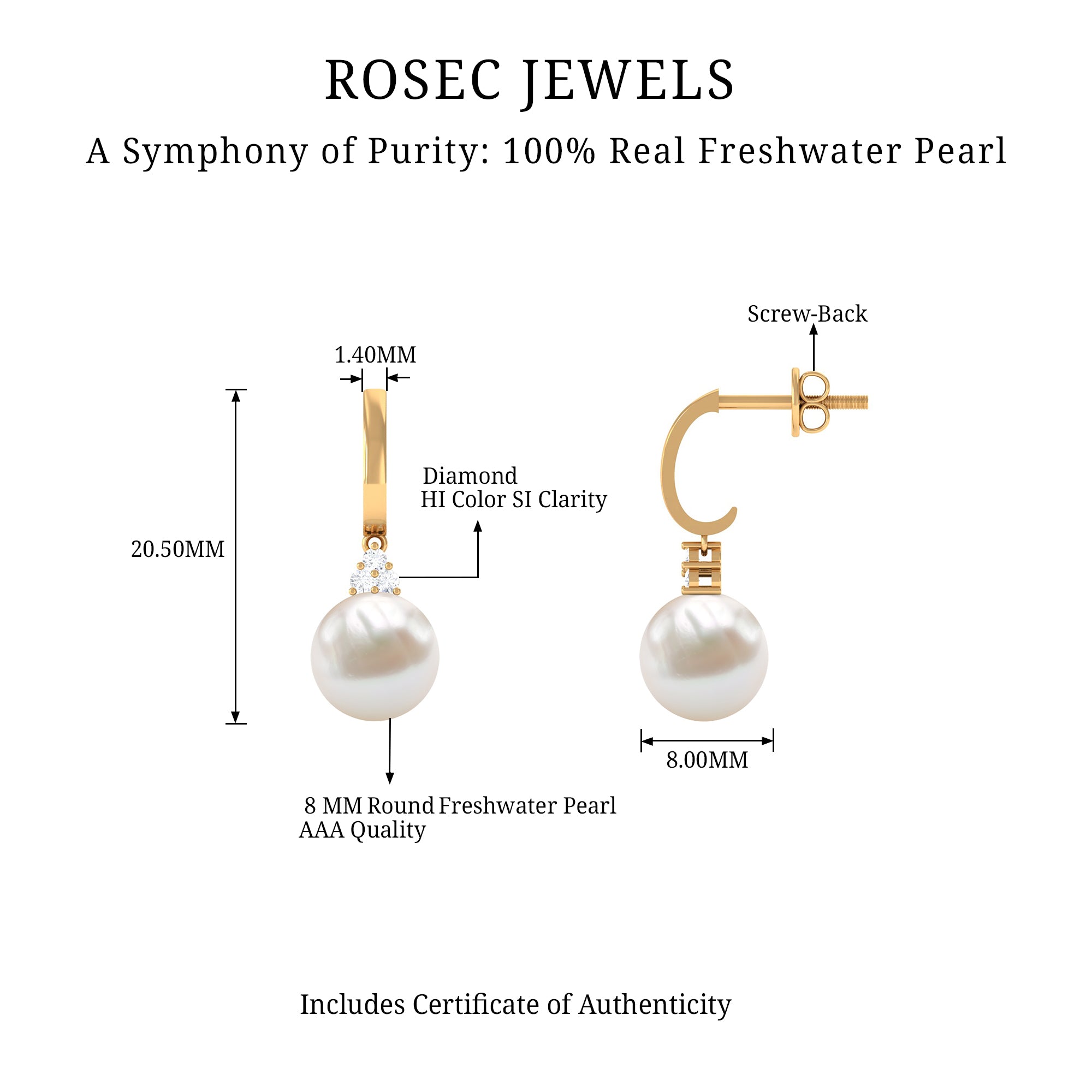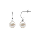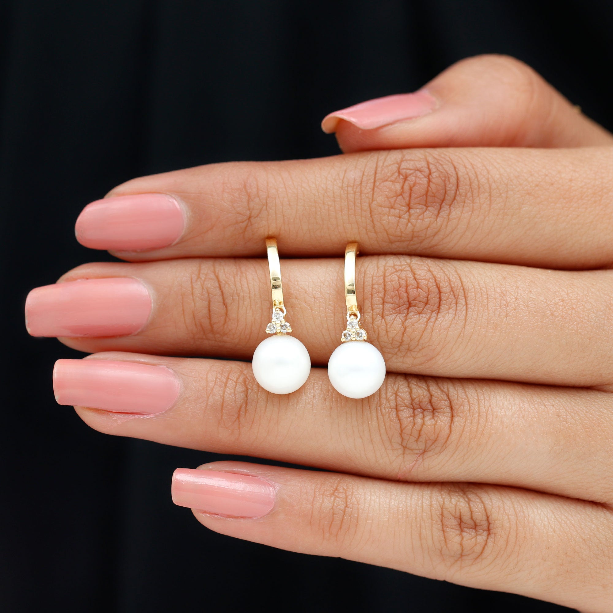 The Hoop Earrings feature Prong Set Round Diamond Trio and 8 MM Round Shape Freshwater Pearl in Bead Setting as Solitaire. The Wedding Hoop Earrings are a perfect Wedding Day gift for your beloved.