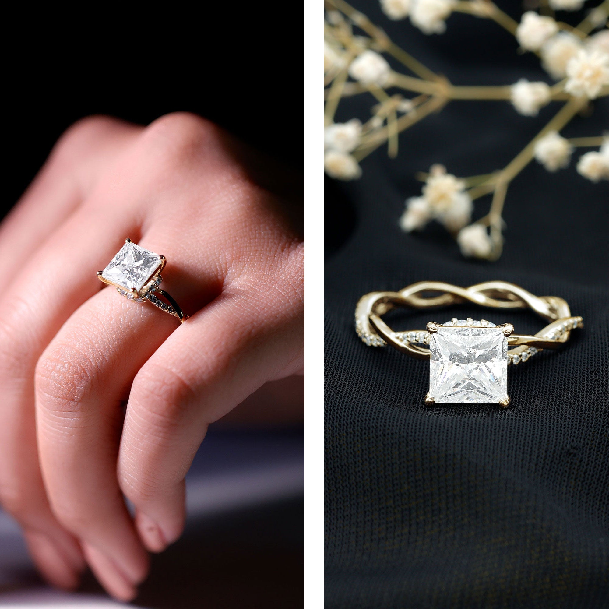 Promise her an eternity of togetherness with a Moissanite Solitaire Ring. The Single Stone of 8 MM Princess Cut Moissanite takes all the Center Stage in this design. It is defined beautifully by the side-stones of Round Cut Moissanite, sparkling in a Unique Braided Shank. The Square Engagement Ring is the classic choice for your bride on a special day. Handcrafted with top notch metal, this Certified Moissanite Ring is any day a durable choice of accessory. This Moissanite Ring is designed by Rosec Jewels assuring the quality of the ring. This 3 Carat ring is shipped in a premium quality jewelry box with the certificate of gemstone authentication.