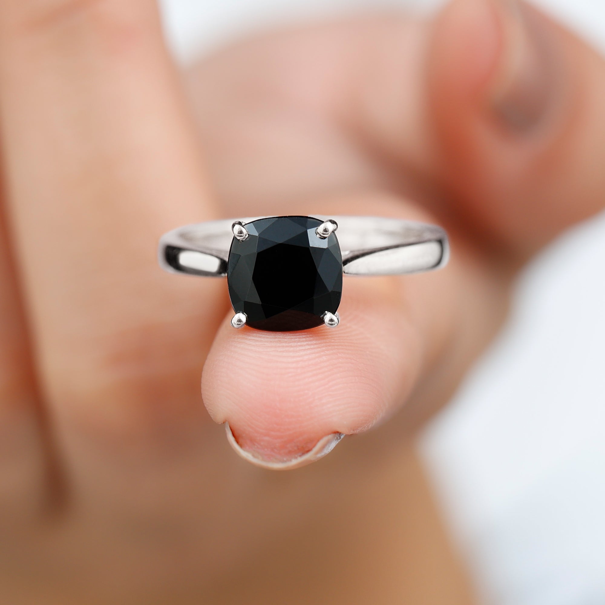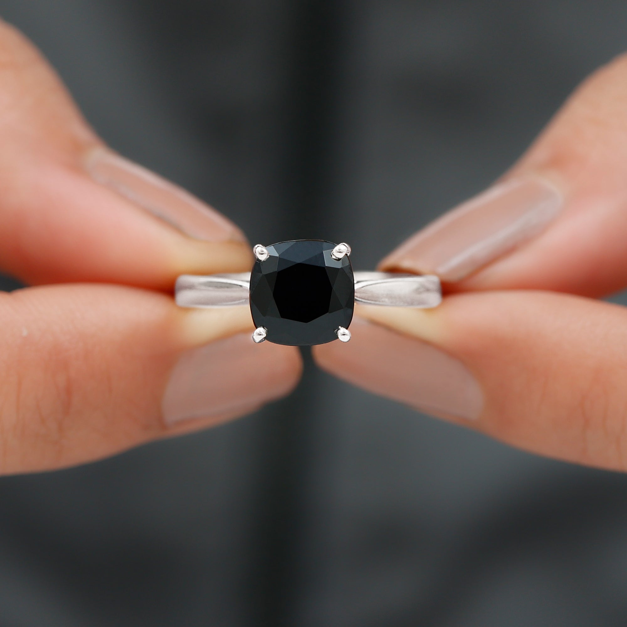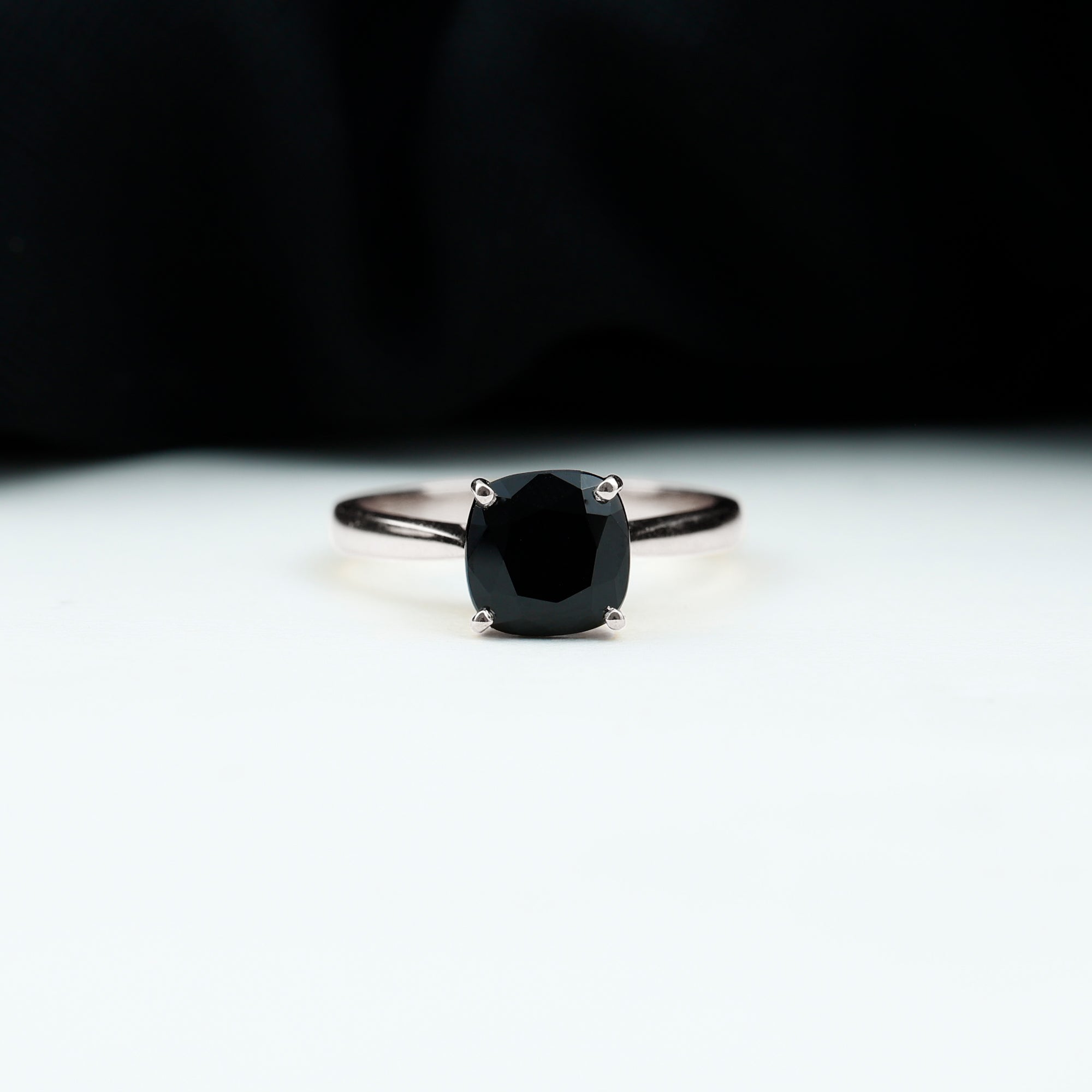 8 MM Cushion Cut Black Spinel Ring with Surprise Diamond